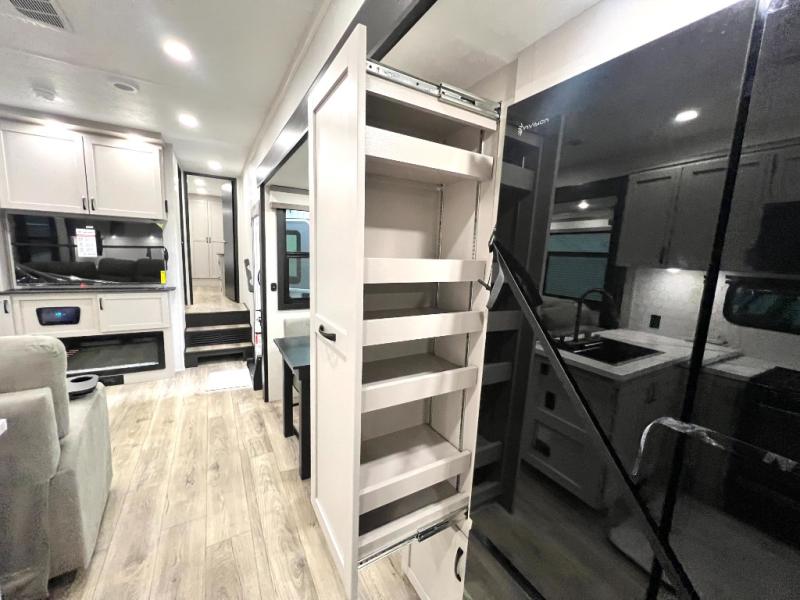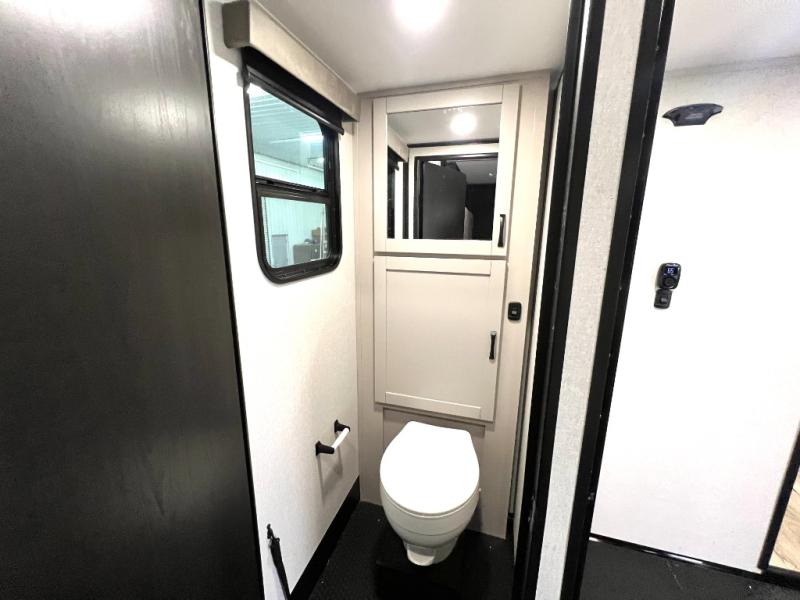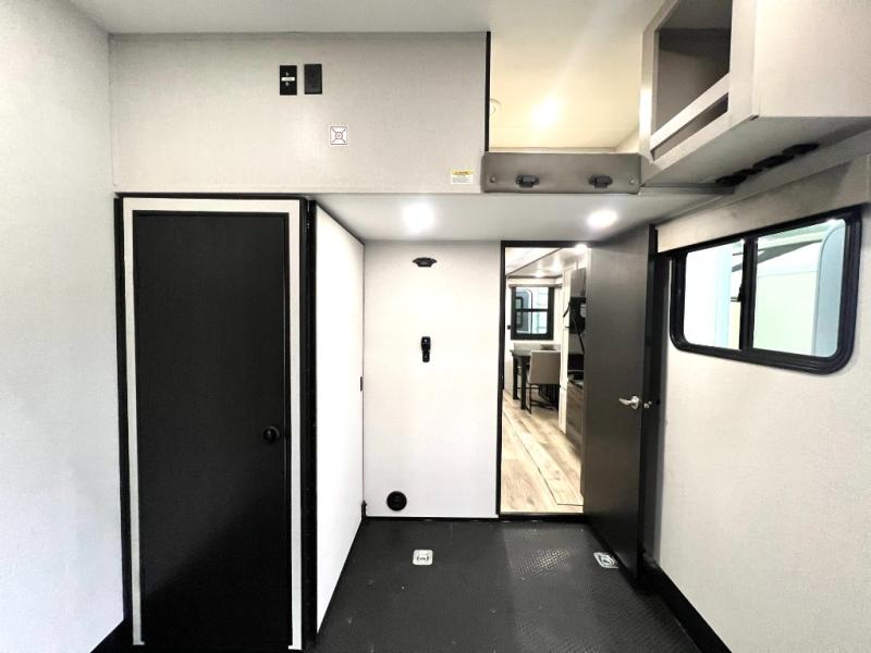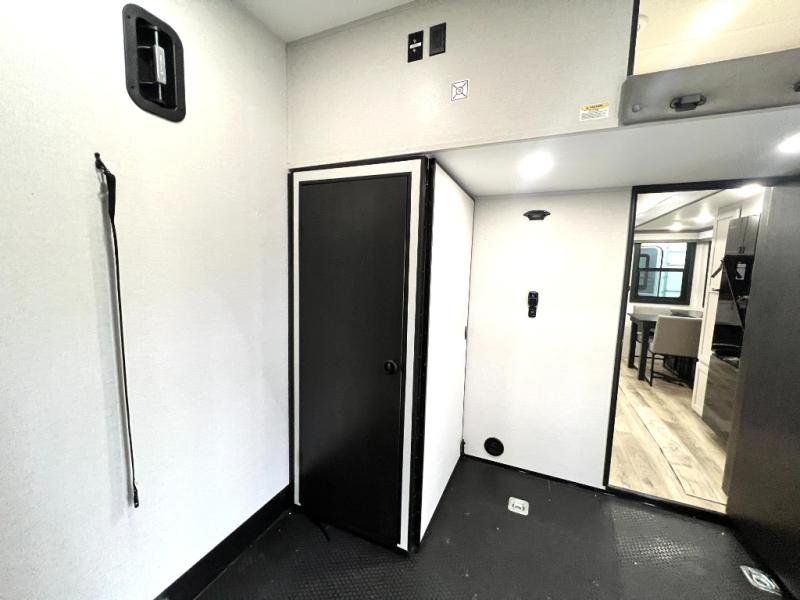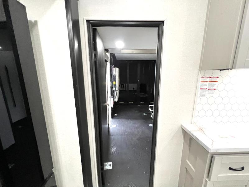 Get ready for outdoor adventures in this spacious toy hauler. Your guests will have the 13' 6" garage with queen bed with convertible sofa and a loft for added sleeping space, plus there is overhead storage for your things and a side man door to come and go easily. The main living area includes dual opposing slides with an L-shaped tri-fold sofa along the roadside and your roll-top table and refrigerator plus pantry in the curbside slide. Head up the steps to your front private bedroom with the dual entry bath accessible from the hall and inside the master bedroom. Here you will all enjoy a walk-in shower, toilet, and vanity with a sink, plus overhead storage. The bedroom features a third slide out housing a king bed for added floor space, plus a full front walk-in closet, a dresser, and washer/dryer prep!