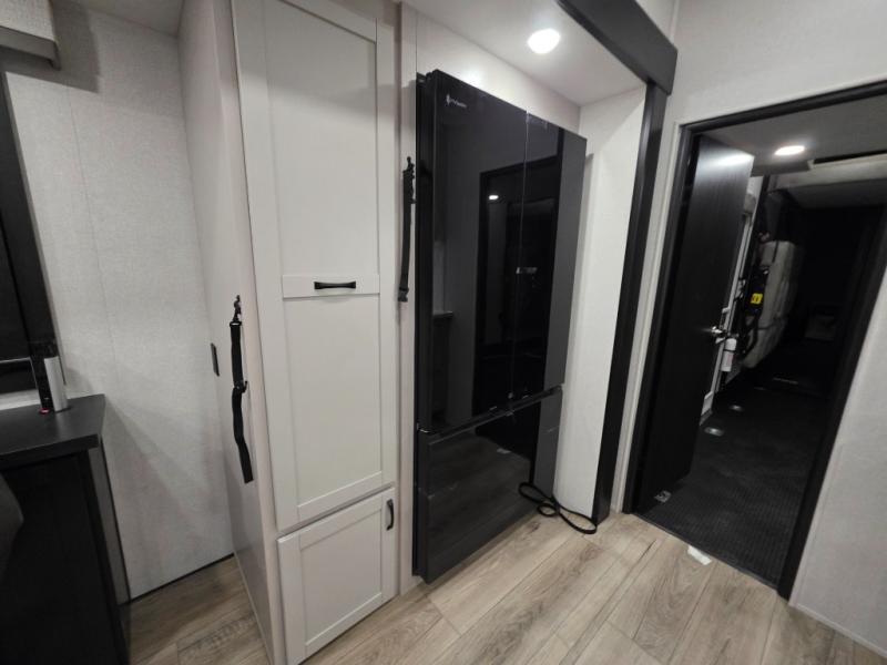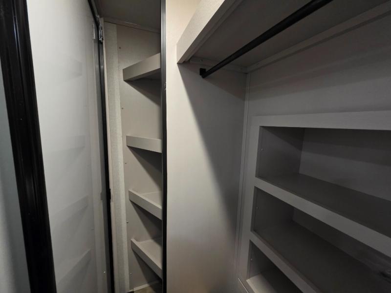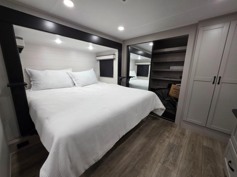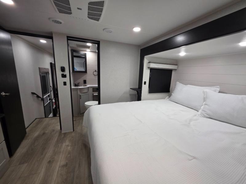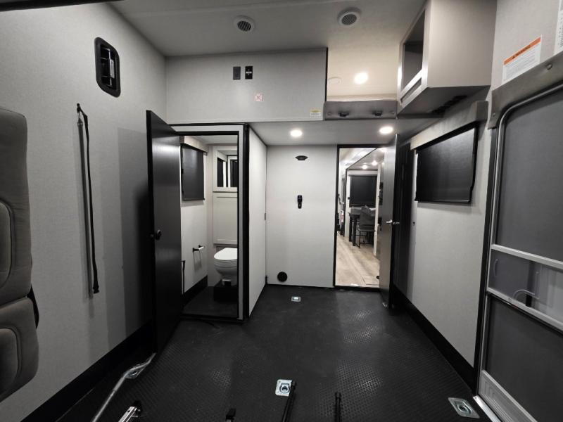 Get ready for outdoor adventures in this spacious toy hauler. Your guests will have the 13' 6" garage with queen bed with convertible sofa and a loft for added sleeping space, plus there is overhead storage for your things and a side man door to come and go easily. The main living area includes dual opposing slides with an L-shaped tri-fold sofa along the roadside and your roll-top table and refrigerator plus pantry in the curbside slide. Head up the steps to your front private bedroom with the dual entry bath accessible from the hall and inside the master bedroom. Here you will all enjoy a walk-in shower, toilet, and vanity with a sink, plus overhead storage. The bedroom features a third slide out housing a king bed for added floor space, plus a full front walk-in closet, a dresser, and washer/dryer prep!