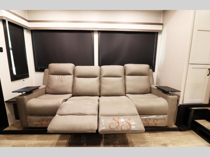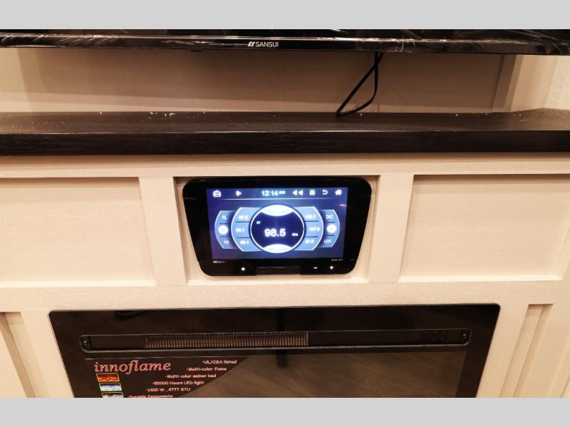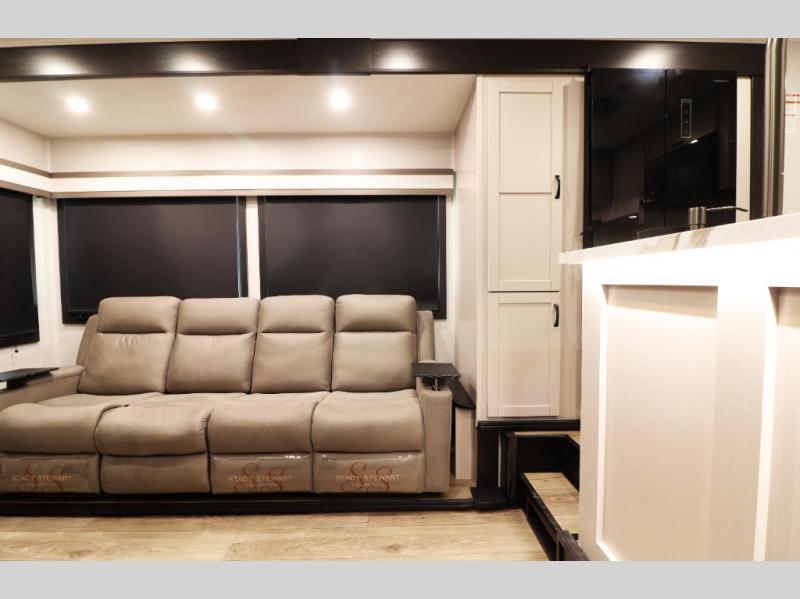 Main living area includes a large slide-out with plush sofa, entertainment center with 50? 4K Smart LED TV, touch-screen Bluetooth stereo, and keyed-alike locking system for convenience.