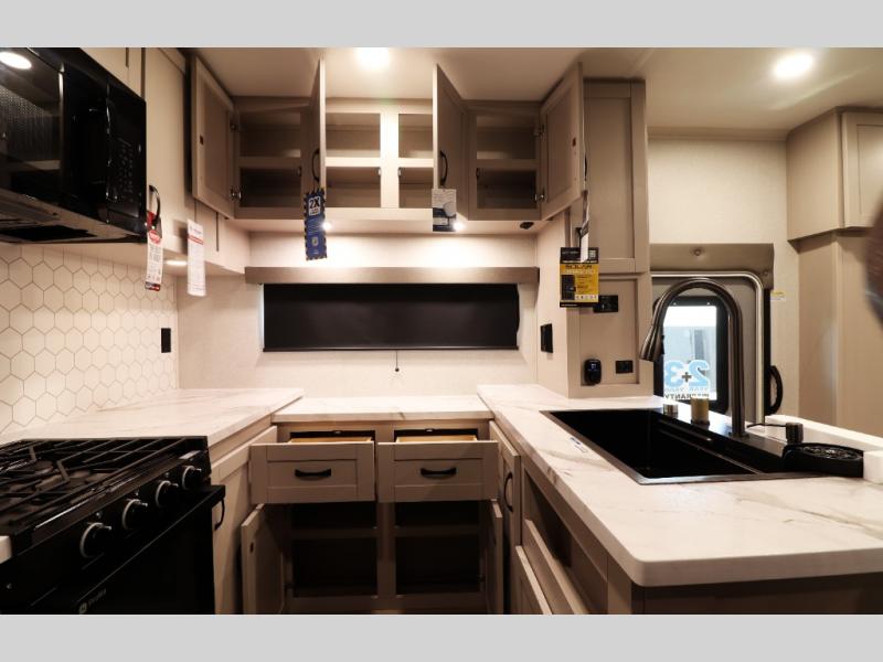Kitchen features U-shaped counter, 17?cu?ft 12-volt refrigerator, residential oven with 3-burner cooktop, pull-out faucet, and under-bed storage in bedroom.