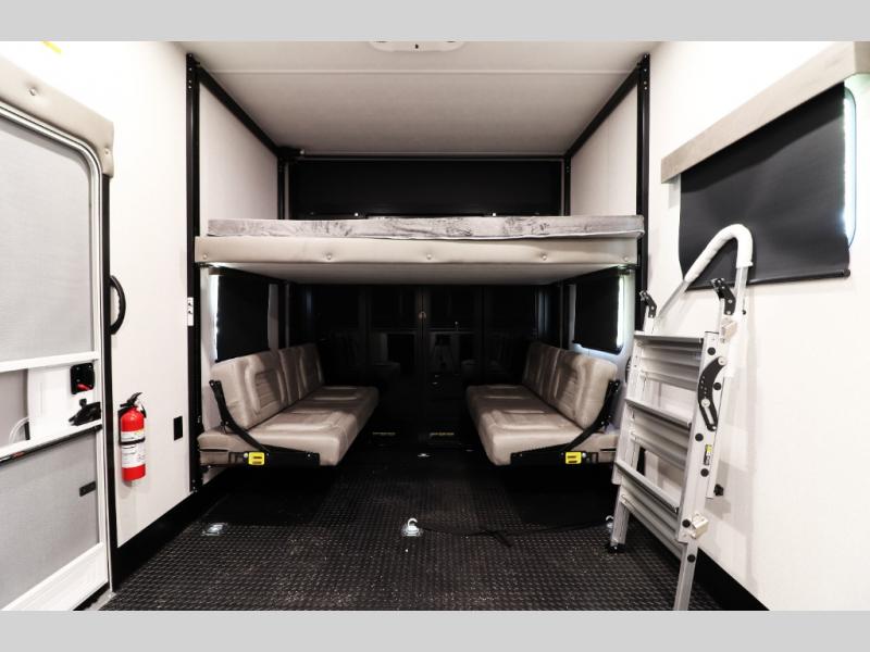 Sleeps up to 8 with a 13' garage featuring convertible sofas with electric queen bed and overhead storage, plus a loft bunk or storage area.