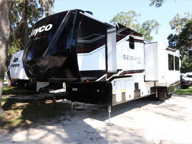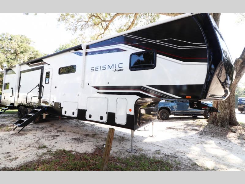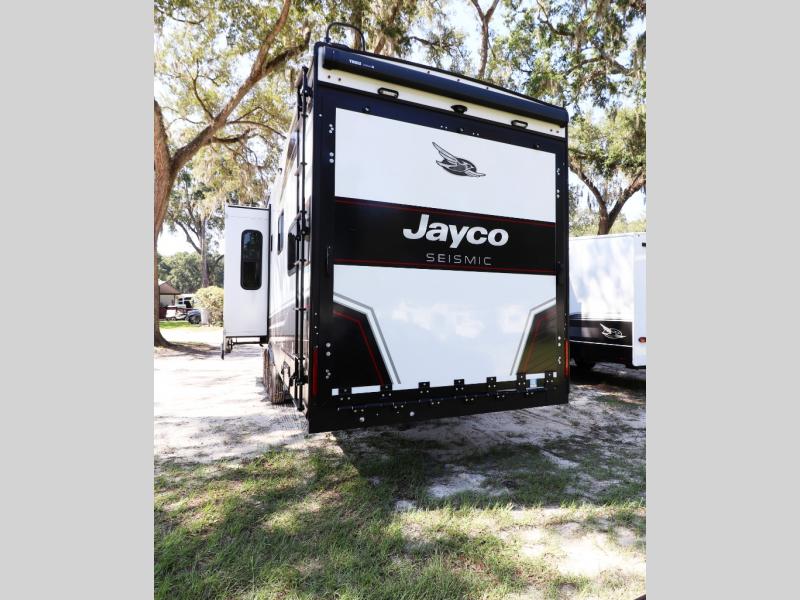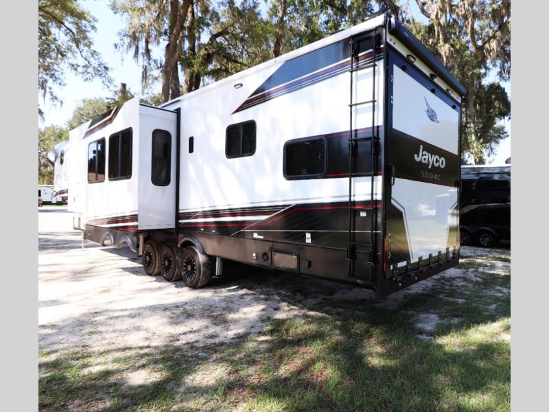 Unleash luxury and adventure with the 2026 Jayco Seismic 413—13' garage, king bed, triple awnings, solar-ready tech, and party deck for ultimate off-grid fun and comfort!