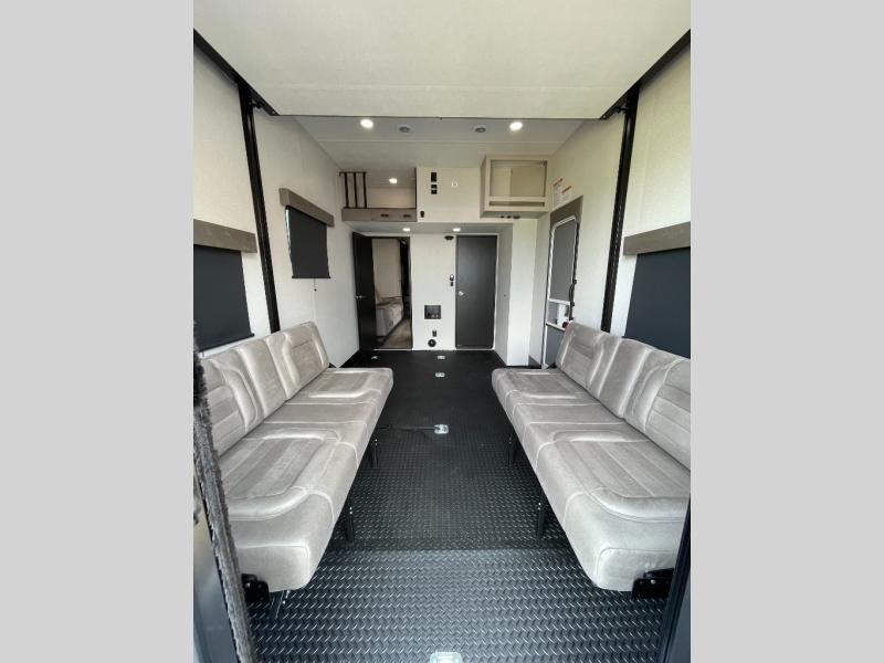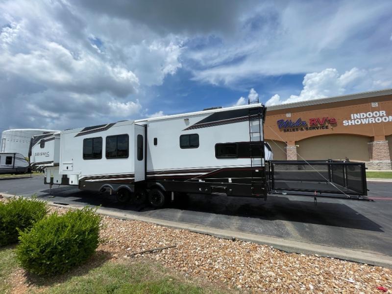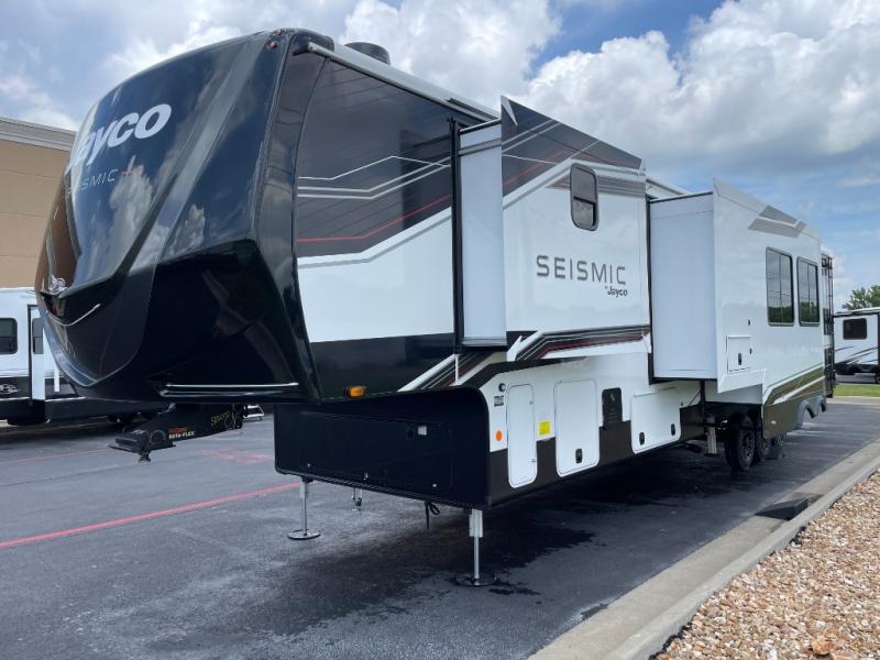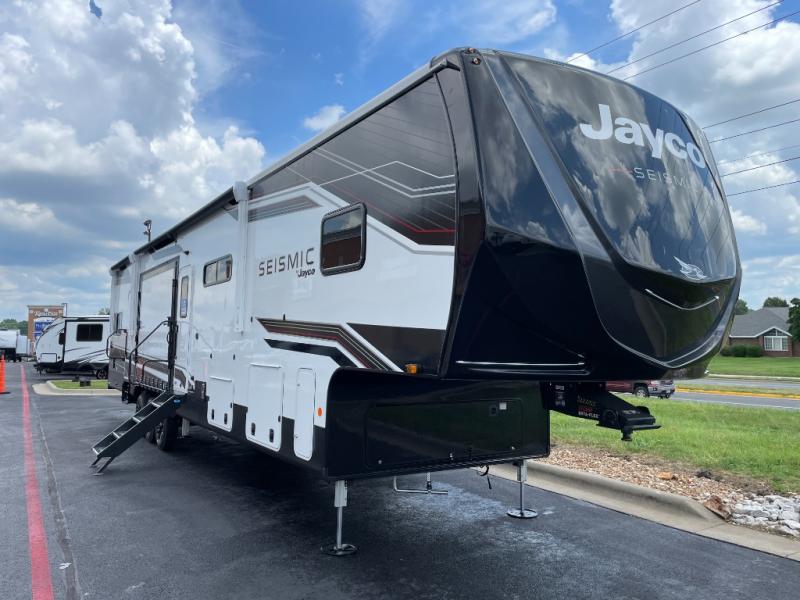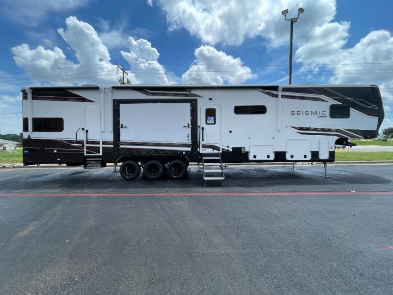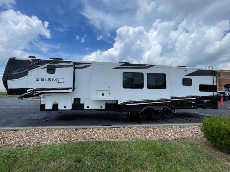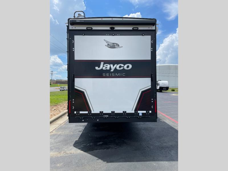 One look at the Seismic toy haulers by Jayco, and you'll never go back! Each model features a custom automotive-grade vinyl exterior graphics package, a painted fiberglass front cap with built-in LED lighting, and 102" wide-body structural steel I-beam construction. You'll find the pass-through storage with Slam-Latch baggage doors will make unpacking easier than ever, and the rear ramp door/patio with anti-slip, non-skid flooring will allow you to unload your toys with no trouble at all. These toy haulers feature a three seasons garage wall/doors, a 30 gallon fuel tank with a timer, and exterior marine-grade speakers to keep the party going. The Climate Shield zero degree tested weather protection includes a 35,000 BTU furnace, PEX plumbing, and a fully enclosed and heated underbelly so you can enjoy your adventures year around. And we haven't even touched on the interior luxuries you'll find, like solid hardwood cabinet doors, residential vinyl flooring made in the USA, night shades, and more!