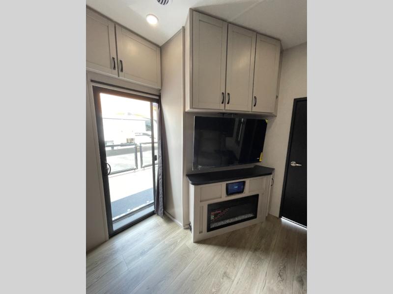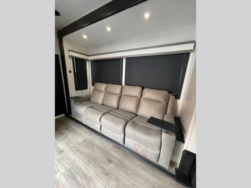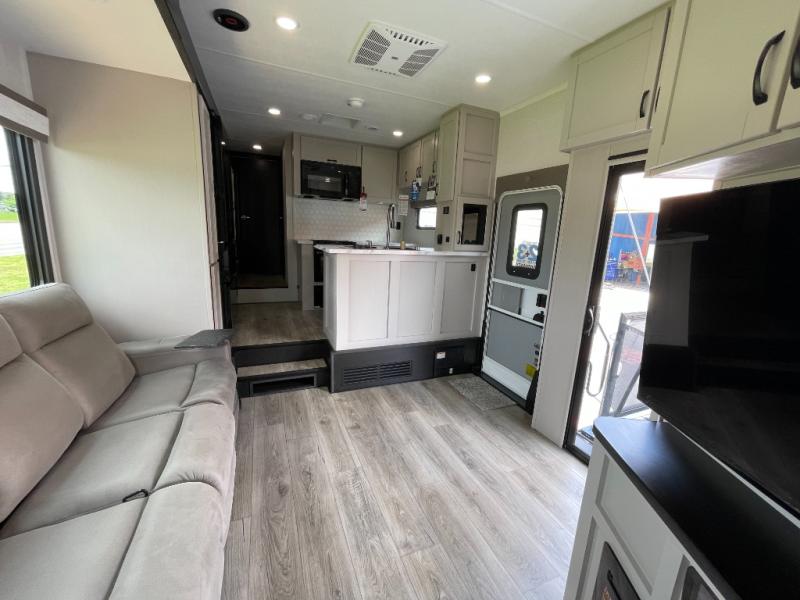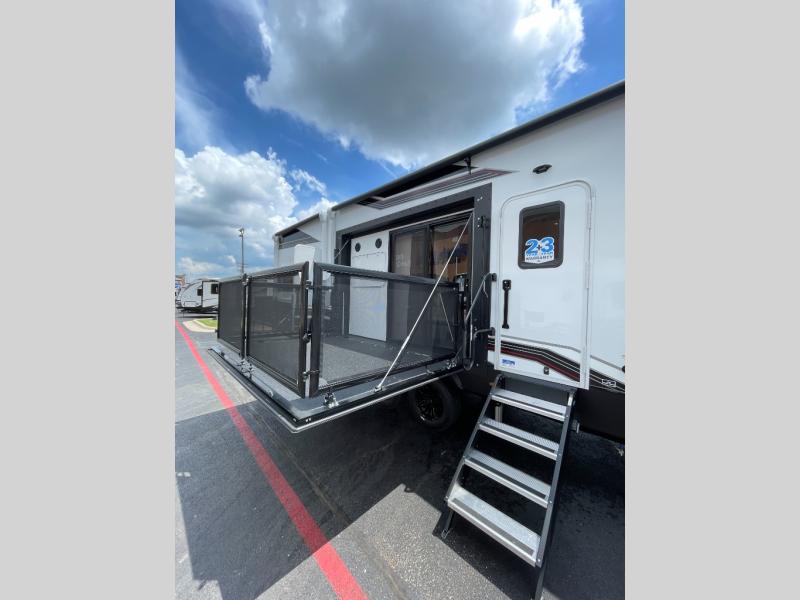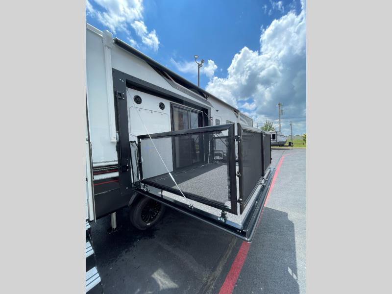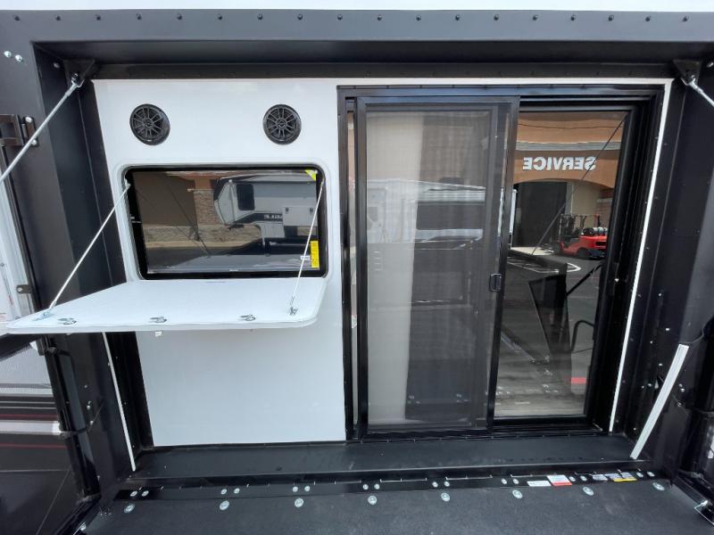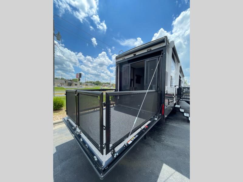 Get ready for outdoor adventures in this spacious toy hauler. Your guests will have the 13' separate garage area with its own half bath, a queen bed with rear convertible sofas, plus a loft for more sleeping or storage space. The main living area includes a large slide out for added space, and here you can relax on the sofa that sits across from the entertainment center with a 50" TV. The chef will love the U-shaped kitchen counter, 17 cu. ft. 12V refrigerator, and residential oven with a three burner cooktop. Up front, the private bedroom includes a king bed with a queen bed option, a slide out with dual wardrobes and a dresser, and quick access to the dual entry full bath! The exterior is just as accommodating with its 40" exterior TV, rear party deck and side patio party deck, and triple awnings for ample protection against the sun!