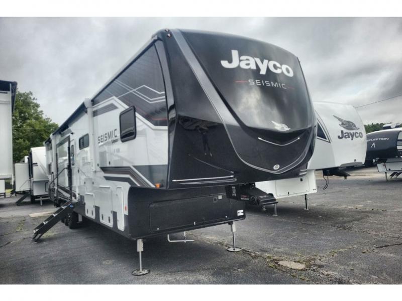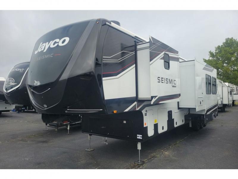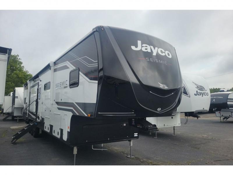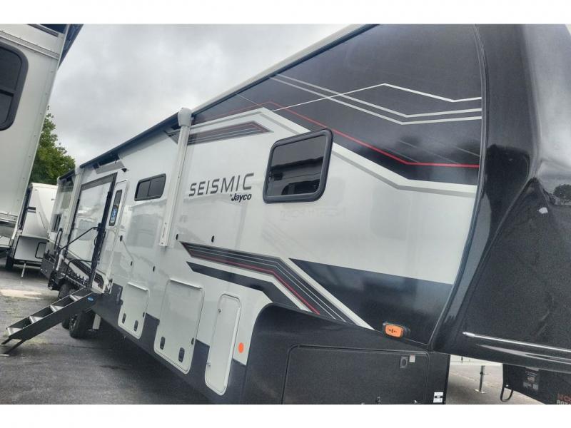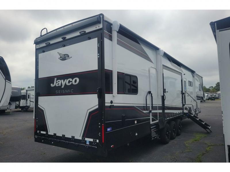 One look at the Seismic toy haulers by Jayco, and you'll never go back! Each model features a custom automotive-grade vinyl exterior graphics package, a painted fiberglass front cap with built-in LED lighting, and 102" wide-body structural steel I-beam construction. You'll find the pass-through storage with Slam-Latch baggage doors will make unpacking easier than ever, and the rear ramp door/patio with anti-slip, non-skid flooring will allow you to unload your toys with no trouble at all. These toy haulers feature a three seasons garage wall/doors, a 30 gallon fuel tank with a timer, and exterior marine-grade speakers to keep the party going. The Climate Shield zero degree tested weather protection includes a 35,000 BTU furnace, PEX plumbing, and a fully enclosed and heated underbelly so you can enjoy your adventures year around. And we haven't even touched on the interior luxuries you'll find, like solid hardwood cabinet doors, residential vinyl flooring made in the USA, night shades, and more!