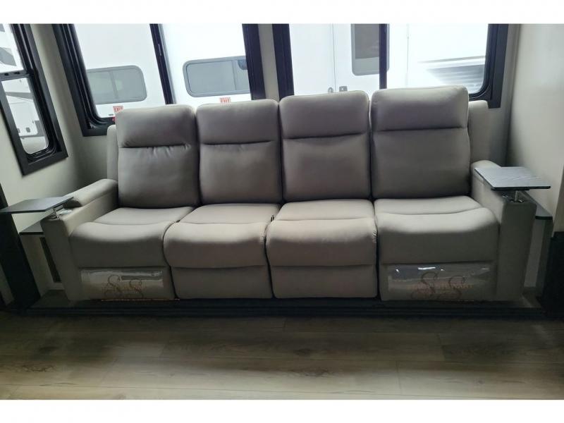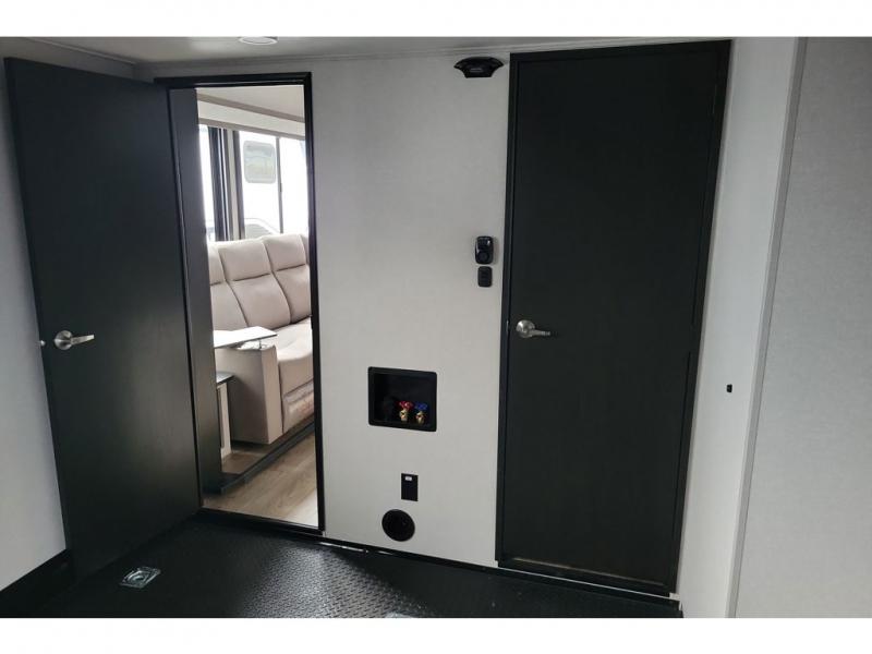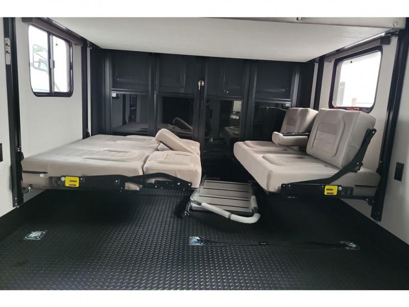 Get ready for outdoor adventures in this spacious toy hauler. Your guests will have the 13' separate garage area with its own half bath, a queen bed with rear convertible sofas, plus a loft for more sleeping or storage space. The main living area includes a large slide out for added space, and here you can relax on the sofa that sits across from the entertainment center with a 50" TV. The chef will love the U-shaped kitchen counter, 17 cu. ft. 12V refrigerator, and residential oven with a three burner cooktop. Up front, the private bedroom includes a king bed with a queen bed option, a slide out with dual wardrobes and a dresser, and quick access to the dual entry full bath! The exterior is just as accommodating with its 40" exterior TV, rear party deck and side patio party deck, and triple awnings for ample protection against the sun!