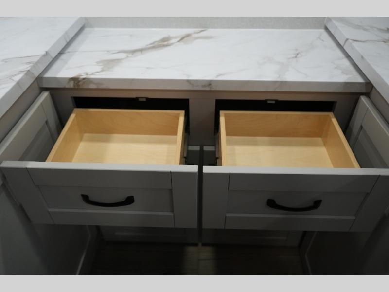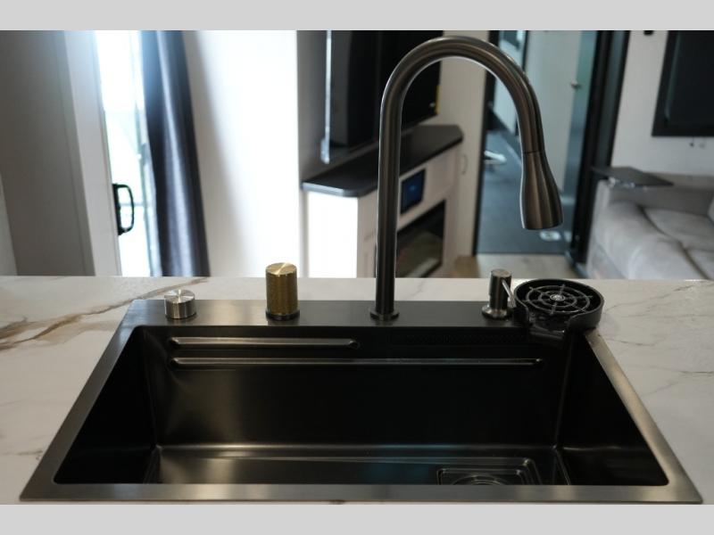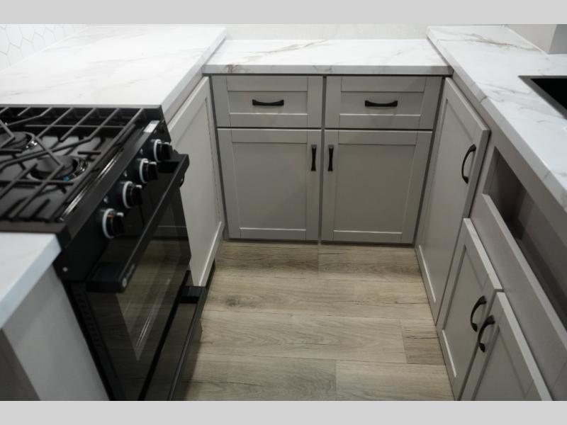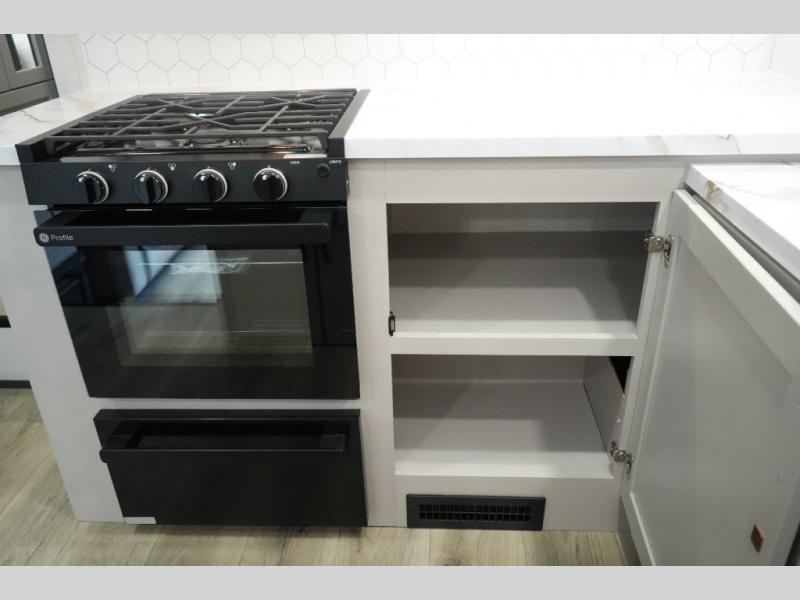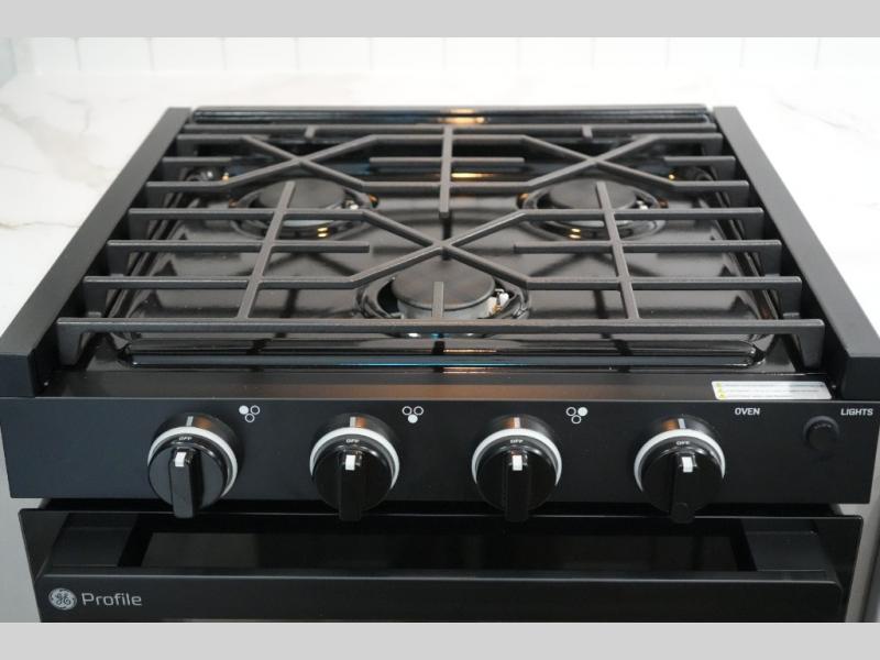 Fully Equipped Kitchen – Includes U-shaped solid-surface countertops, a residential 17 cu. ft. 12V fridge, three-burner cooktop, and oven—perfect for cooking on the go.