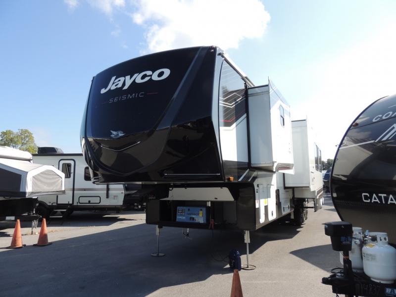 One look at the Seismic toy haulers by Jayco, and you'll never go back! Each model features a custom automotive-grade vinyl exterior graphics package, a painted fiberglass front cap with built-in LED lighting, and 102" wide-body structural steel I-beam construction. You'll find the pass-through storage with Slam-Latch baggage doors will make unpacking easier than ever, and the rear ramp door/patio with anti-slip, non-skid flooring will allow you to unload your toys with no trouble at all. These toy haulers feature a three seasons garage wall/doors, a 30 gallon fuel tank with a timer, and exterior marine-grade speakers to keep the party going. The Climate Shield zero degree tested weather protection includes a 35,000 BTU furnace, PEX plumbing, and a fully enclosed and heated underbelly so you can enjoy your adventures year around. And we haven't even touched on the interior luxuries you'll find, like solid hardwood cabinet doors, residential vinyl flooring made in the USA, night shades, and more!