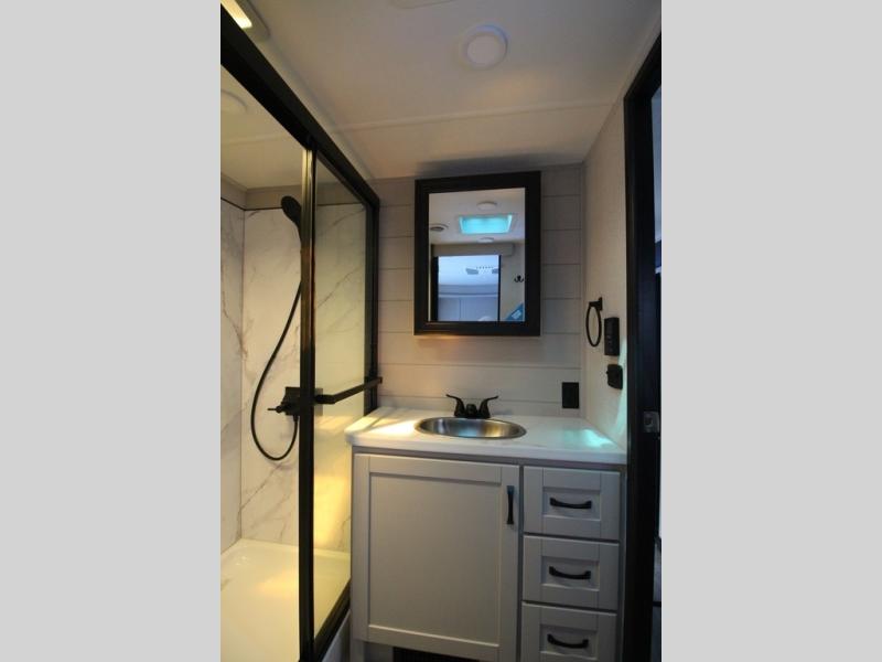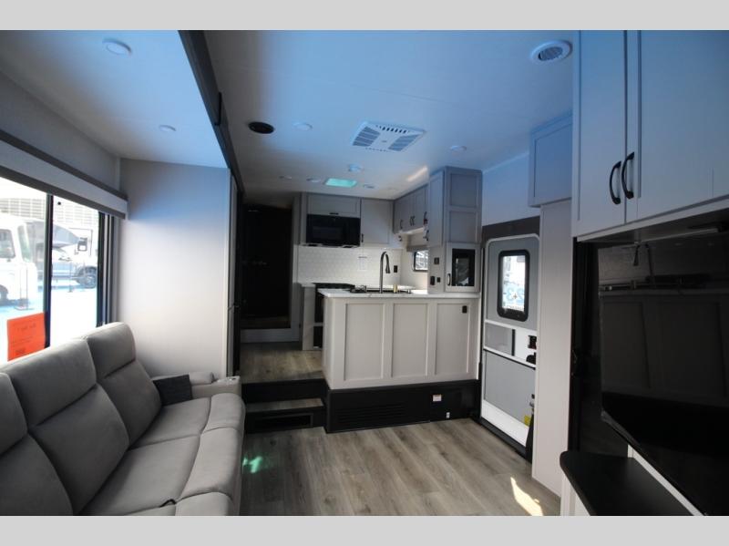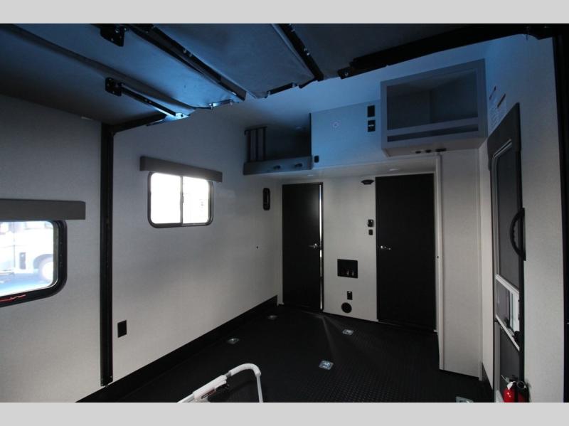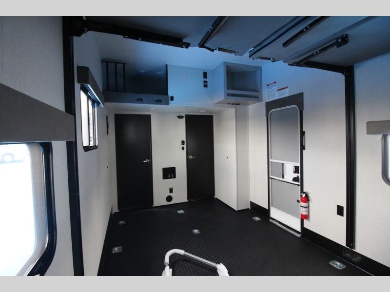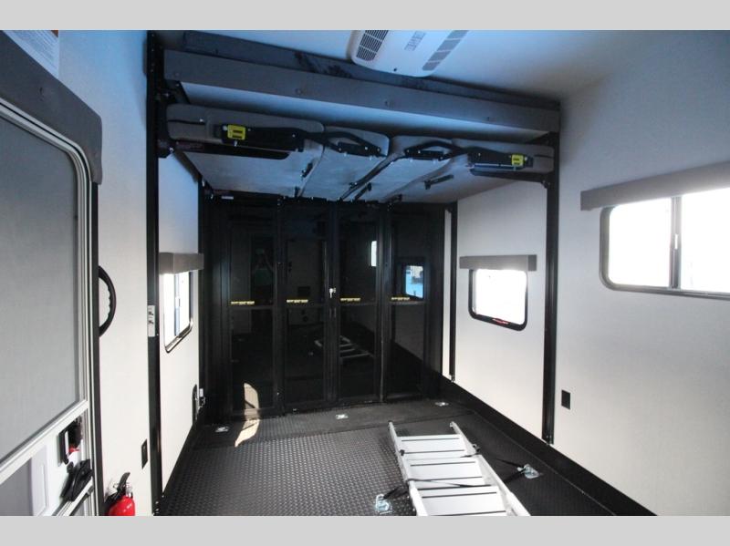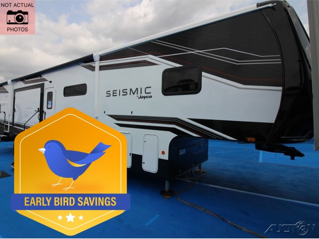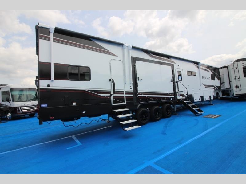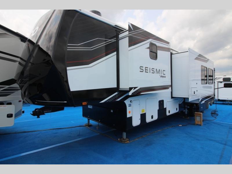 One look at the Seismic toy haulers by Jayco, and you'll never go back! Each model features a custom automotive-grade vinyl exterior graphics package, a painted fiberglass front cap with built-in LED lighting, and 102" wide-body structural steel I-beam construction. You'll find the pass-through storage with Slam-Latch baggage doors will make unpacking easier than ever, and the rear ramp door/patio with anti-slip, non-skid flooring will allow you to unload your toys with no trouble at all. These toy haulers feature a three seasons garage wall/doors, a 30 gallon fuel tank with a timer, and exterior marine-grade speakers to keep the party going. The Climate Shield zero degree tested weather protection includes a 35,000 BTU furnace, PEX plumbing, and a fully enclosed and heated underbelly so you can enjoy your adventures year around. And we haven't even touched on the interior luxuries you'll find, like solid hardwood cabinet doors, residential vinyl flooring made in the USA, night shades, and more!