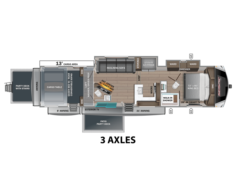 If you aim for the extraordinary, then the Jayco Seismic Luxury Series Toy Hauler is your perfect match. Starting with perhaps one of the most important parts of a toy hauler: the garage floor. The Seismic Luxury Series garage has an industry-first 2” block foam fully-insulated and laminated garage floor, making it more comfortable when you’re using the space as a room or lounging area. Not to mention it makes for easy cleaning and is easy on the eyes. While you’re sitting out on your garage-turned-sun deck, enjoy the JBL® residential sound bar with a wireless subwoofer. It’s the perfect choice for movie nights or music on the deck and easily pairs with new electronics. Too sunny out? The Seismic Luxury Series has three electric awnings—two-door side electric awnings with LED lights on the sidewall and a rear electric patio awning. Set the ambiance with the LED lights and make your coach stand out.