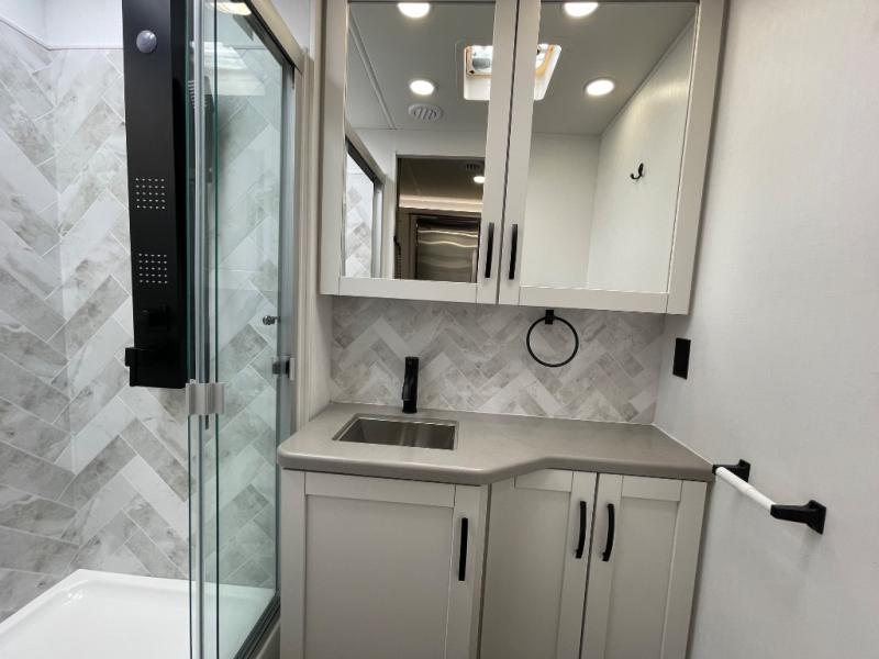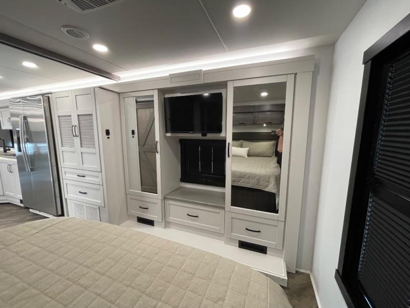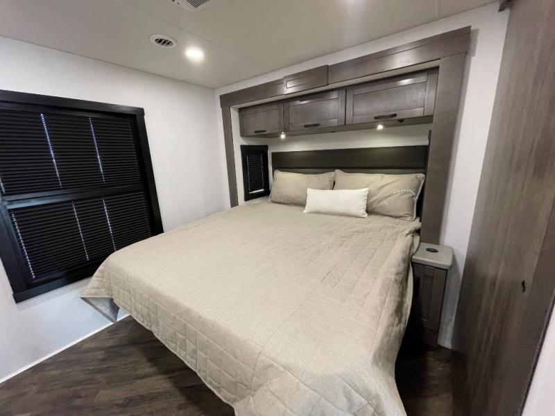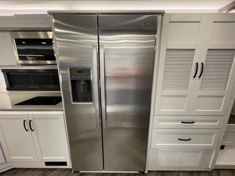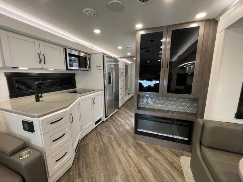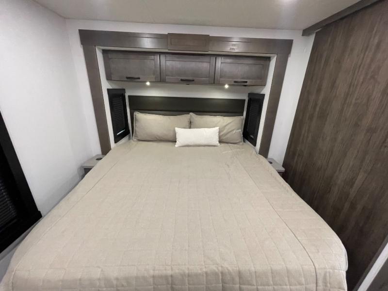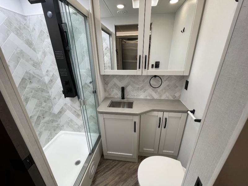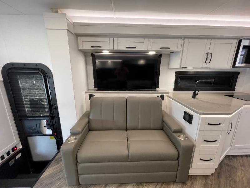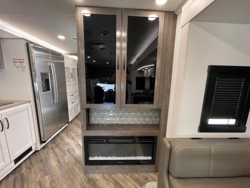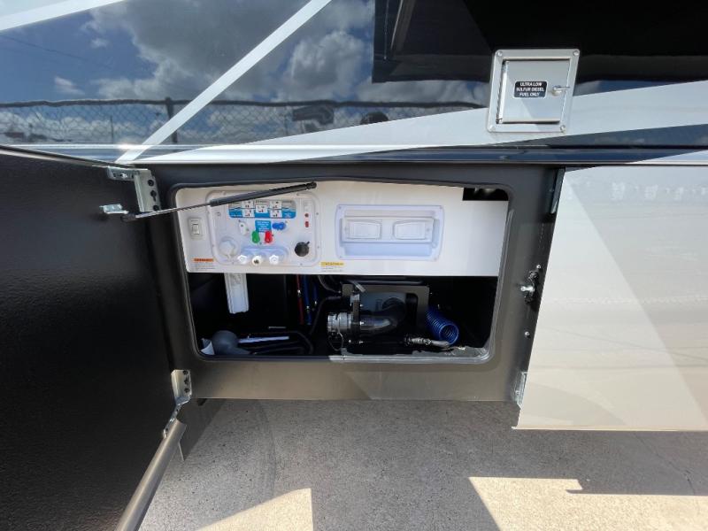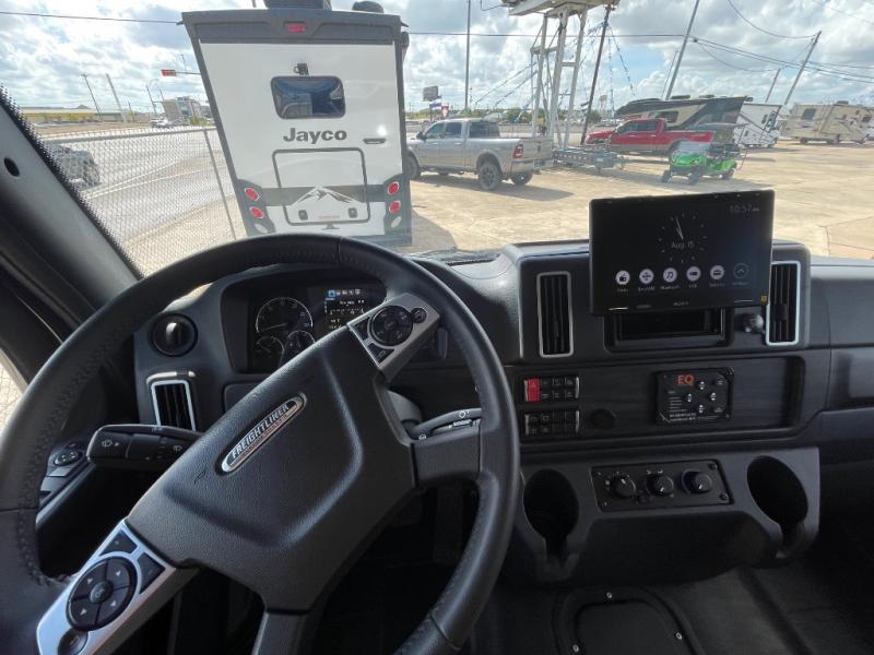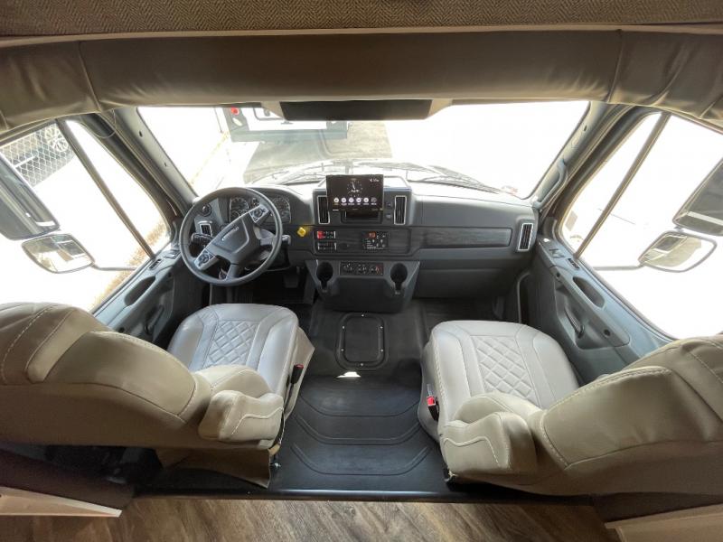You will be quite impressed with the Jayco Seneca Prestige Super C diesel motorhome! The construction consists of a Stronghold VBL roof, floor, and sidewalls, and the premium Sikkens full-body paint is going to draw attention as you cruise down the highway. The entrance door has the industry's largest travel-view window, and you have four 6V AGM (220Ah) house batteries on a slide out tray for convenience. The Firefly multiplex system will give you access to your coach's functions from the smartphone in your hand, and the matte-finish woodgrain polished porcelain tile flooring has a heated floor mat for extra comfort. The luxury continues on with the addition of the solid-surface countertops and water filtration system, and the 9" Sony® infotainment center with Apple CarPlay® and Android Auto™ as well as the backup and sideview cameras are an excellent contribution to the front cab area.