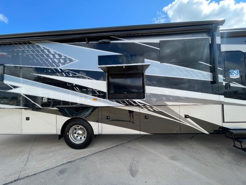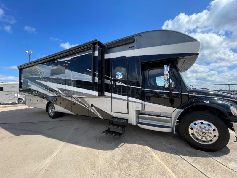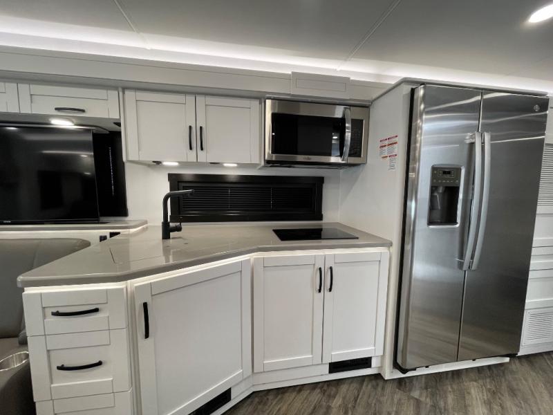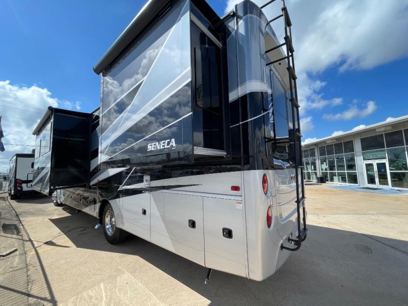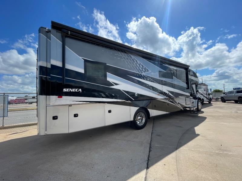 Join your fellow RVers on the road in your very own luxurious Seneca Prestige Super C diesel motorhome! You will have plenty of interior living space because of the full-wall slide and the additional two slides, so you can invite some of your friends over for a game night. Make a special meal for those guests on the two-burner induction cooktop and keep your beverages cool in the stainless steel residential refrigerator. You can have everyone sit down at the 42" x 70" booth dinette, and after dinner is over, you can all take your places on the 72" theater sofa and jackknife sofa with coffee and dessert. Lastly, you'll be grateful to find a bunk above the cab when you invite your friends to stay the night.