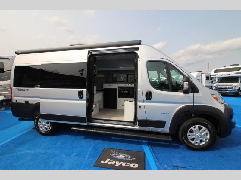 Head out on your greatest adventures with one of these Jayco Swift Class B gas motorhomes! Each model includes the JRide system with Hellwig helper springs and a premium heavy-duty suspension for smooth handling, and the Thule armless patio awning with LED lights will create an outdoor living space you are sure to love. Head inside to find pressed countertops, sliding vented windows, a soft-touch vinyl ceiling, plus many more comforts. The Uconnect 5 NAV infotainment center with Apple CarPlay® and Android Auto™ will also come in handy as you travel to your destination. An optional 200W roof-mounted solar panel can be added, along with the optional Li Package that features a lithium smart battery, Timberline hydronic heating system, a 3,000W inverter, and more power features!