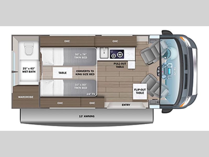 This Swift gas motorhome is perfect for day trips to the antique show or week-long excursions in the mountains. There is a rear 25" x 43" wet bath with a wardrobe for your towels and toiletries, and there are plenty of overhead compartments throughout for all your belongings. The twin beds convert to a king-size bed for a great night's rest. The kitchen includes everything you need to prepare meals each day, including a two burner cooktop, a convection microwave, and a 3.1 cu. ft. AC/DC refrigerator.