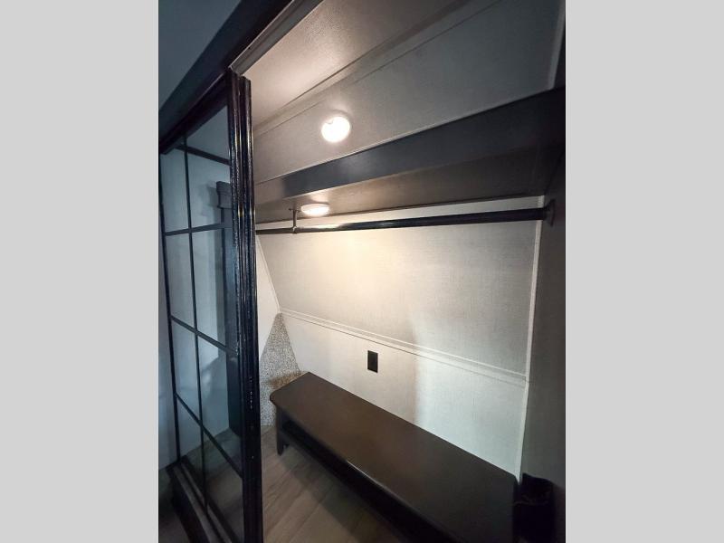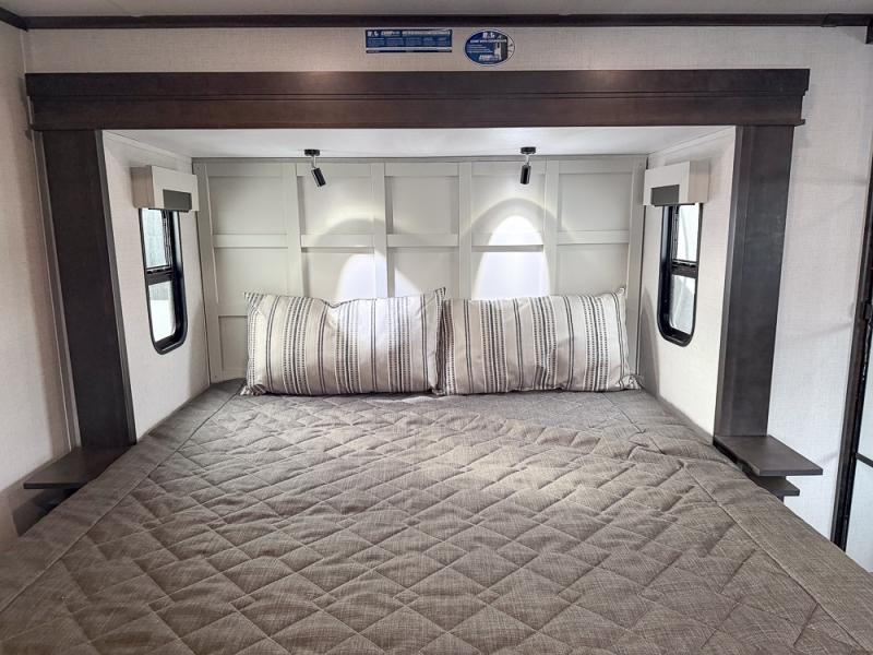 You will feel right at home camping in this fifth wheel! The chef will have lots of countertop space to prepare their best meals along with a kitchen island, two pull-out pantries to store your dishes, and an 18 cu. ft. residential refrigerator to store any leftovers. The free standing dinette offers a comfortable place to enjoy your meals, and the theater seating across from the fireplace and entertainment center will be perfect for movie nights. There is also a rear hide-a-bed sofa sleeper for any guests you may have. You will love the full bath that includes a shower with a seat, a linen closet, plus two bath sinks for convenience. And don't overlook the front bedroom with a sliding door, king bed slide out, and master closet for all your things. You'll also find stackable washer and dryer prep, two drawers, and a Smart HDTV for movies in bed.