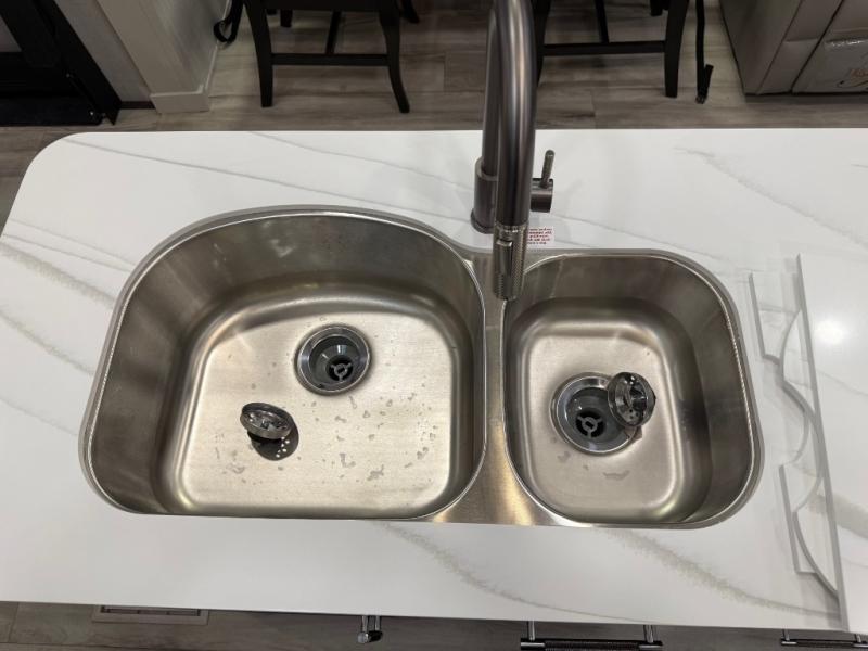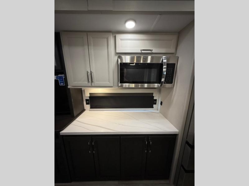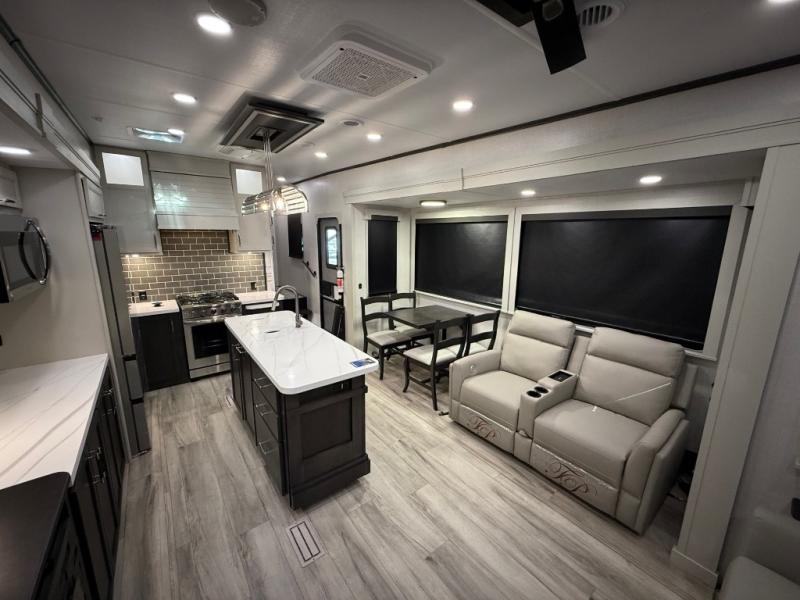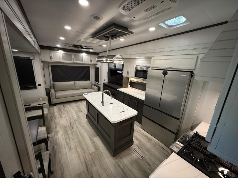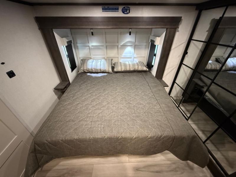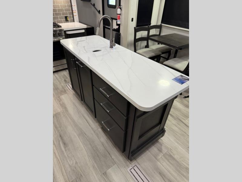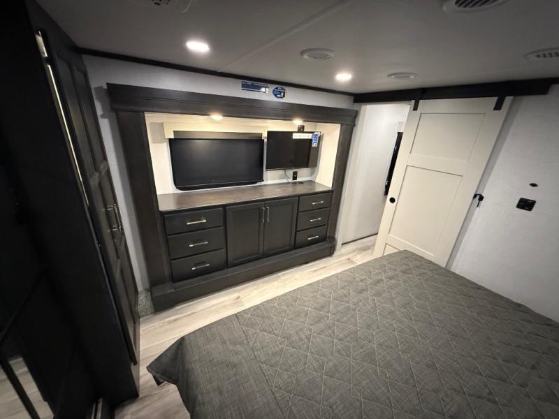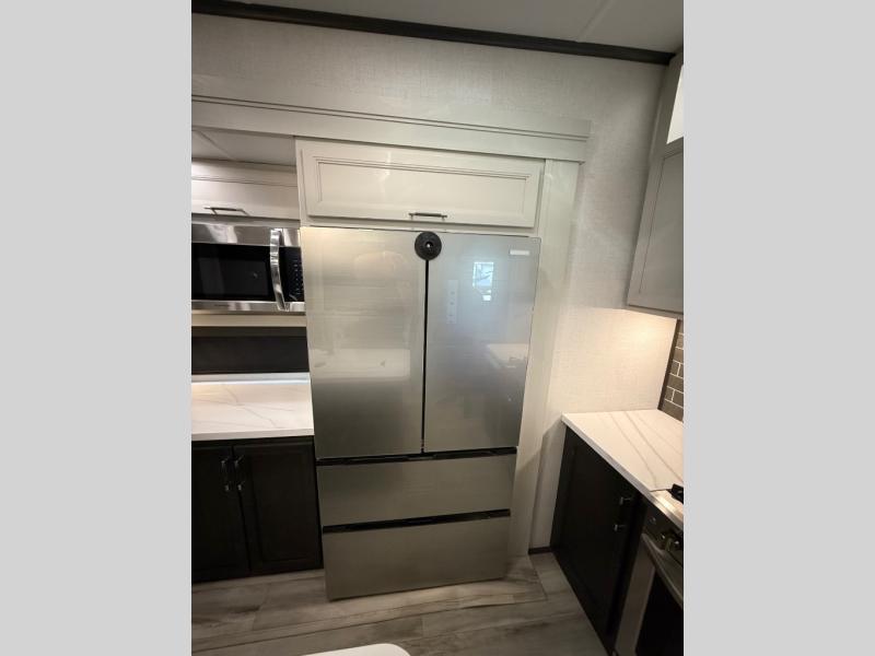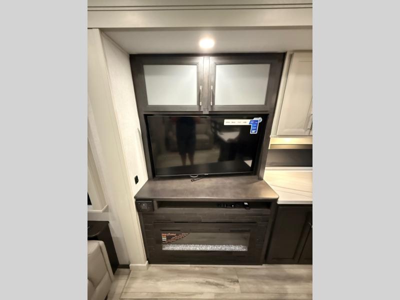 You will feel right at home camping in this fifth wheel! The chef will have lots of countertop space to prepare their best meals along with a kitchen island, two pull-out pantries to store your dishes, and an 18 cu. ft. residential refrigerator to store any leftovers. The free standing dinette offers a comfortable place to enjoy your meals, and the theater seating across from the fireplace and entertainment center will be perfect for movie nights. There is also a rear hide-a-bed sofa sleeper for any guests you may have. You will love the full bath that includes a shower with a seat, a linen closet, plus two bath sinks for convenience. And don't overlook the front bedroom with a stylish barn door, king bed slide out, and master closet for all your things. You'll also find stackable washer and dryer prep, two drawers, and a Smart HDTV for movies in bed.