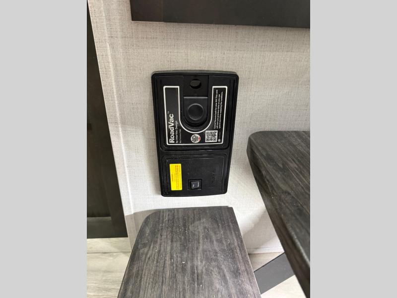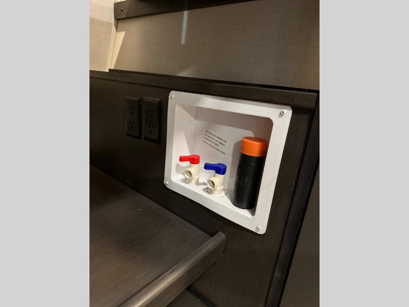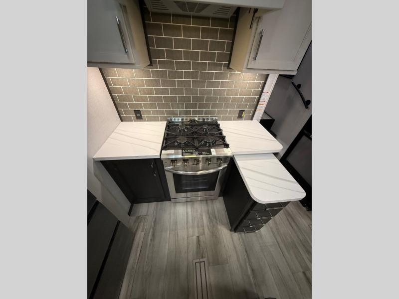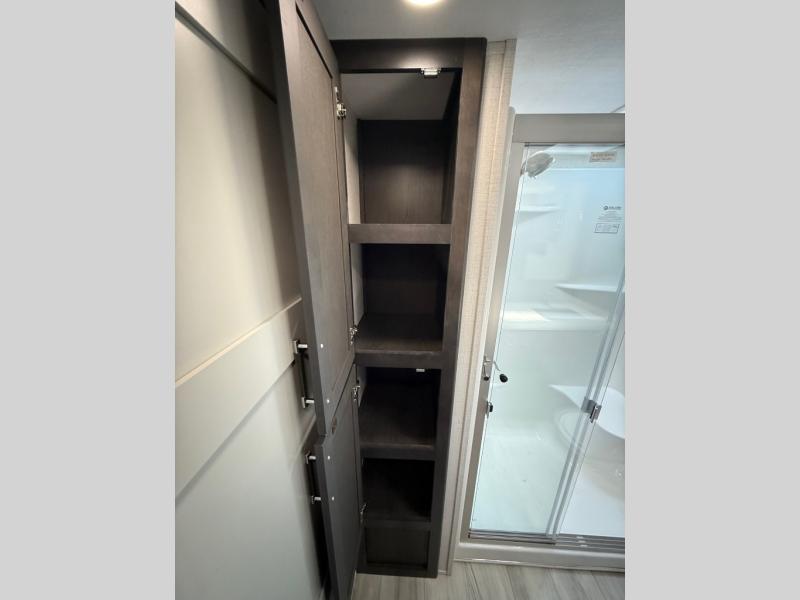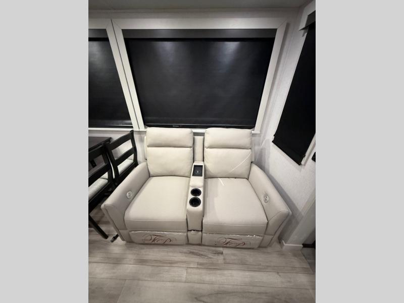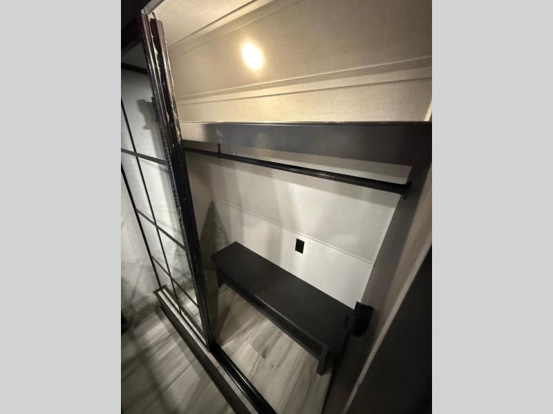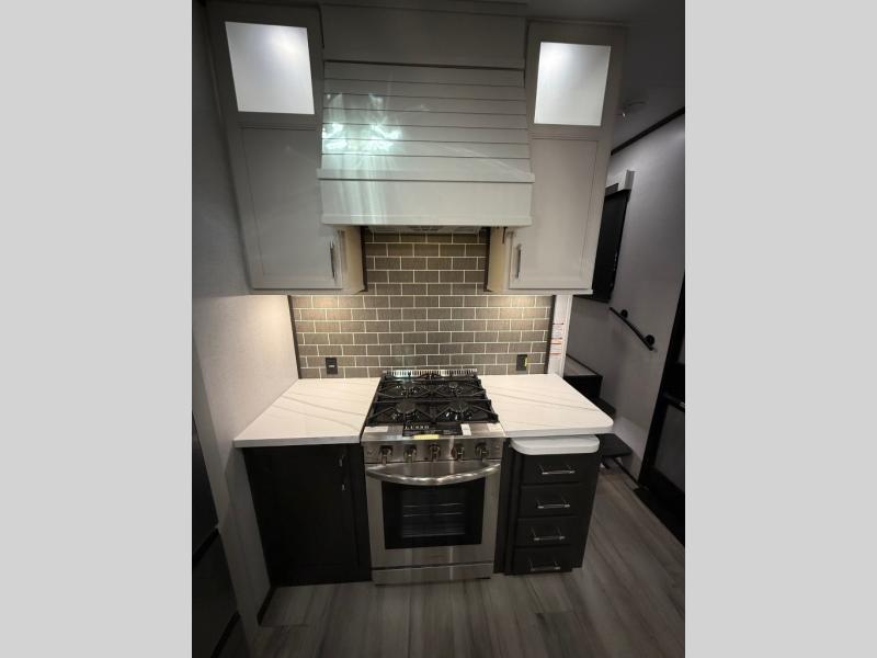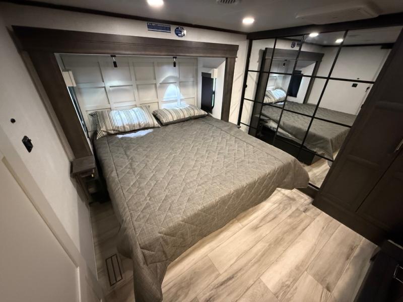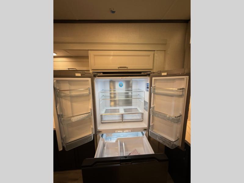 You will feel right at home camping in this fifth wheel! The chef will have lots of countertop space to prepare their best meals along with a kitchen island, two pull-out pantries to store your dishes, and an 18 cu. ft. residential refrigerator to store any leftovers. The free standing dinette offers a comfortable place to enjoy your meals, and the theater seating across from the fireplace and entertainment center will be perfect for movie nights. There is also a rear hide-a-bed sofa sleeper for any guests you may have. You will love the full bath that includes a shower with a seat, a linen closet, plus two bath sinks for convenience. And don't overlook the front bedroom with a stylish barn door, king bed slide out, and master closet for all your things. You'll also find stackable washer and dryer prep, two drawers, and a Smart HDTV for movies in bed.