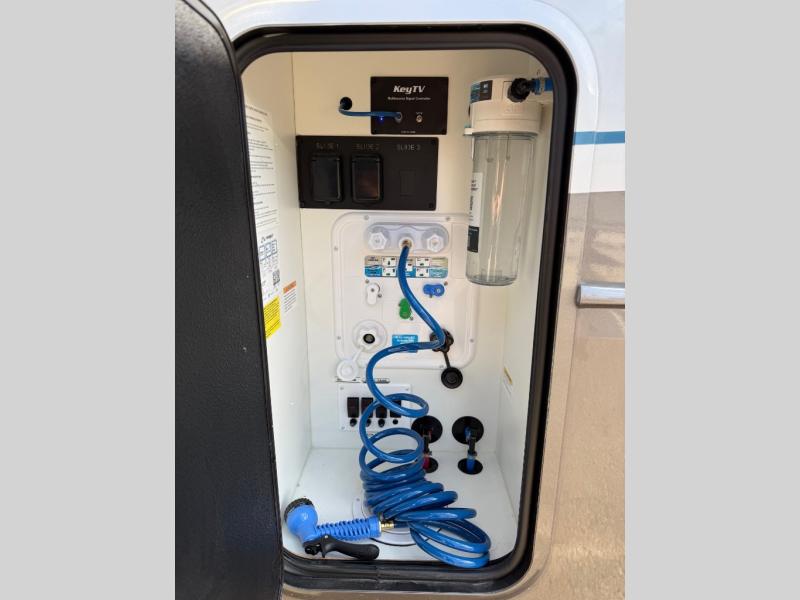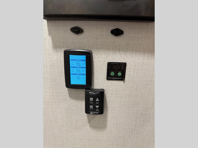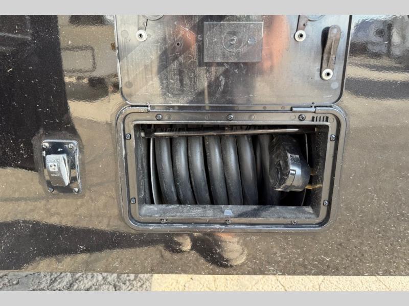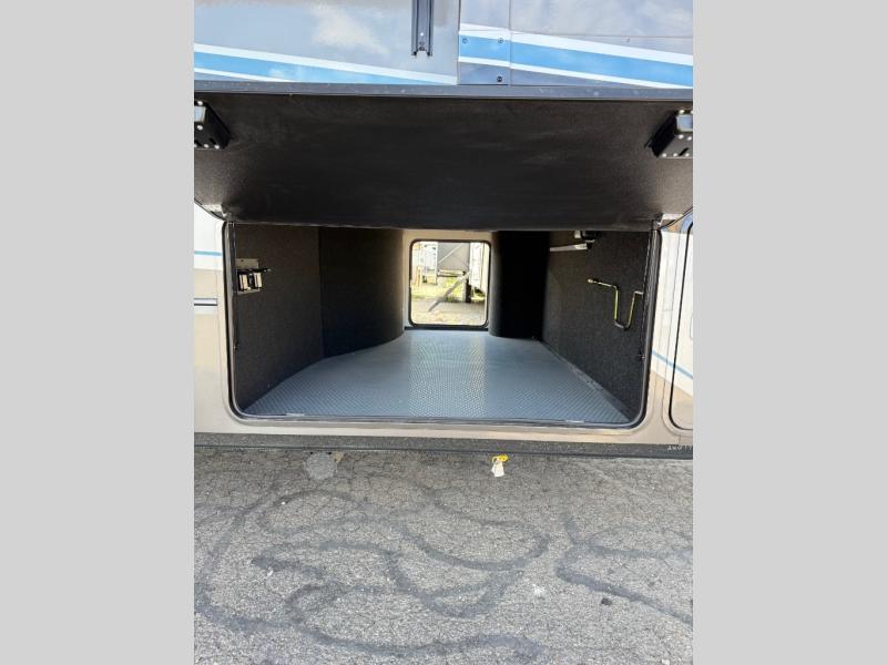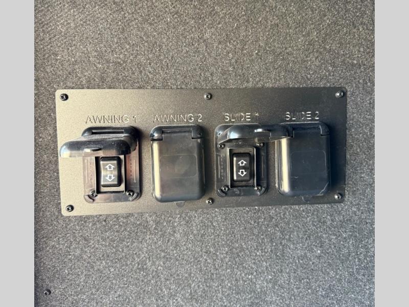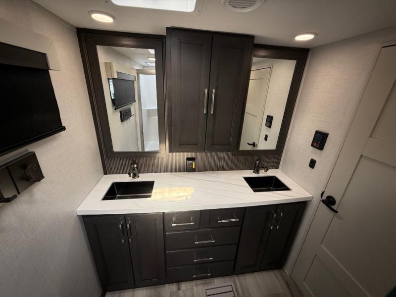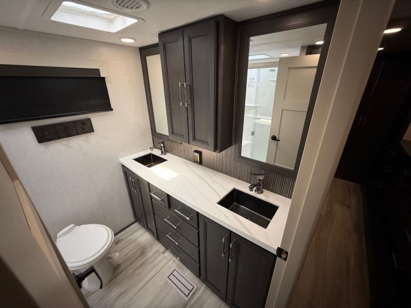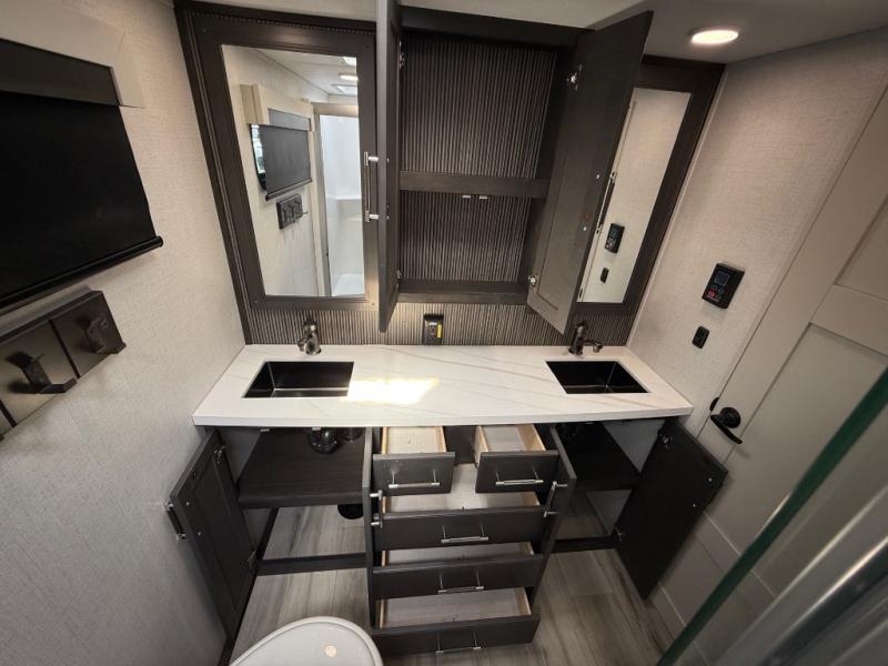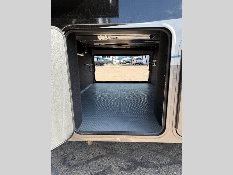 You will feel right at home camping in this fifth wheel! The chef will have lots of countertop space to prepare their best meals along with a kitchen island, two pull-out pantries to store your dishes, and an 18 cu. ft. residential refrigerator to store any leftovers. The free standing dinette offers a comfortable place to enjoy your meals, and the theater seating across from the fireplace and entertainment center will be perfect for movie nights. There is also a rear hide-a-bed sofa sleeper for any guests you may have. You will love the full bath that includes a shower with a seat, a linen closet, plus two bath sinks for convenience. And don't overlook the front bedroom with a stylish barn door, king bed slide out, and master closet for all your things. You'll also find stackable washer and dryer prep, two drawers, and a Smart HDTV for movies in bed.