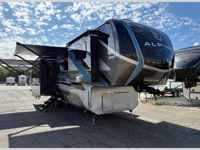 Luxury is not an option, it is a standard with each one of these Keystone RV Alpine fifth wheels! A 8' 4" wide body construction will create an open, residential feeling, and cutting-edge technology will provide a hassle-free camping experience. The Tru-Fit slide construction is more durable and minimizes motor structural stress, as well as resists leaking, and the Blade Pure airflow system provides residential comfort with its high-performance. Each fifth wheel includes designer flooring throughout, stunning solid wood cabinet doors, luxurious crown molding, and solid surface countertops in the kitchen. The exterior also includes an outside shower with hot and cold water, Lippert strut assisted SolidSteps, Hitch Vision with LED lighting, and many more conveniences!