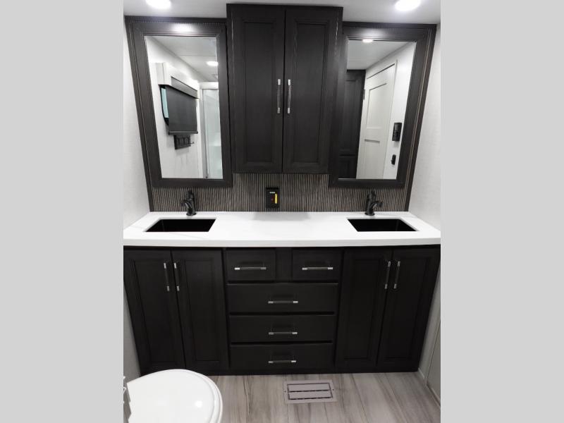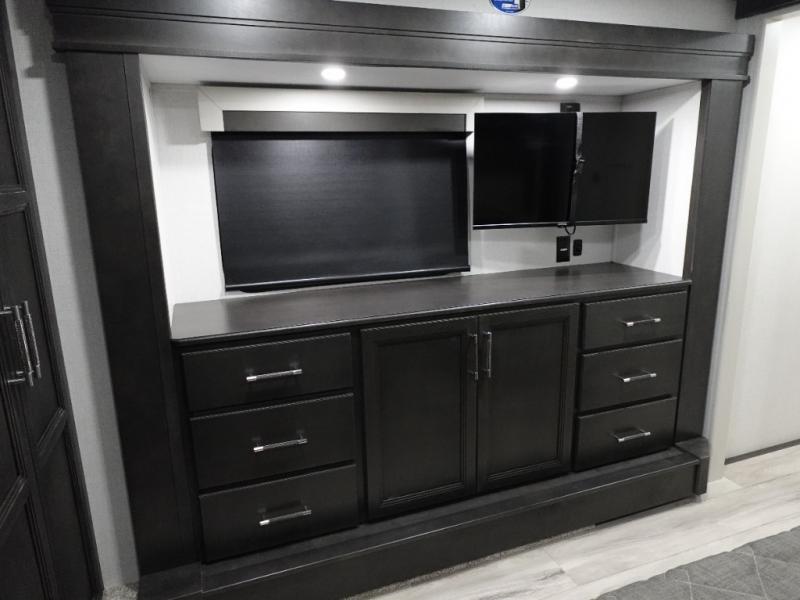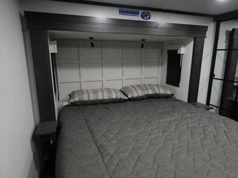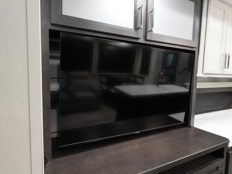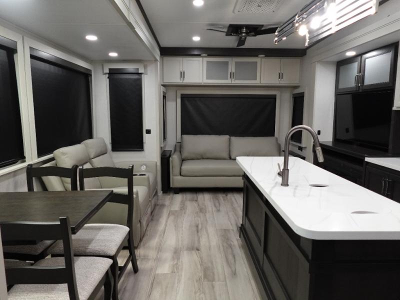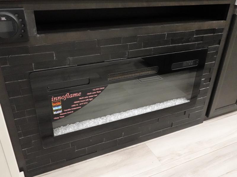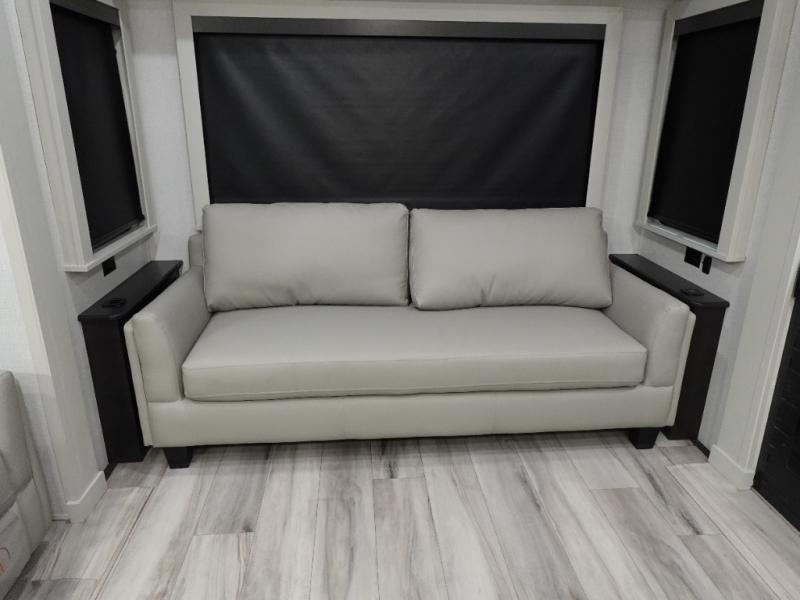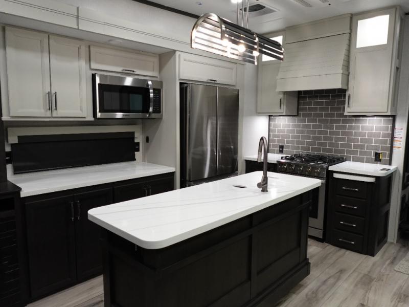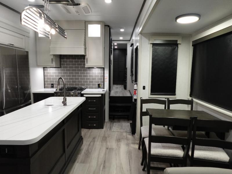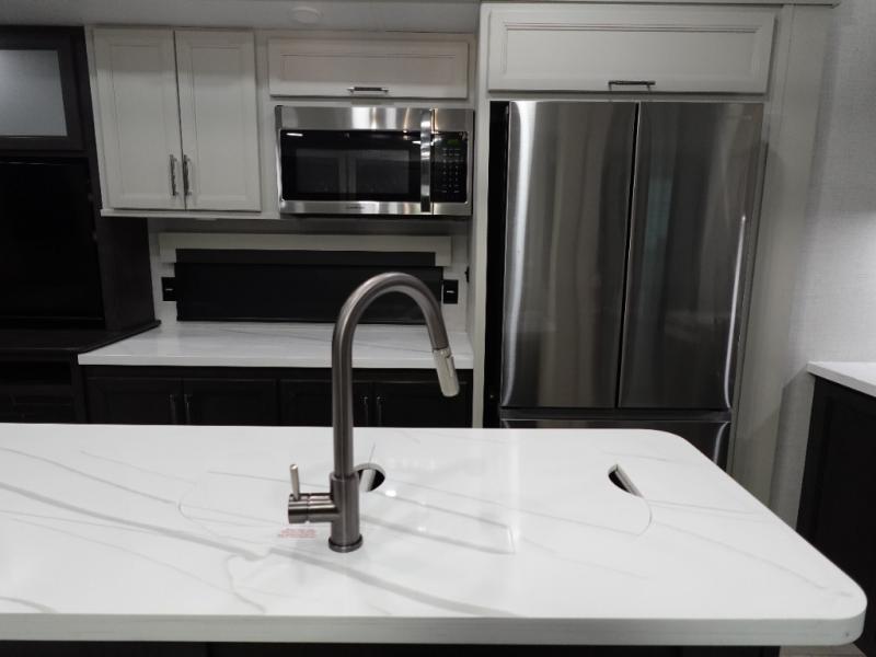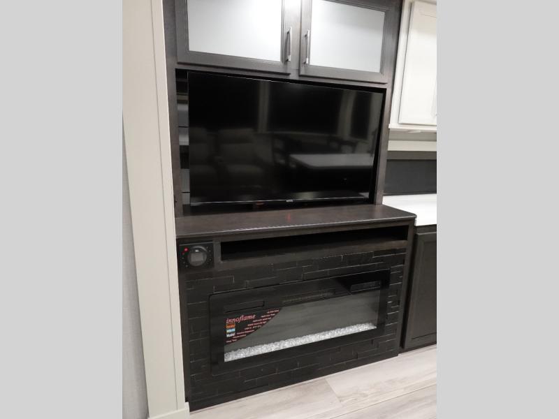 You will feel right at home camping in this fifth wheel! The chef will have lots of countertop space to prepare their best meals along with a kitchen island, two pull-out pantries to store your dishes, and an 18 cu. ft. residential refrigerator to store any leftovers. The free standing dinette offers a comfortable place to enjoy your meals, and the theater seating across from the fireplace and entertainment center will be perfect for movie nights. There is also a rear hide-a-bed sofa sleeper for any guests you may have. You will love the full bath that includes a shower with a seat, a linen closet, plus two bath sinks for convenience. And don't overlook the front bedroom with a sliding door, king bed slide out, and master closet for all your things. You'll also find stackable washer and dryer prep, two drawers, and a Smart HDTV for movies in bed.