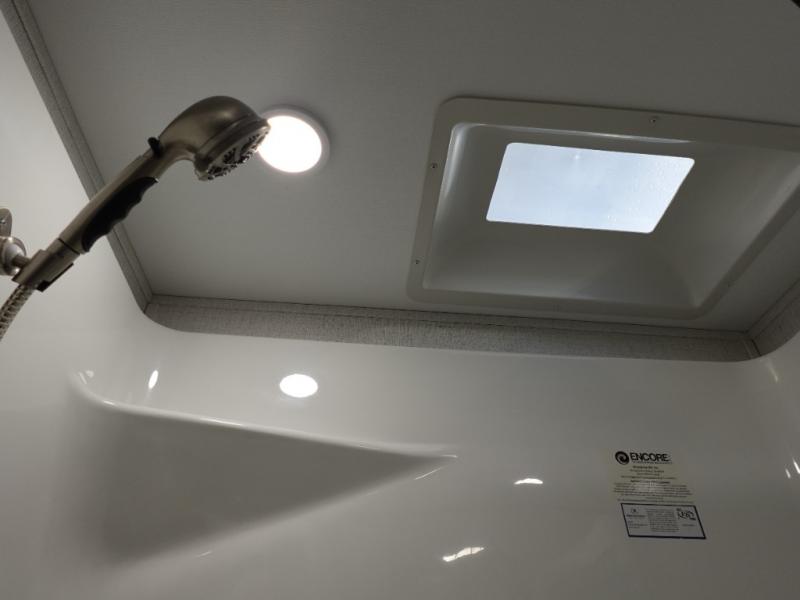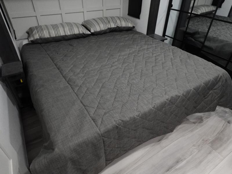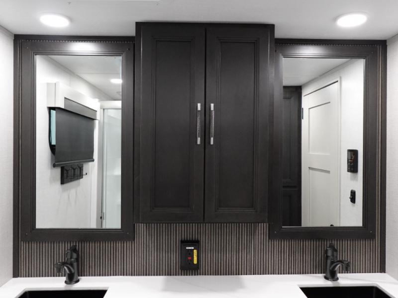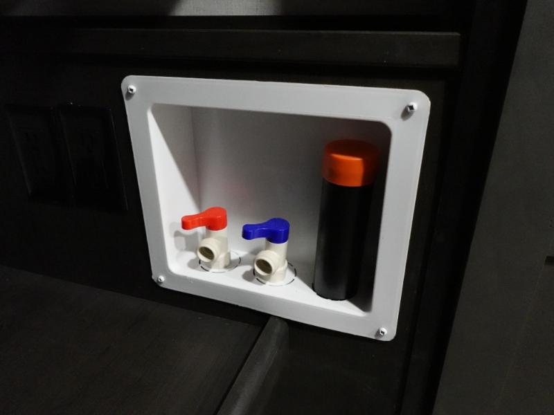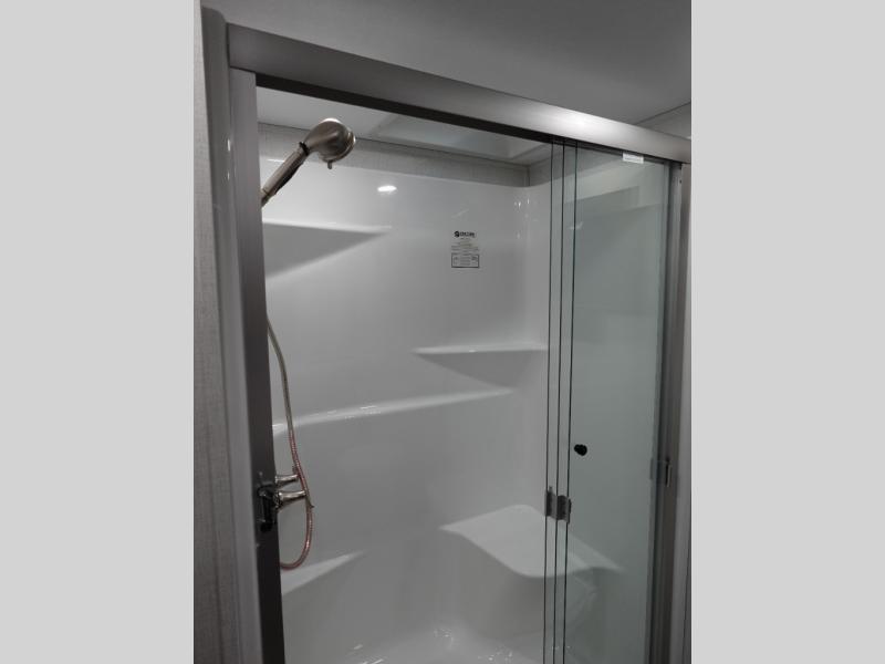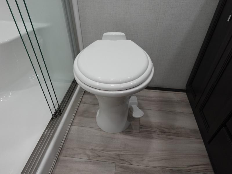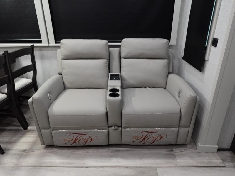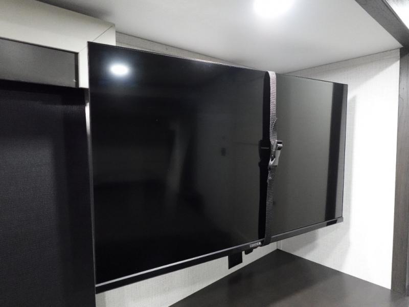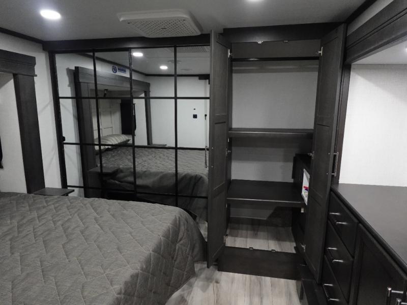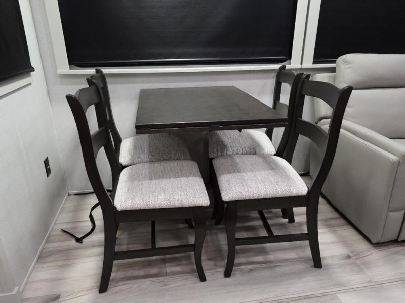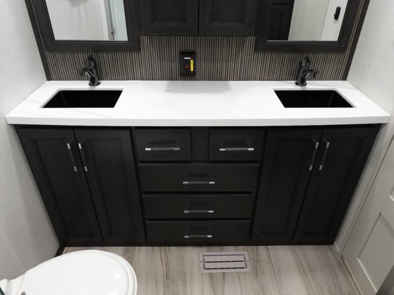 You will feel right at home camping in this fifth wheel! The chef will have lots of countertop space to prepare their best meals along with a kitchen island, two pull-out pantries to store your dishes, and an 18 cu. ft. residential refrigerator to store any leftovers. The free standing dinette offers a comfortable place to enjoy your meals, and the theater seating across from the fireplace and entertainment center will be perfect for movie nights. There is also a rear hide-a-bed sofa sleeper for any guests you may have. You will love the full bath that includes a shower with a seat, a linen closet, plus two bath sinks for convenience. And don't overlook the front bedroom with a sliding door, king bed slide out, and master closet for all your things. You'll also find stackable washer and dryer prep, two drawers, and a Smart HDTV for movies in bed.