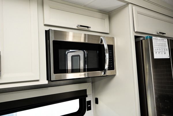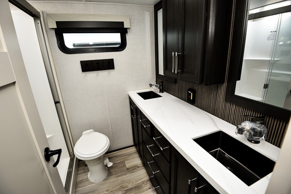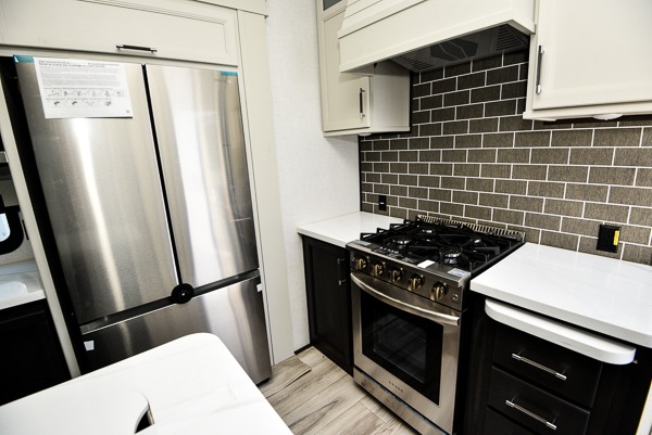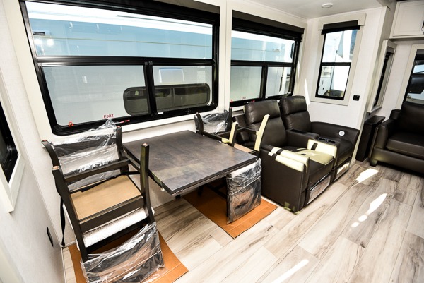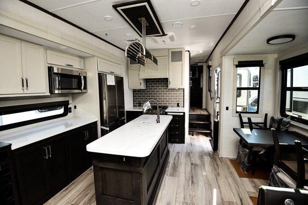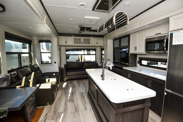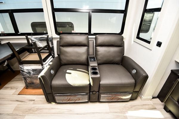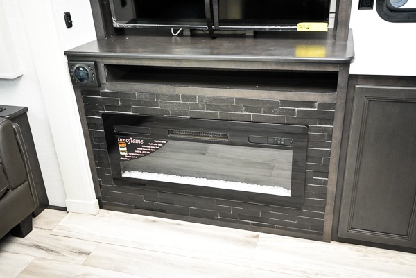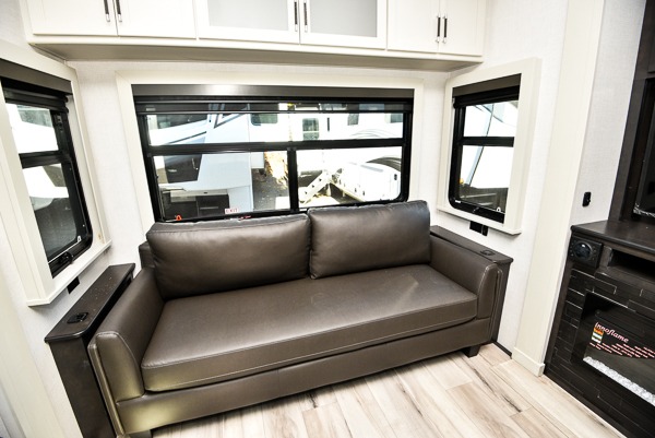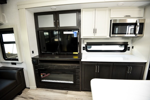 You will feel right at home camping in this fifth wheel! The chef will have lots of countertop space to prepare their best meals along with a kitchen island, two pull-out pantries to store your dishes, and an 18 cu. ft. residential refrigerator to store any leftovers. The free standing dinette offers a comfortable place to enjoy your meals, and the theater seating across from the fireplace and entertainment center will be perfect for movie nights. There is also a rear hide-a-bed sofa sleeper for any guests you may have. You will love the full bath that includes a shower with a seat, a linen closet, plus two bath sinks for convenience. And don't overlook the front bedroom with a sliding door, king bed slide out, and master closet for all your things. You'll also find stackable washer and dryer prep, two drawers, and a Smart HDTV for movies in bed.