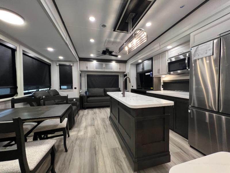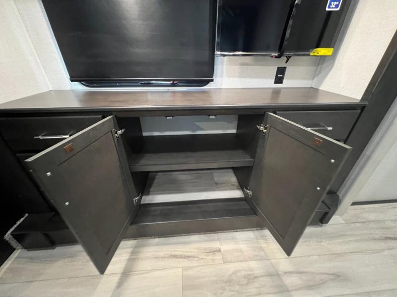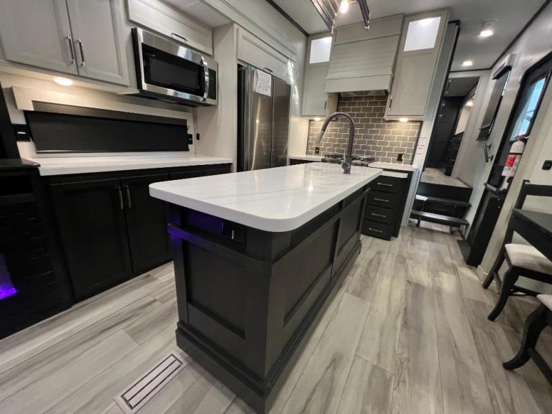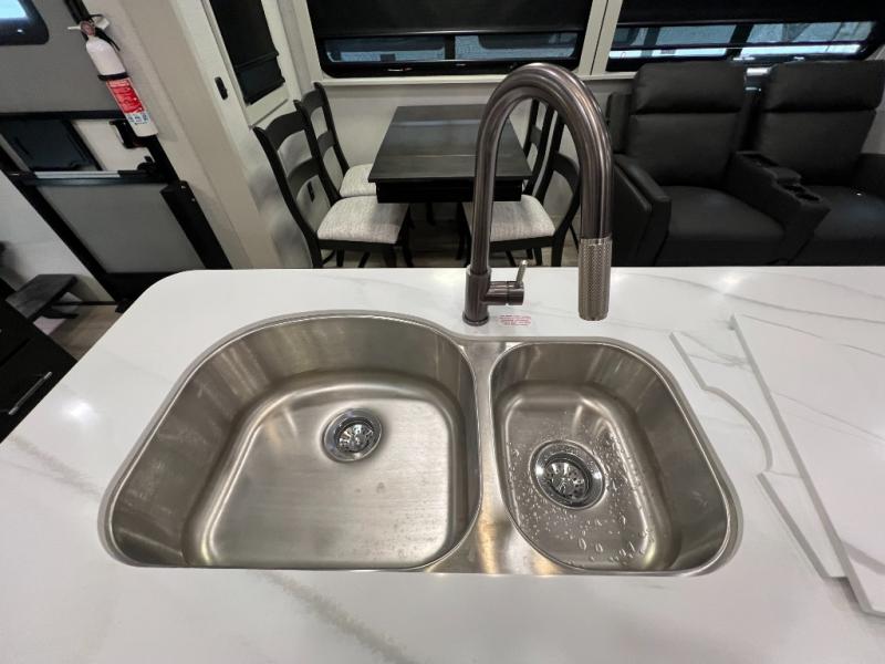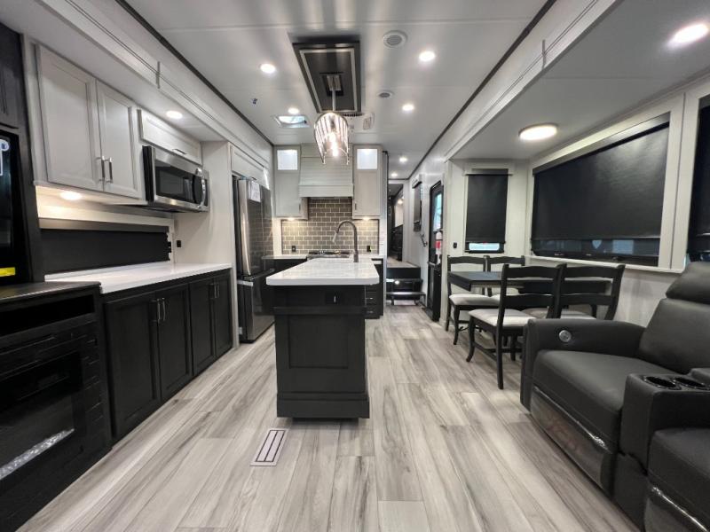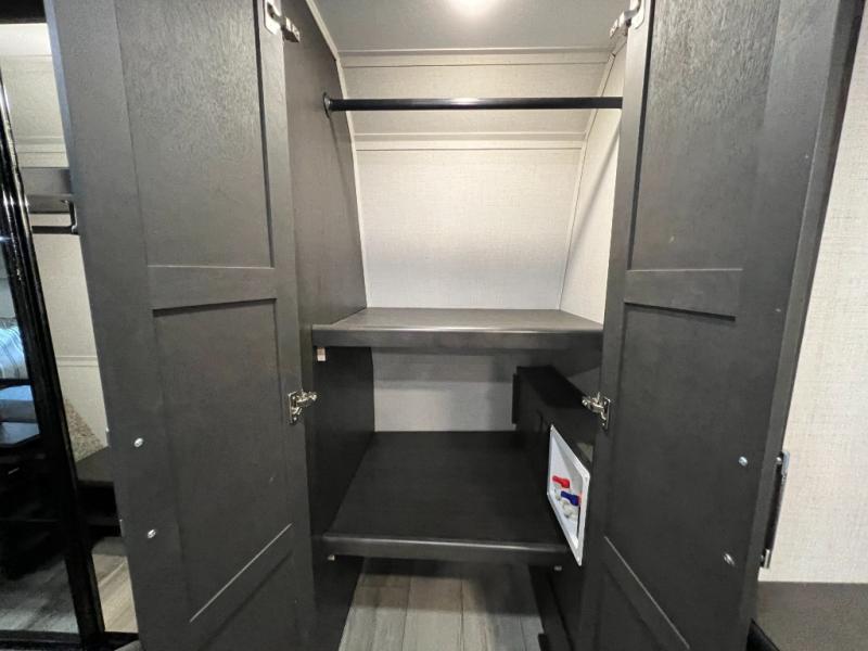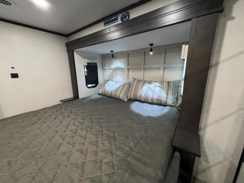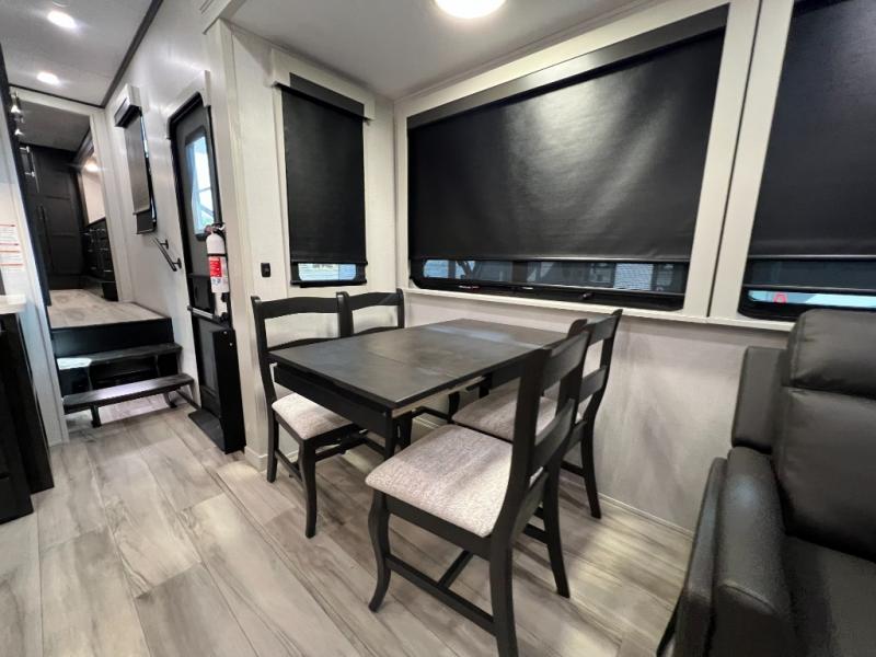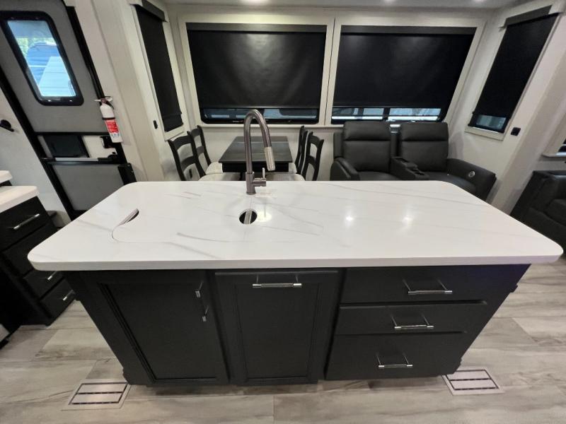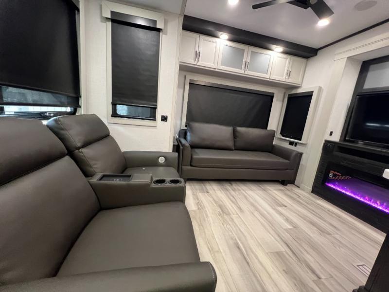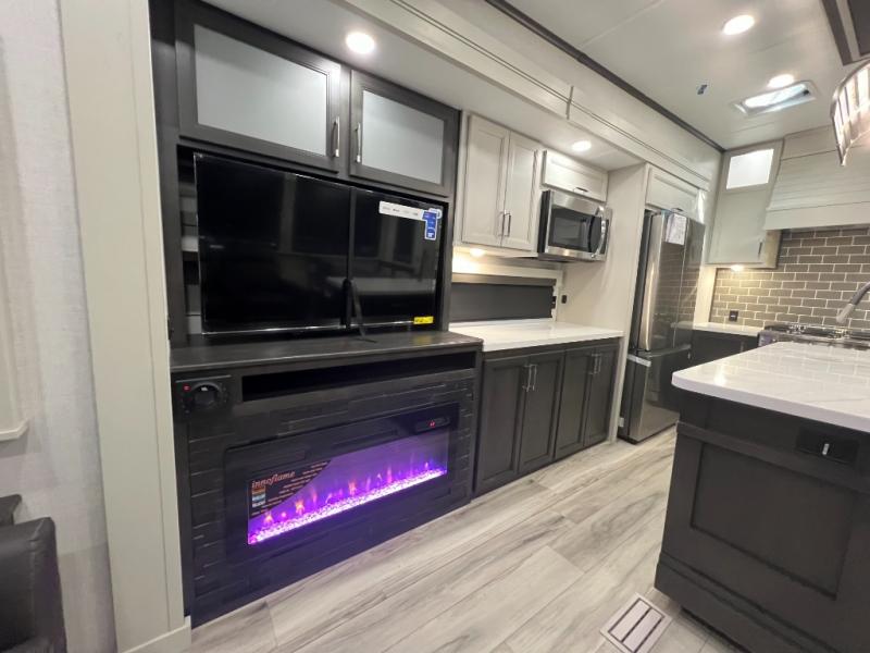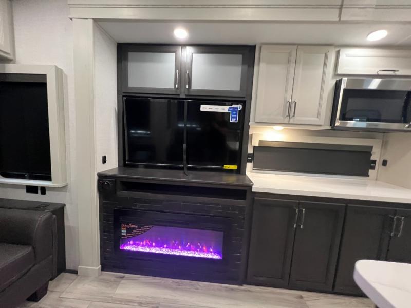You will feel right at home camping in this fifth wheel! The chef will have lots of countertop space to prepare their best meals along with a kitchen island, two pull-out pantries to store your dishes, and an 18 cu. ft. residential refrigerator to store any leftovers. The free standing dinette offers a comfortable place to enjoy your meals, and the theater seating across from the fireplace and entertainment center will be perfect for movie nights. There is also a rear hide-a-bed sofa sleeper for any guests you may have. You will love the full bath that includes a shower with a seat, a linen closet, plus two bath sinks for convenience. And don't overlook the front bedroom with a sliding door, king bed slide out, and master closet for all your things. You'll also find stackable washer and dryer prep, two drawers, and a Smart HDTV for movies in bed.