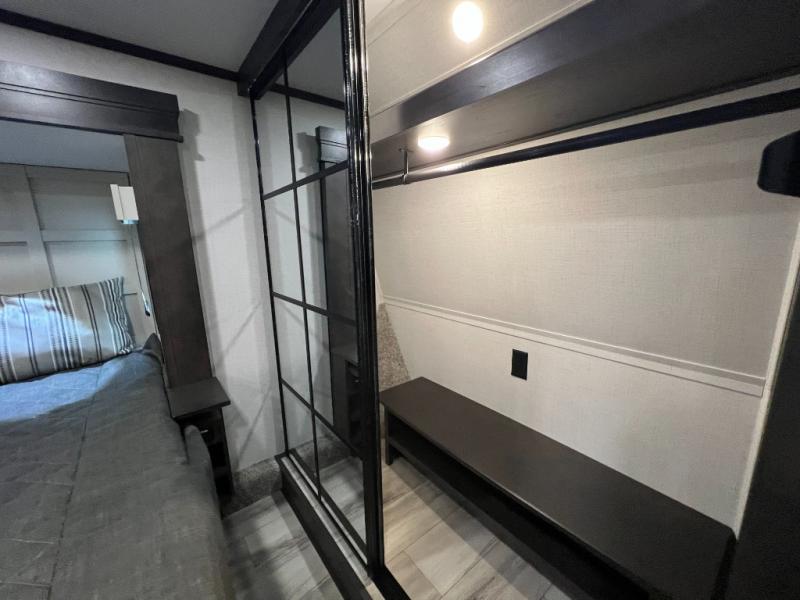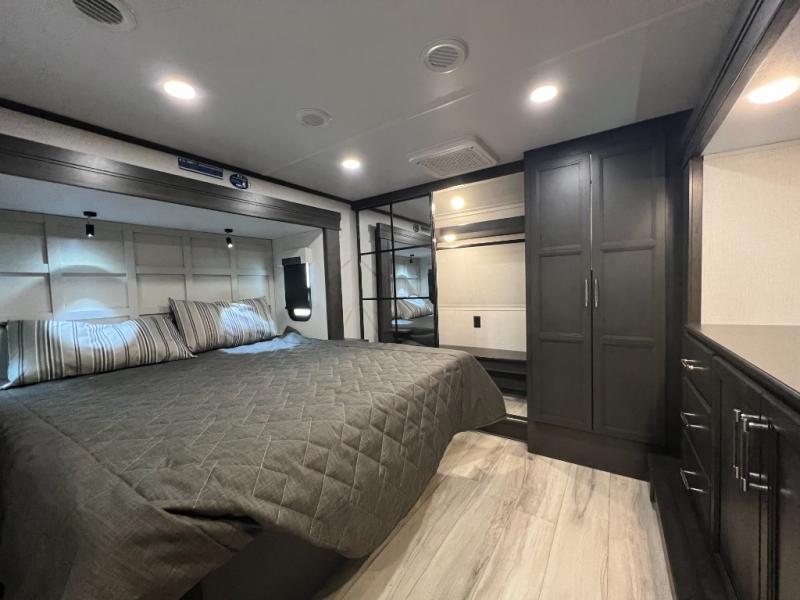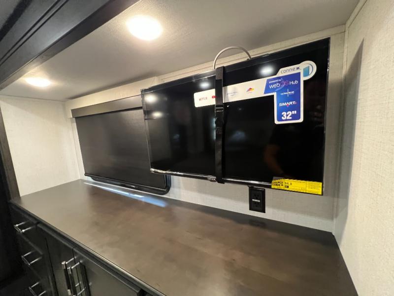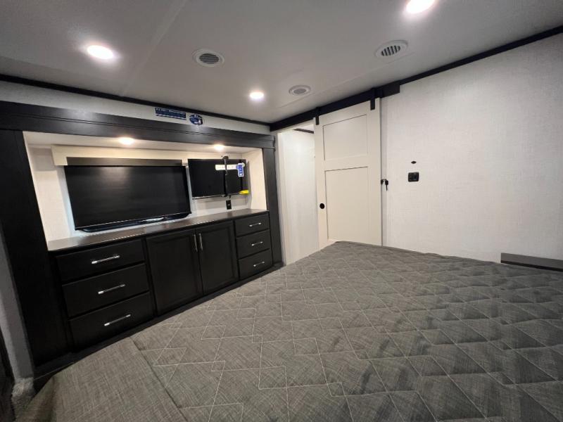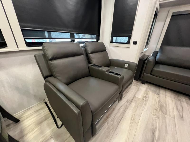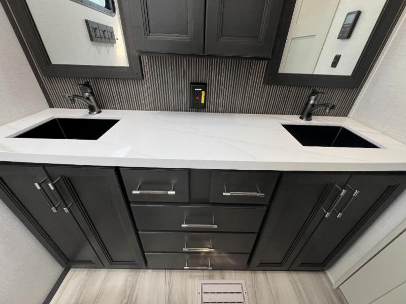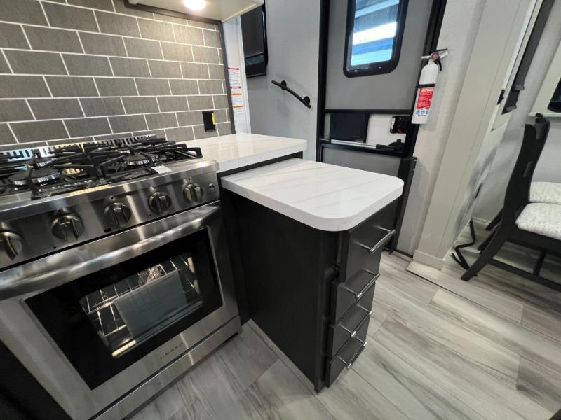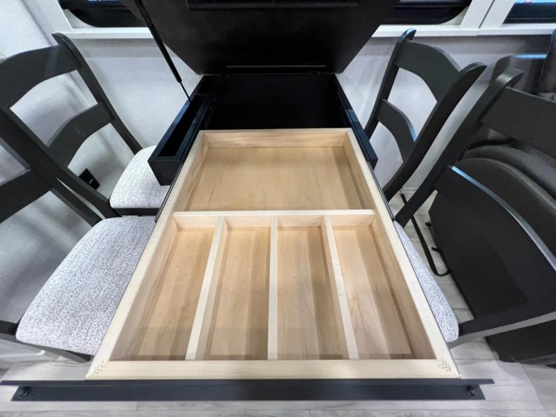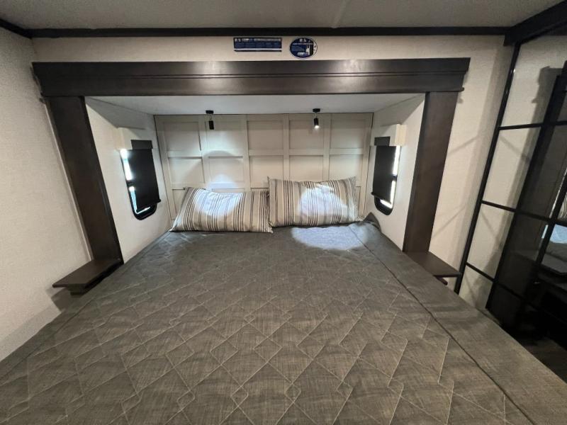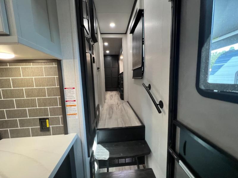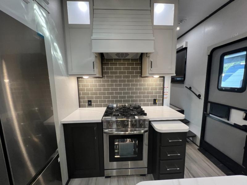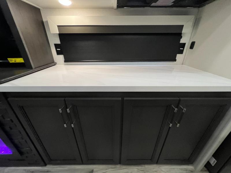 You will feel right at home camping in this fifth wheel! The chef will have lots of countertop space to prepare their best meals along with a kitchen island, two pull-out pantries to store your dishes, and an 18 cu. ft. residential refrigerator to store any leftovers. The free standing dinette offers a comfortable place to enjoy your meals, and the theater seating across from the fireplace and entertainment center will be perfect for movie nights. There is also a rear hide-a-bed sofa sleeper for any guests you may have. You will love the full bath that includes a shower with a seat, a linen closet, plus two bath sinks for convenience. And don't overlook the front bedroom with a sliding door, king bed slide out, and master closet for all your things. You'll also find stackable washer and dryer prep, two drawers, and a Smart HDTV for movies in bed.
