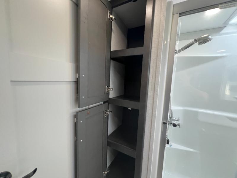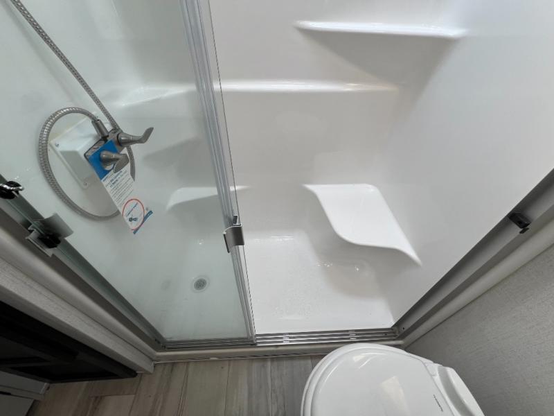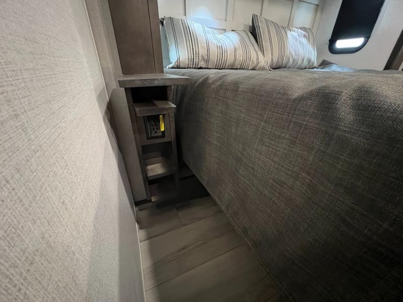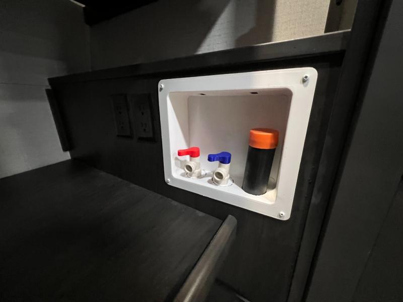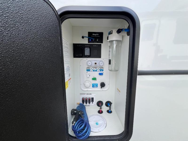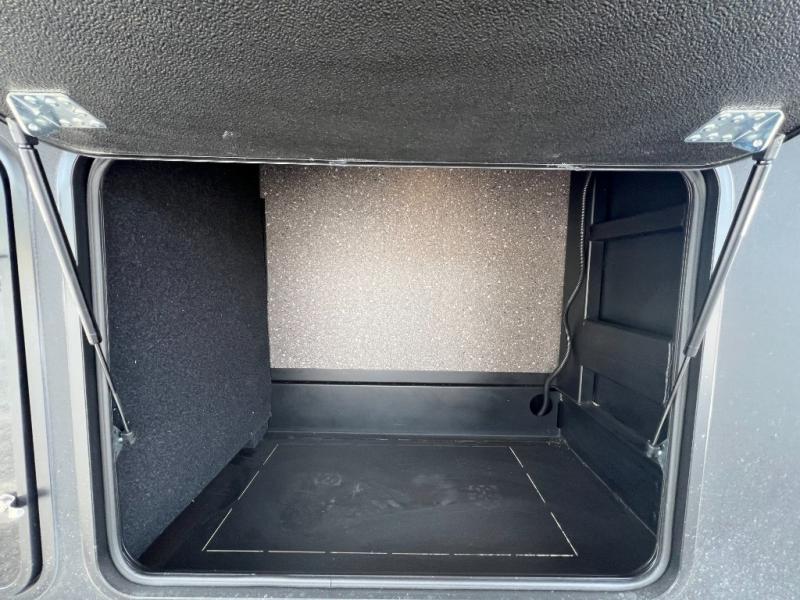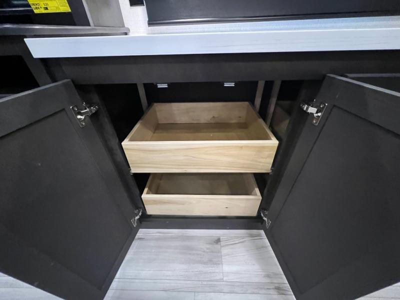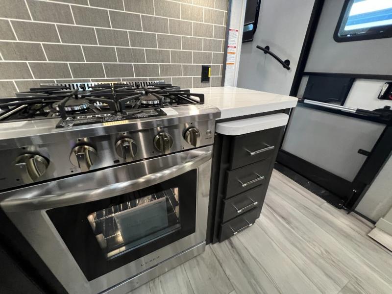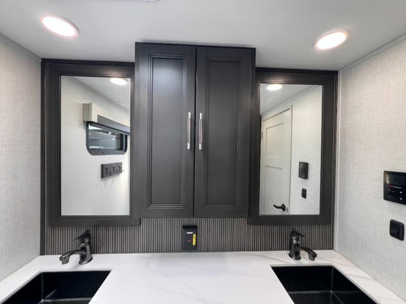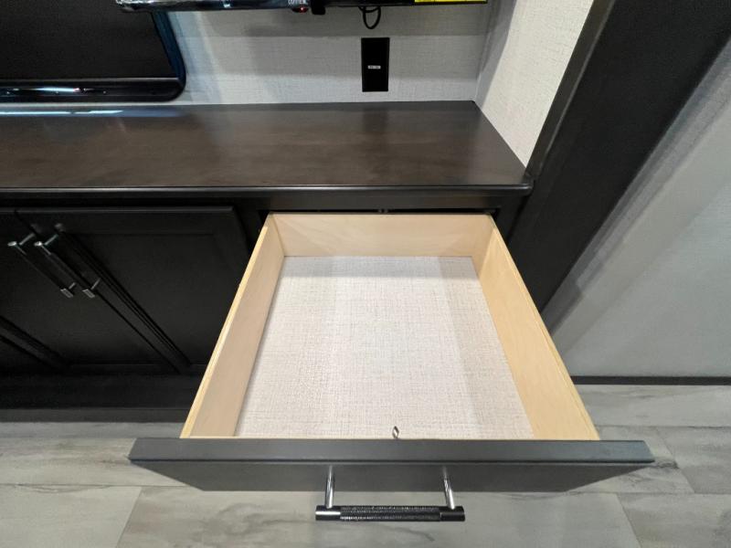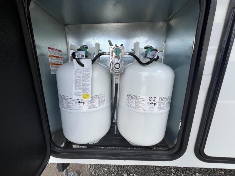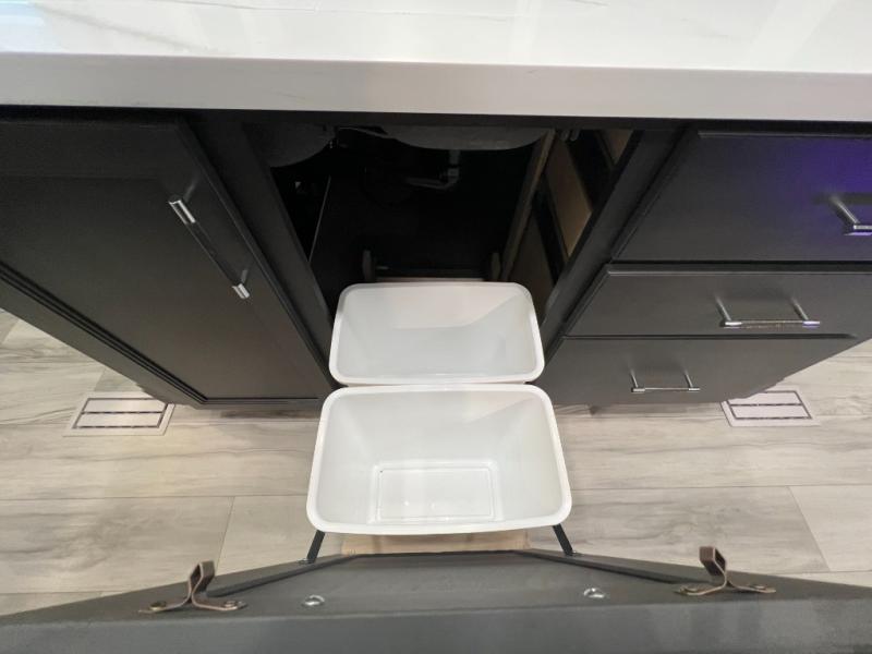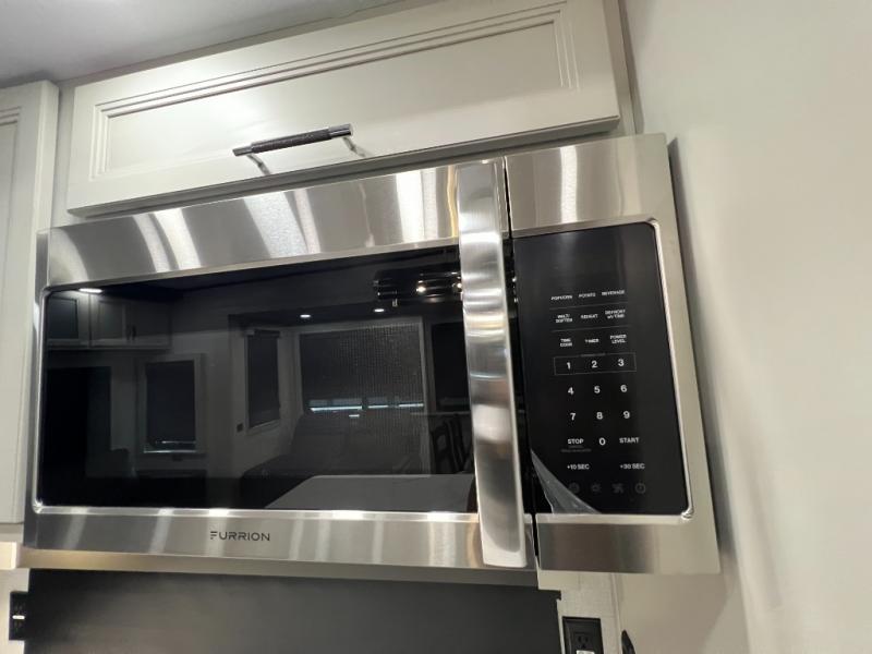 You will feel right at home camping in this fifth wheel! The chef will have lots of countertop space to prepare their best meals along with a kitchen island, two pull-out pantries to store your dishes, and an 18 cu. ft. residential refrigerator to store any leftovers. The free standing dinette offers a comfortable place to enjoy your meals, and the theater seating across from the fireplace and entertainment center will be perfect for movie nights. There is also a rear hide-a-bed sofa sleeper for any guests you may have. You will love the full bath that includes a shower with a seat, a linen closet, plus two bath sinks for convenience. And don't overlook the front bedroom with a sliding door, king bed slide out, and master closet for all your things. You'll also find stackable washer and dryer prep, two drawers, and a Smart HDTV for movies in bed.