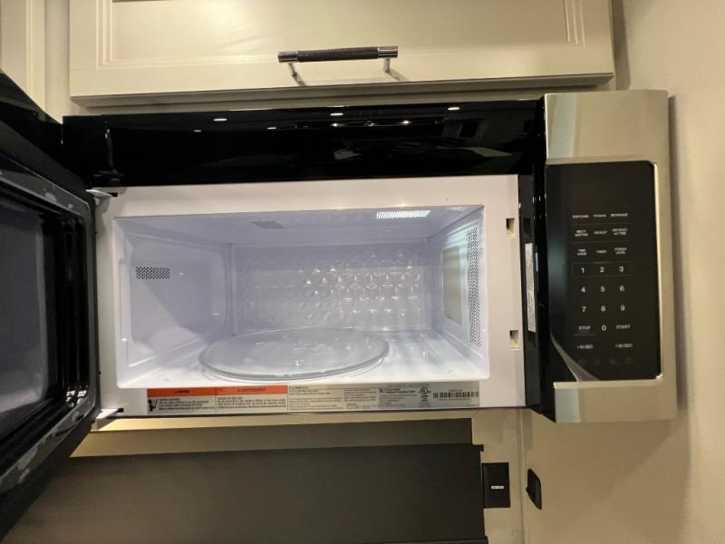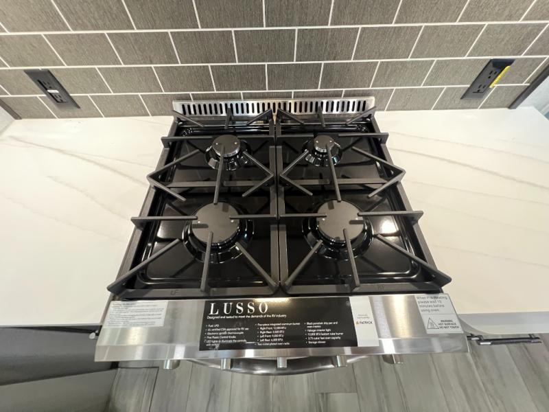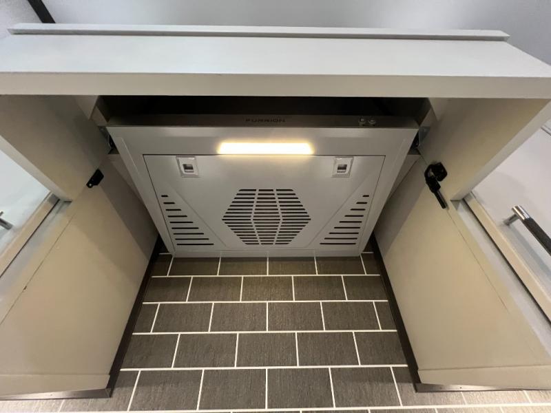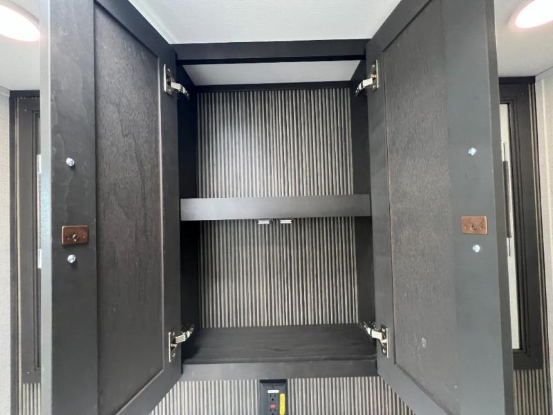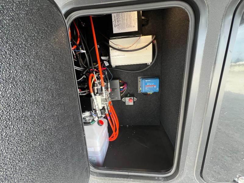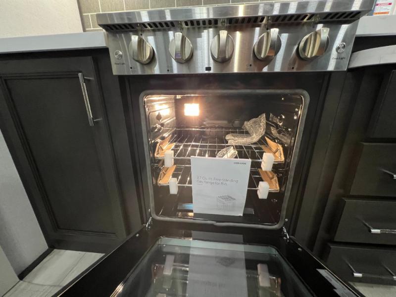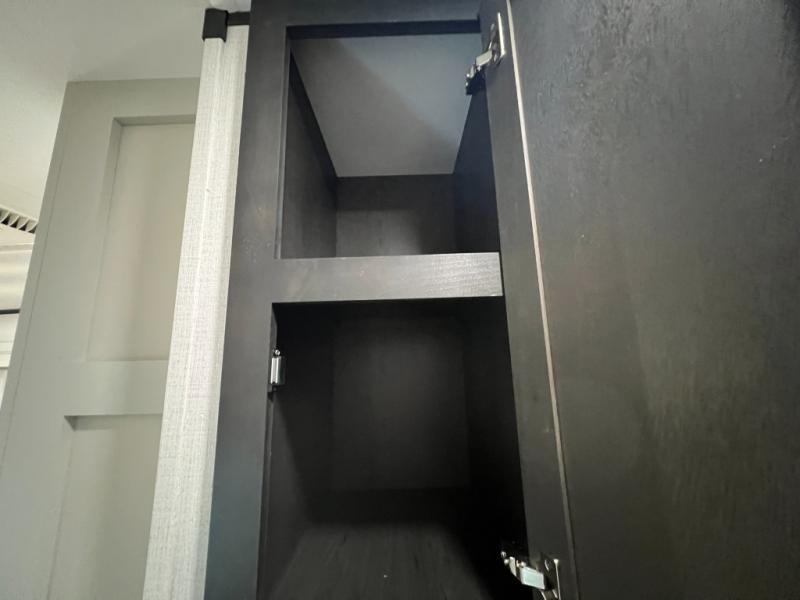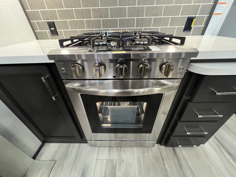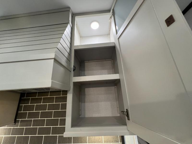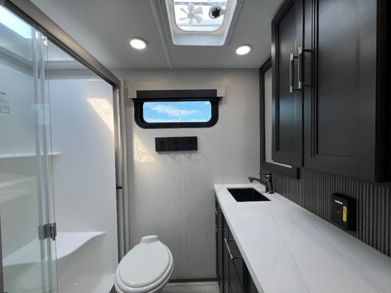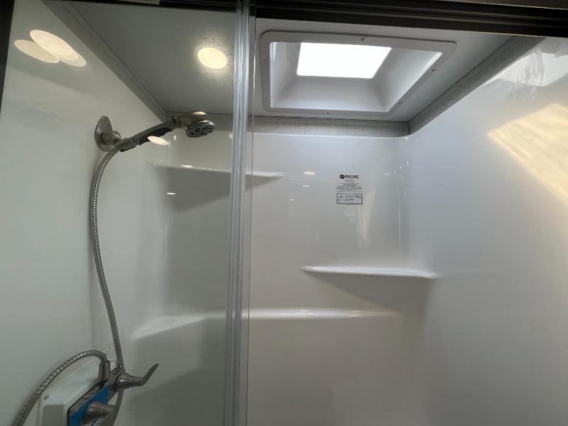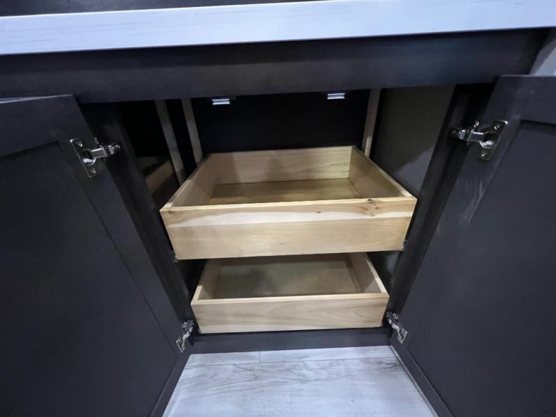 You will feel right at home camping in this fifth wheel! The chef will have lots of countertop space to prepare their best meals along with a kitchen island, two pull-out pantries to store your dishes, and an 18 cu. ft. residential refrigerator to store any leftovers. The free standing dinette offers a comfortable place to enjoy your meals, and the theater seating across from the fireplace and entertainment center will be perfect for movie nights. There is also a rear hide-a-bed sofa sleeper for any guests you may have. You will love the full bath that includes a shower with a seat, a linen closet, plus two bath sinks for convenience. And don't overlook the front bedroom with a sliding door, king bed slide out, and master closet for all your things. You'll also find stackable washer and dryer prep, two drawers, and a Smart HDTV for movies in bed.