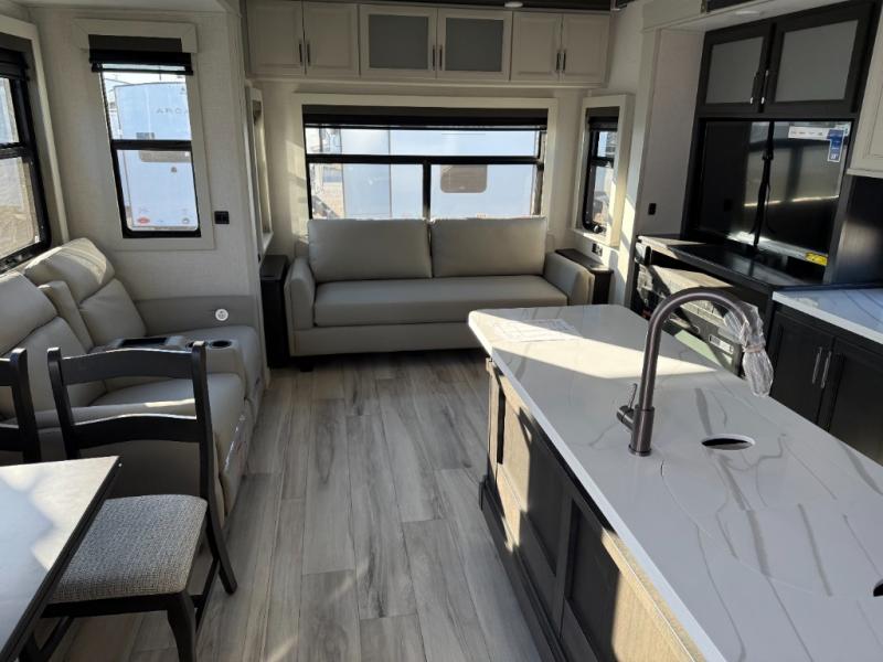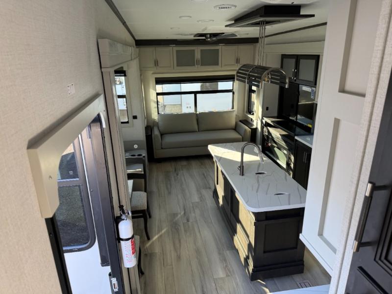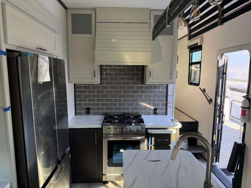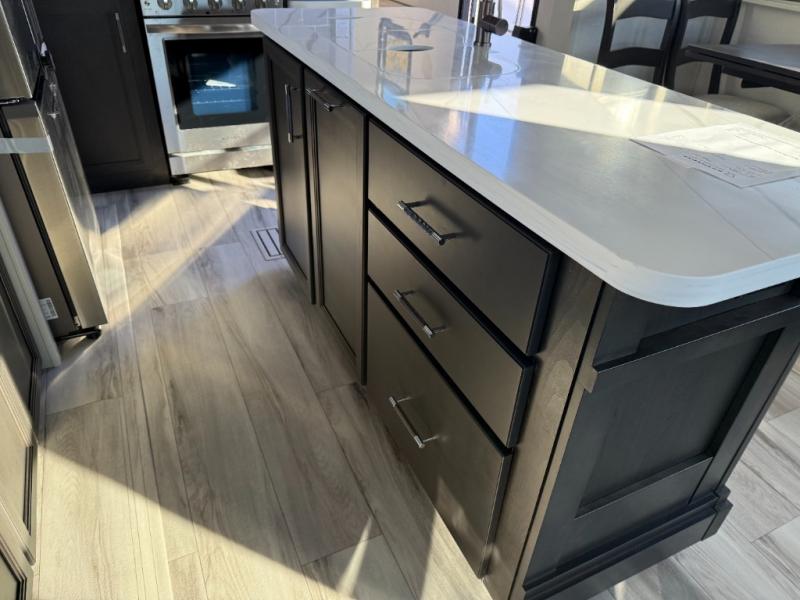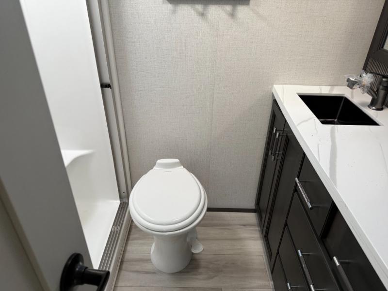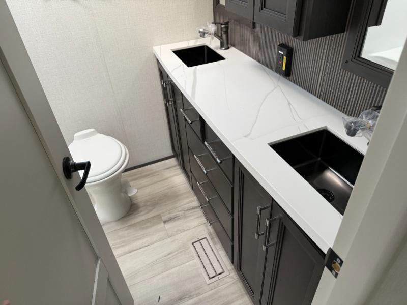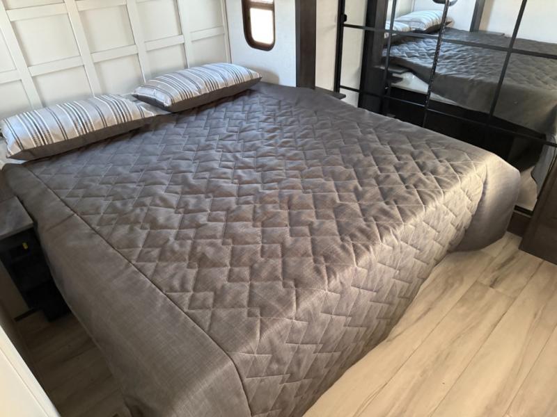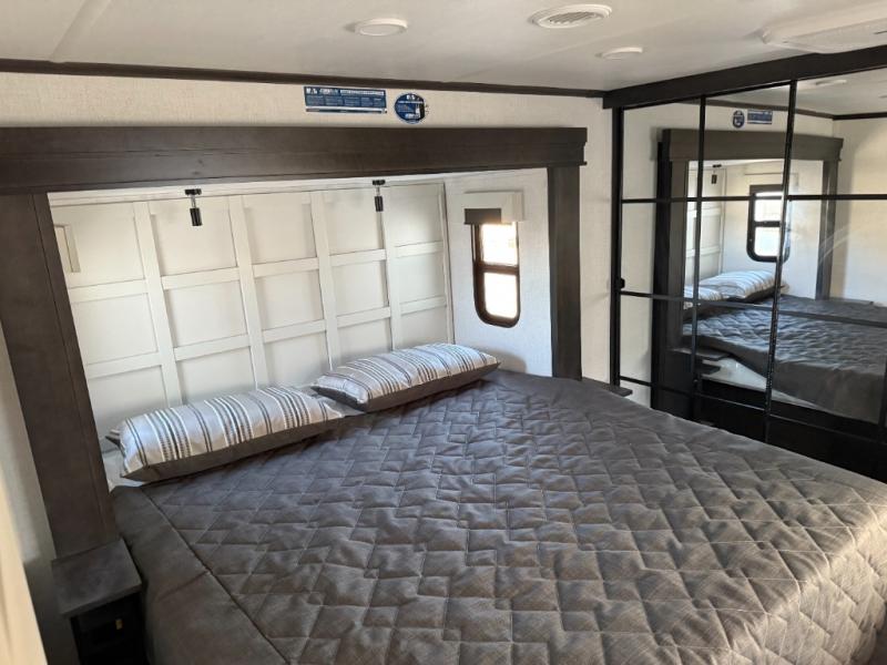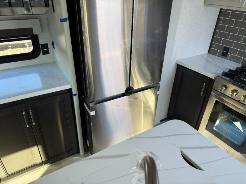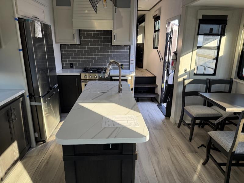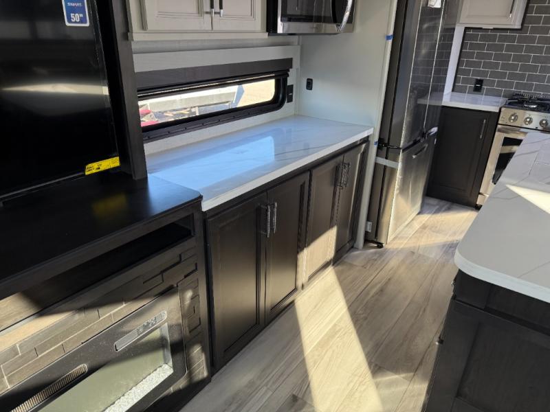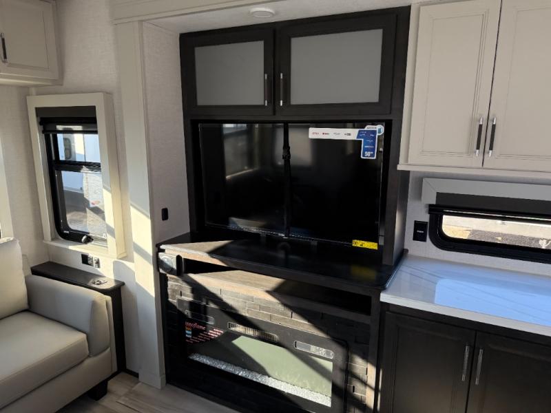 You will feel right at home camping in this fifth wheel! The chef will have lots of countertop space to prepare their best meals along with a kitchen island, two pull-out pantries to store your dishes, and an 18 cu. ft. residential refrigerator to store any leftovers. The free standing dinette offers a comfortable place to enjoy your meals, and the theater seating across from the fireplace and entertainment center will be perfect for movie nights. There is also a rear hide-a-bed sofa sleeper for any guests you may have. You will love the full bath that includes a shower with a seat, a linen closet, plus two bath sinks for convenience. And don't overlook the front bedroom with a sliding door, king bed slide out, and master closet for all your things. You'll also find stackable washer and dryer prep, two drawers, and a Smart HDTV for movies in bed.