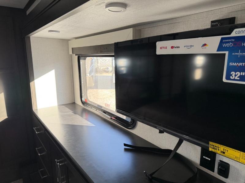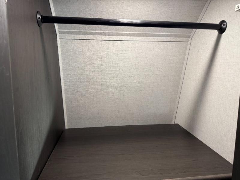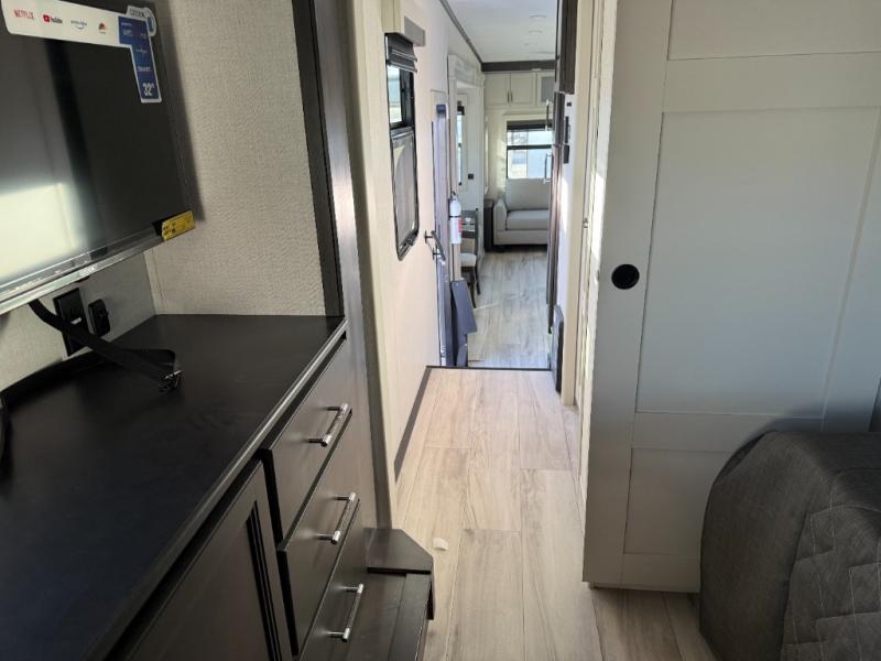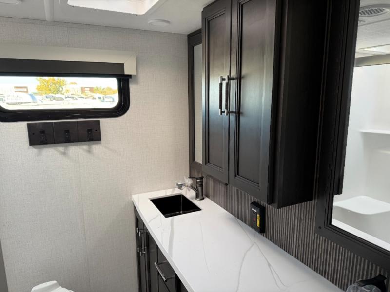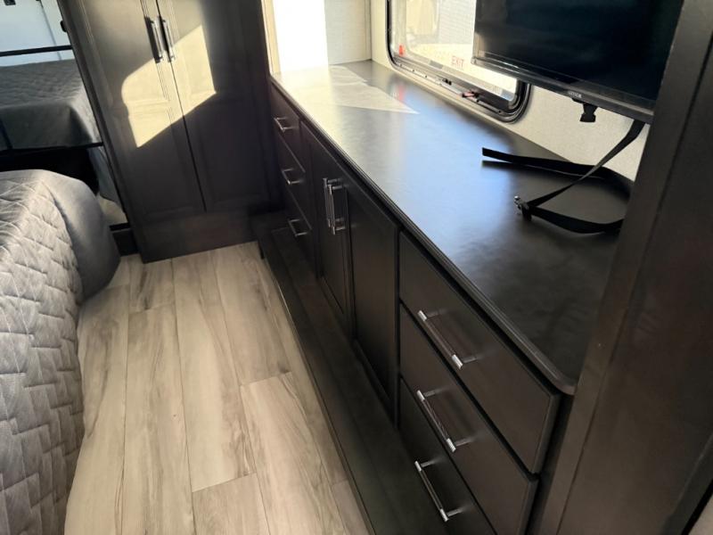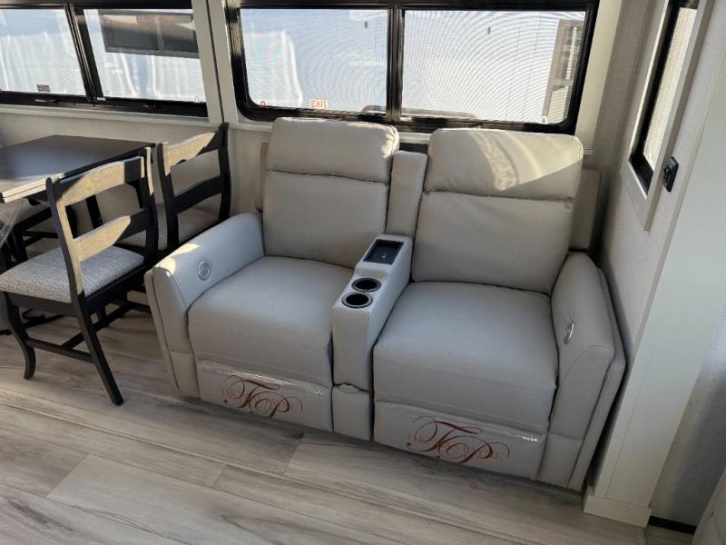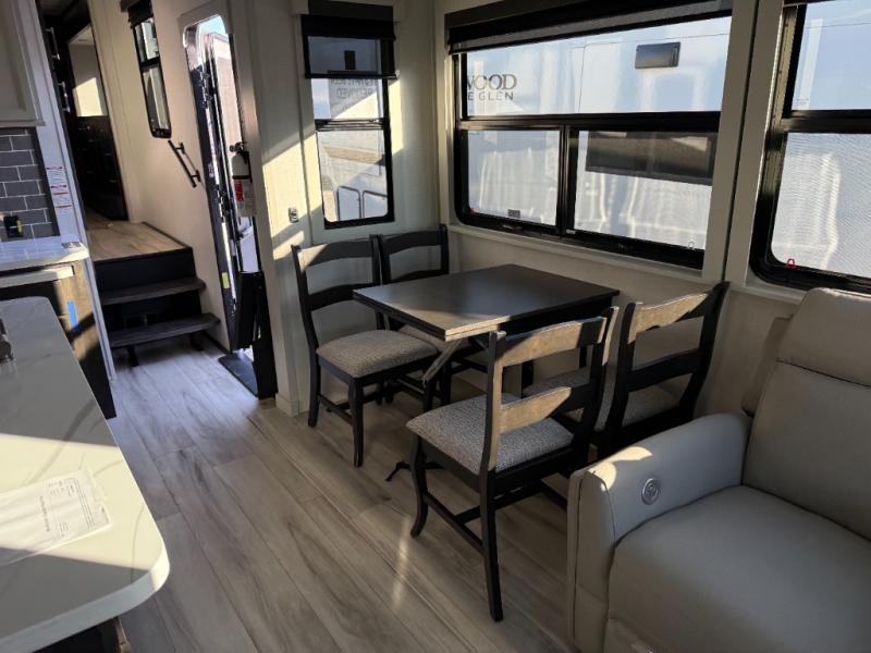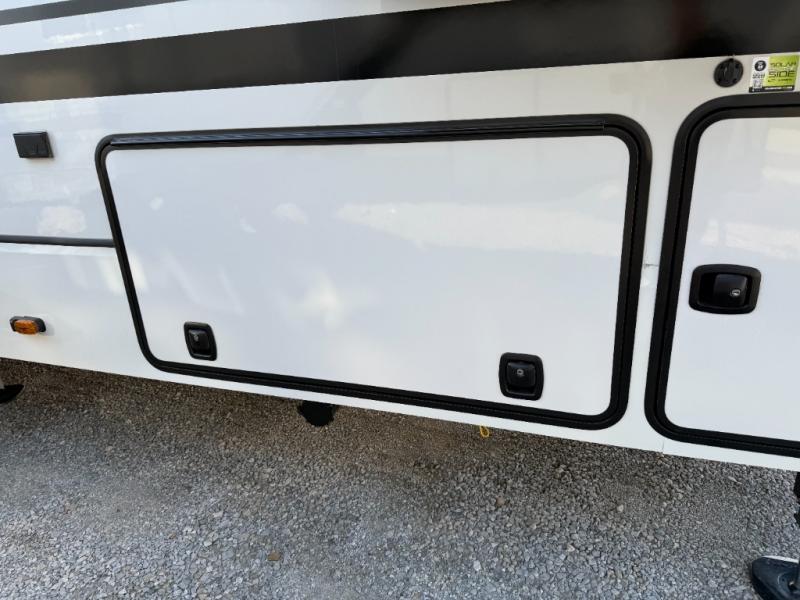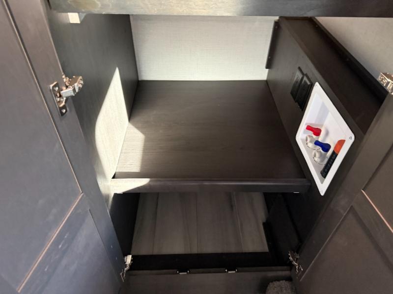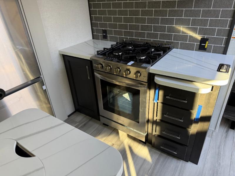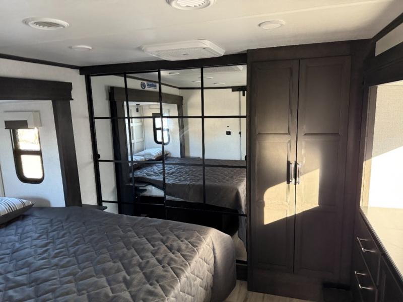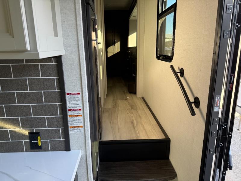 You will feel right at home camping in this fifth wheel! The chef will have lots of countertop space to prepare their best meals along with a kitchen island, two pull-out pantries to store your dishes, and an 18 cu. ft. residential refrigerator to store any leftovers. The free standing dinette offers a comfortable place to enjoy your meals, and the theater seating across from the fireplace and entertainment center will be perfect for movie nights. There is also a rear hide-a-bed sofa sleeper for any guests you may have. You will love the full bath that includes a shower with a seat, a linen closet, plus two bath sinks for convenience. And don't overlook the front bedroom with a sliding door, king bed slide out, and master closet for all your things. You'll also find stackable washer and dryer prep, two drawers, and a Smart HDTV for movies in bed.