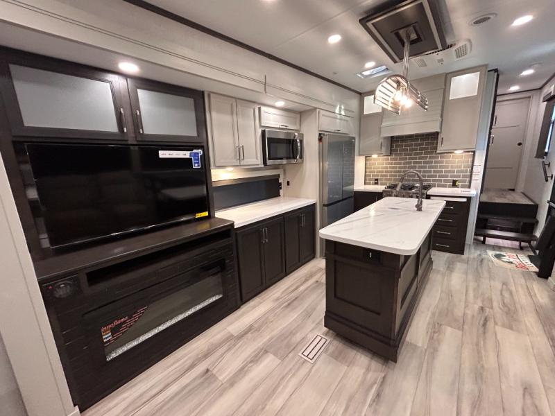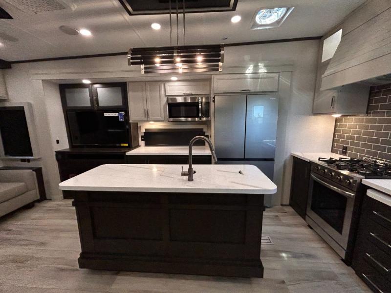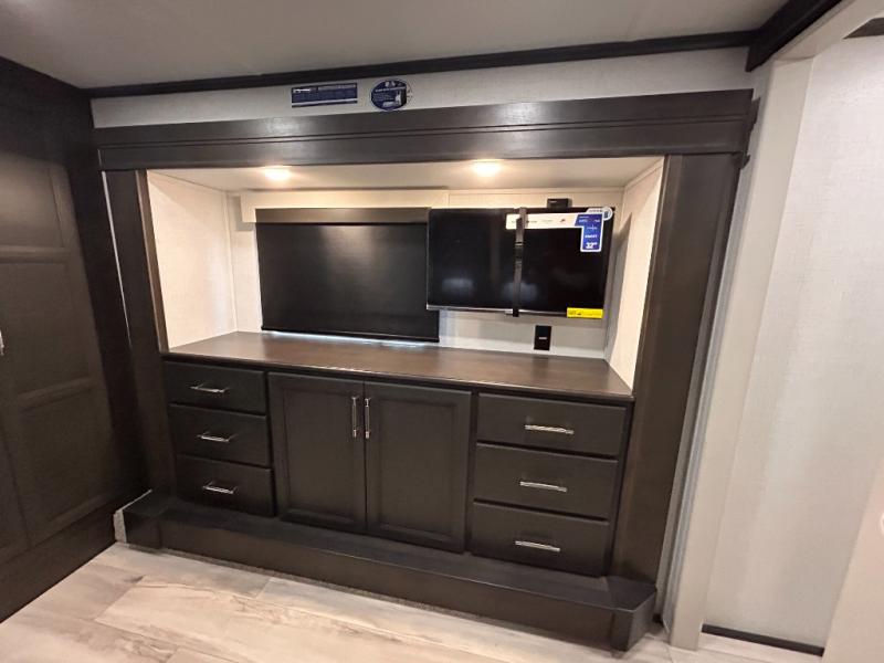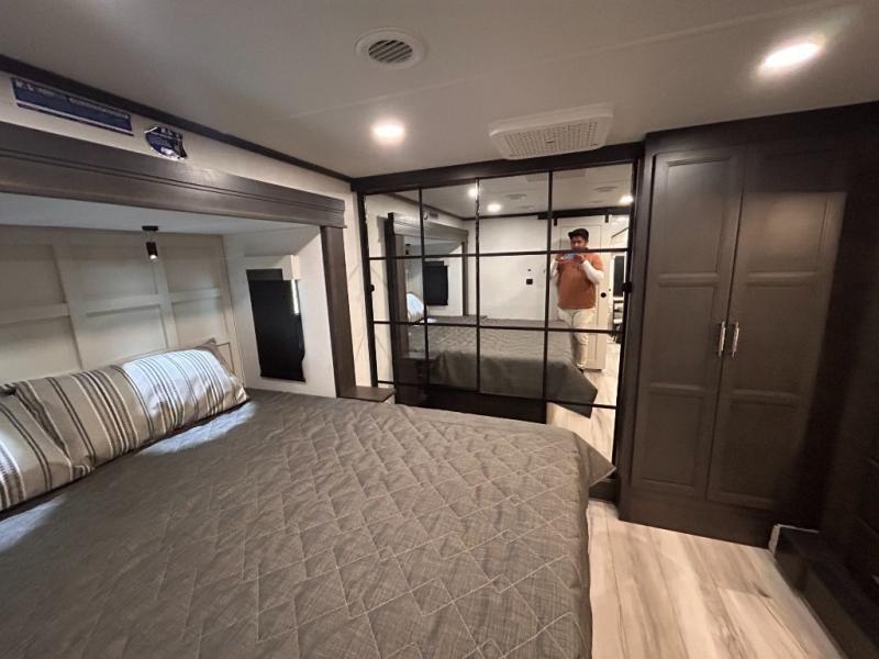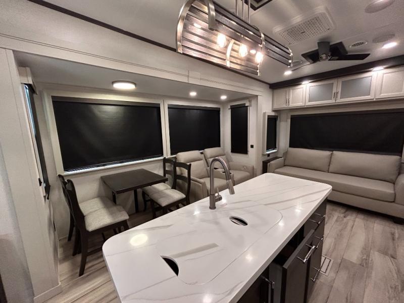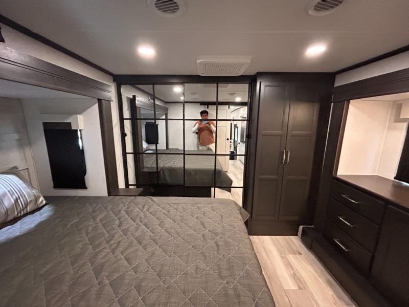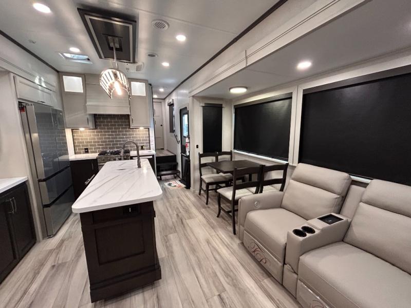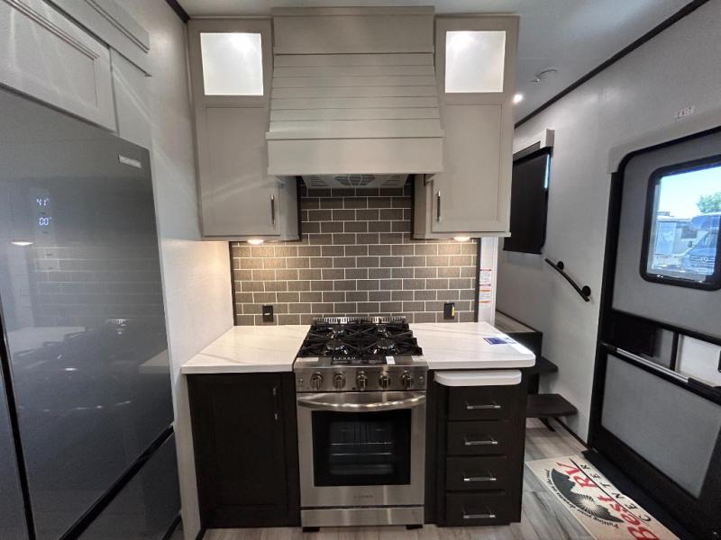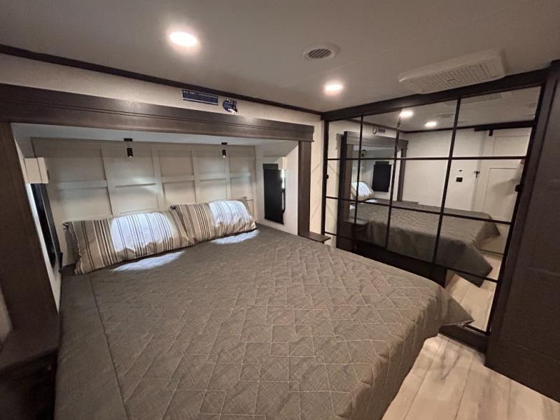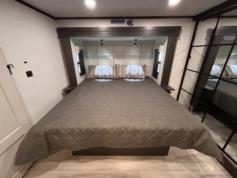 REAR LIVING/ AUTO LEVELING / KING BED / TRIPLE A/C PACKAGE / DUAL VANITY SINK/ TCS COIL SPRING/ SLIDE TOPPERS/ 440W SOLAR & 2000W INVERTER!!