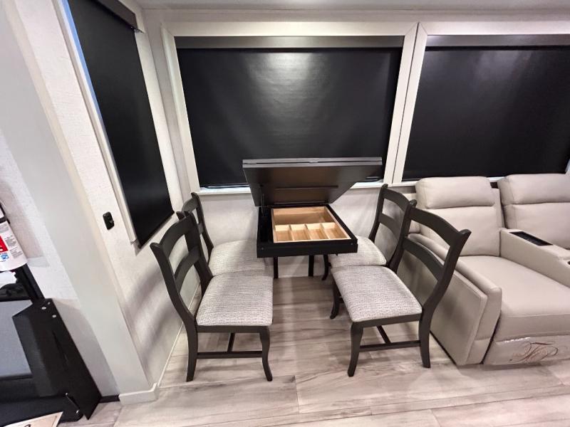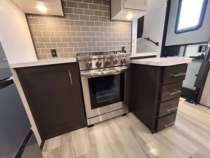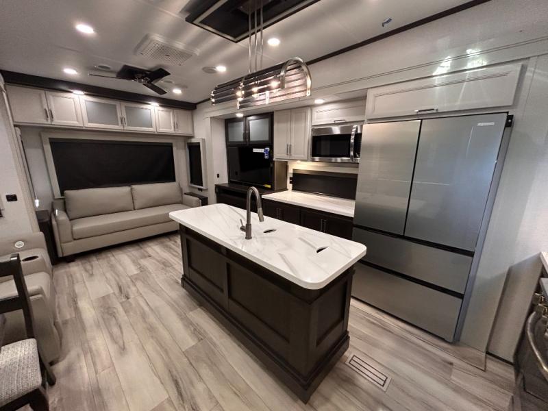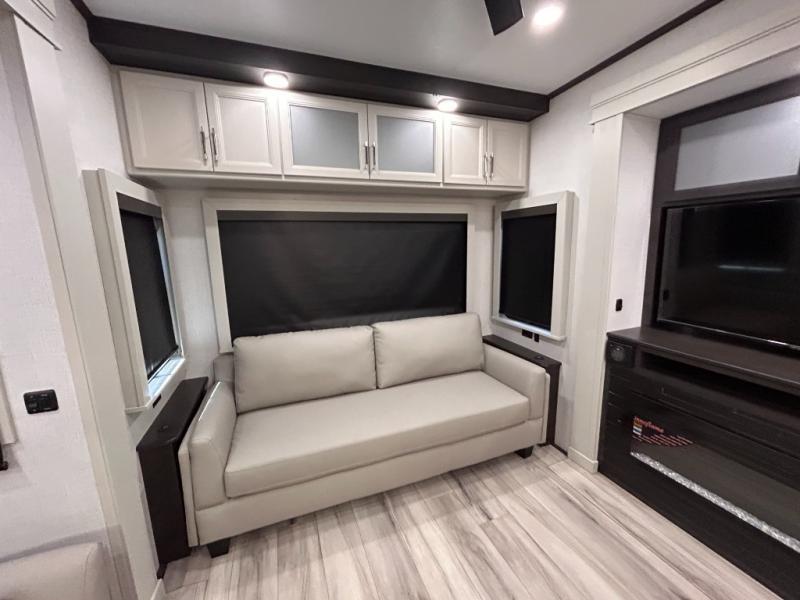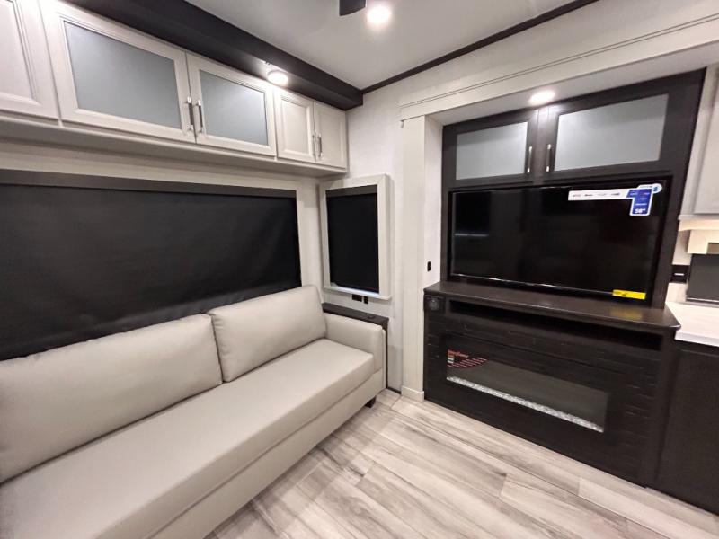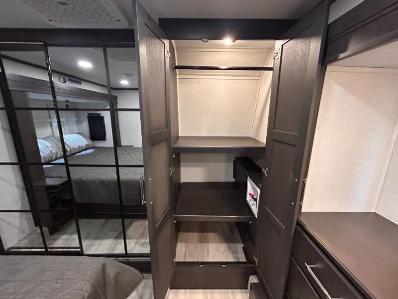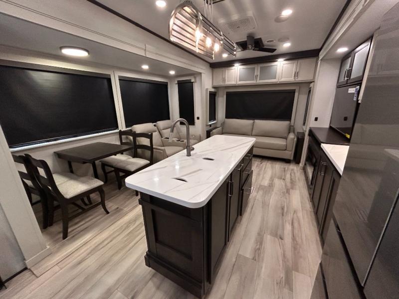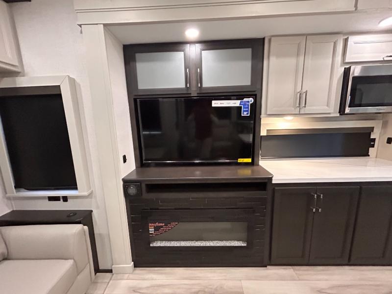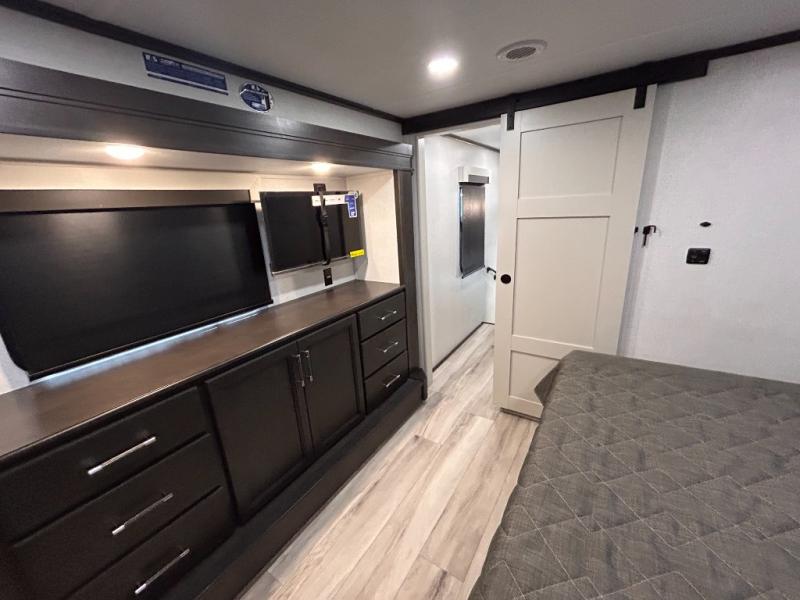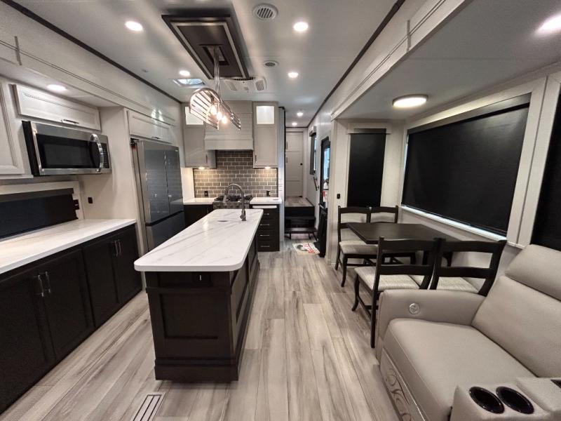 REAR LIVING/ AUTO LEVELING / KING BED / TRIPLE A/C PACKAGE / DUAL VANITY SINK/ TCS COIL SPRING/ SLIDE TOPPERS/ 440W SOLAR & 2000W INVERTER!!