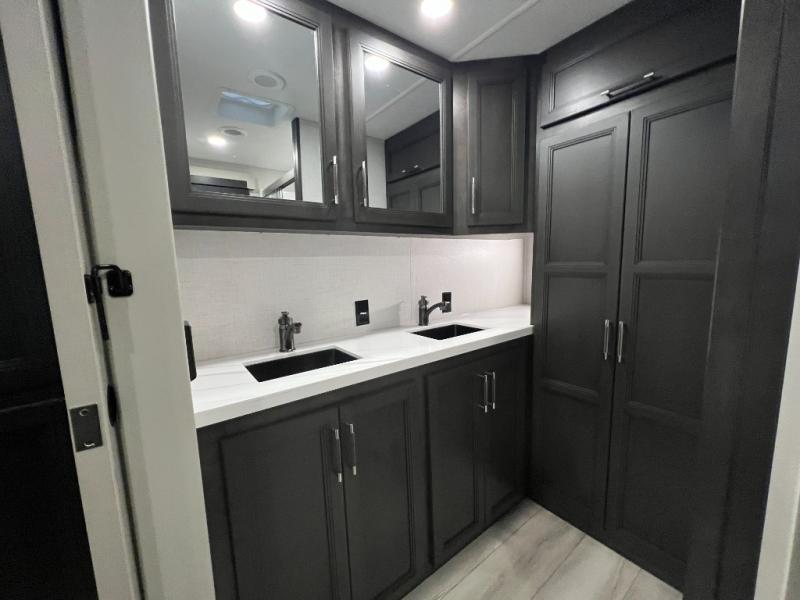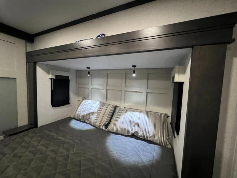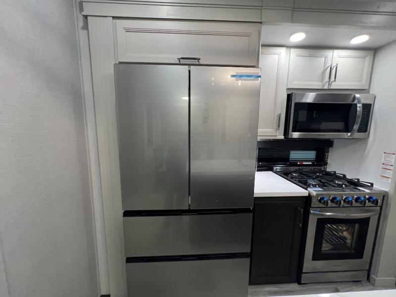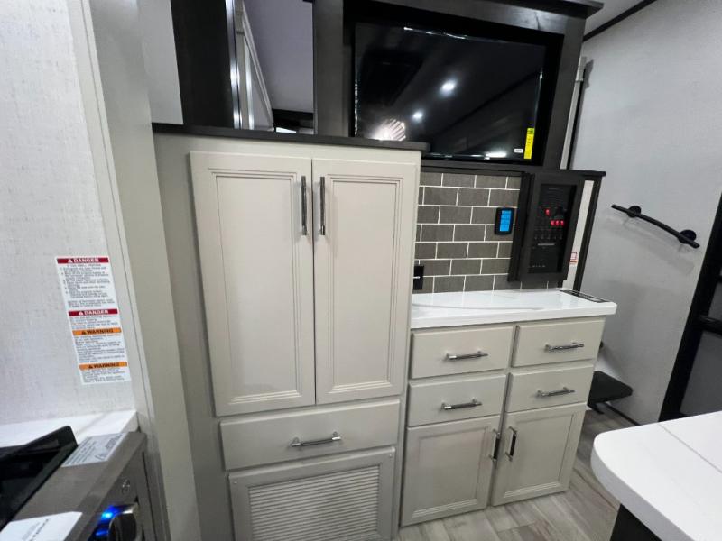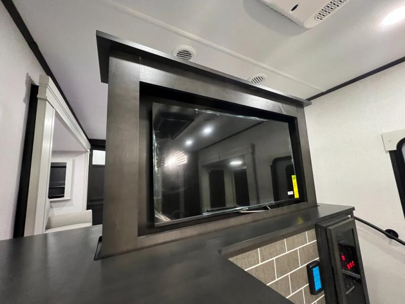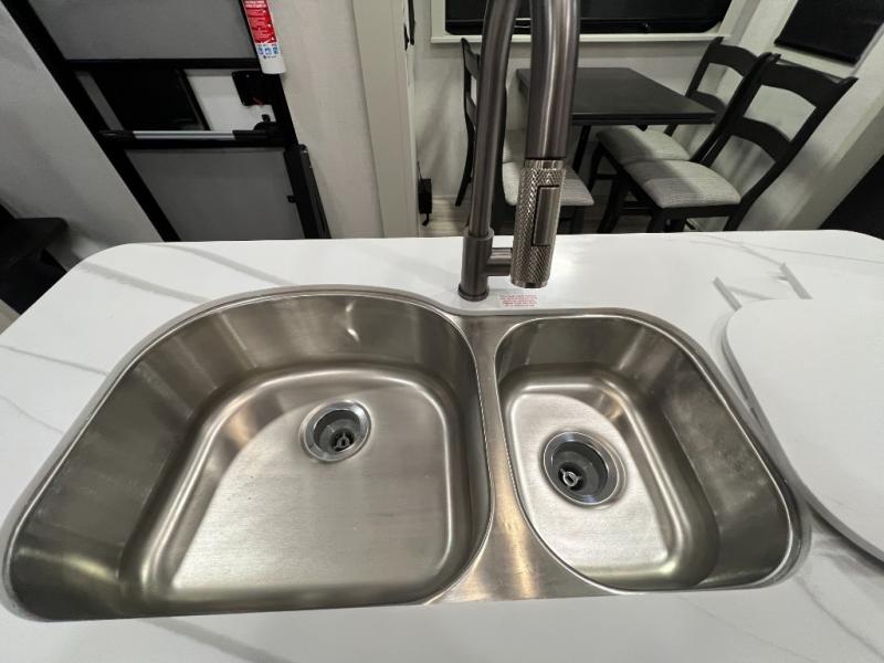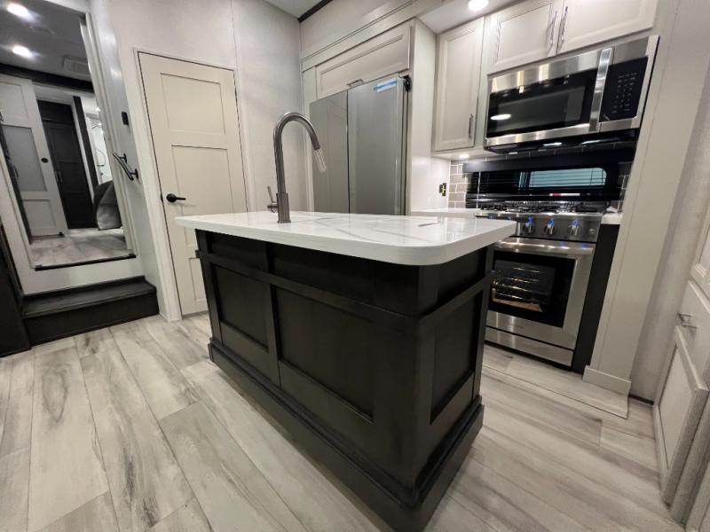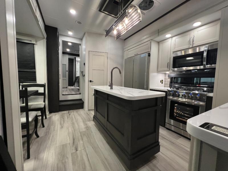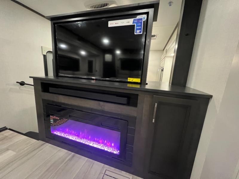 Find the comfort and luxury in this fifth wheel! Imagine your morning coffee on the spacious middle kitchen, and prepping your favorite breakfast on your kitchen island with a sink, making for a good meal-prep zone for endless cooking possibilities. You can start your favorite movie queued up in the living room with dual hide-a-bed sofas and a fireplace that sets the mood for comfort and delight every day. When it is time to unwind, your private rear bedroom welcomes you with a king bed, smart storage, and soft lighting that turns travel into rest, featuring a master bathroom with all you need to freshen up and treat yourself with plenty of storage, a dual sink vanity, and space for a washer/dryer prep for your convenience.