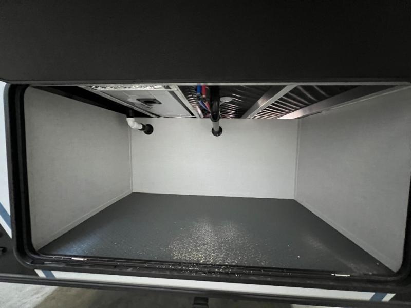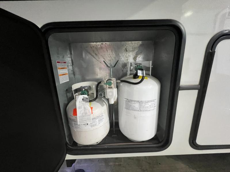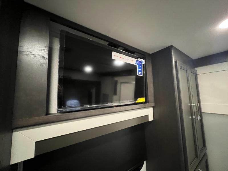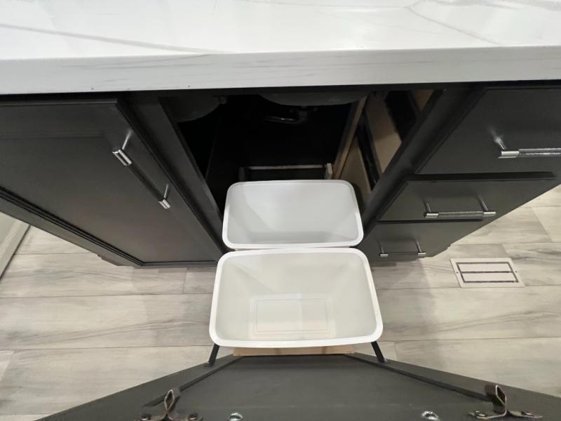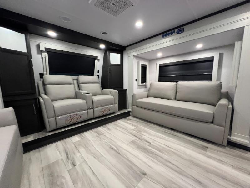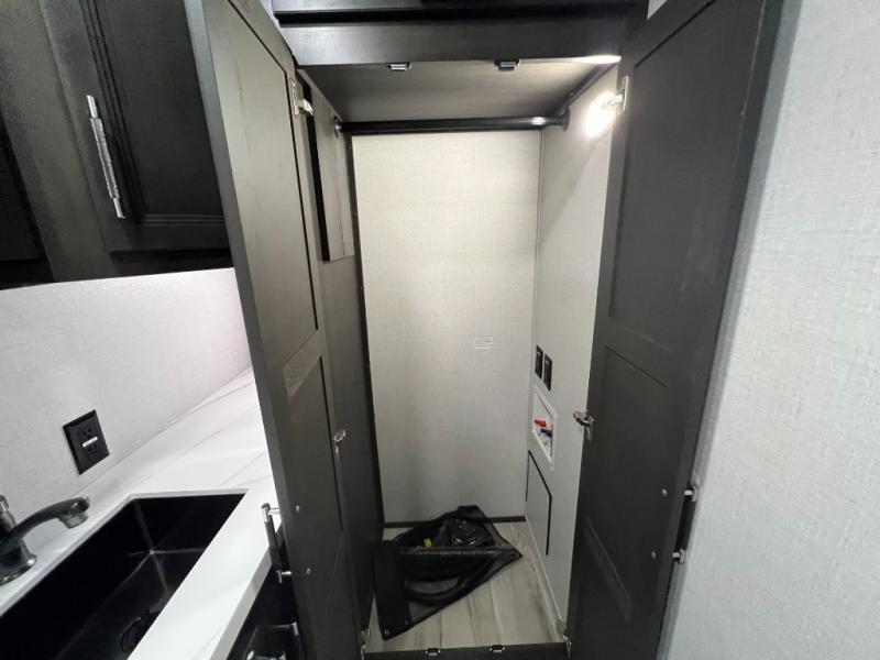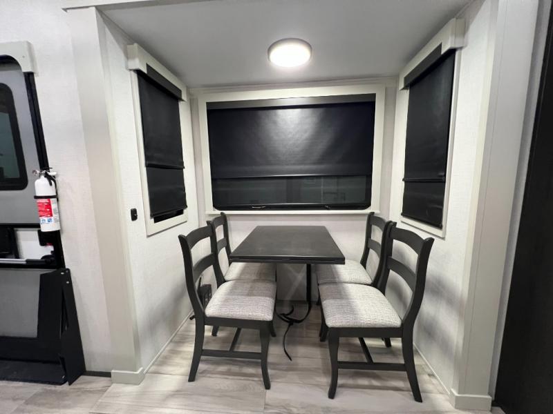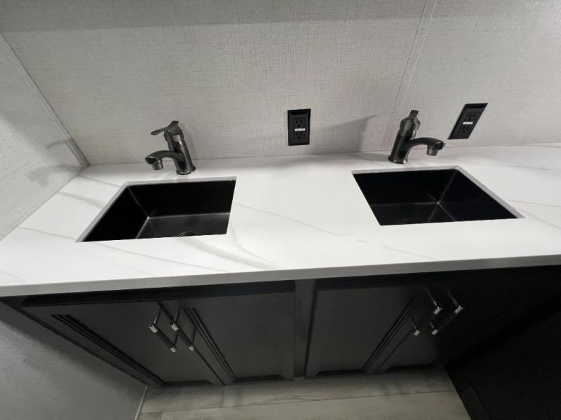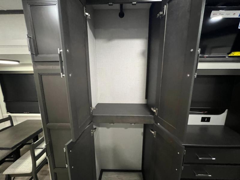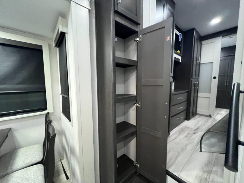 Find the comfort and luxury in this fifth wheel! Imagine your morning coffee on the spacious middle kitchen, and prepping your favorite breakfast on your kitchen island with a sink, making for a good meal-prep zone for endless cooking possibilities. You can start your favorite movie queued up in the living room with dual hide-a-bed sofas and a fireplace that sets the mood for comfort and delight every day. When it is time to unwind, your private rear bedroom welcomes you with a king bed, smart storage, and soft lighting that turns travel into rest, featuring a master bathroom with all you need to freshen up and treat yourself with plenty of storage, a dual sink vanity, and space for a washer/dryer prep for your convenience.