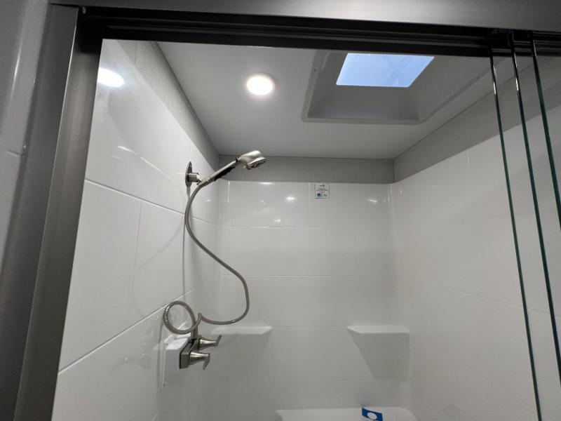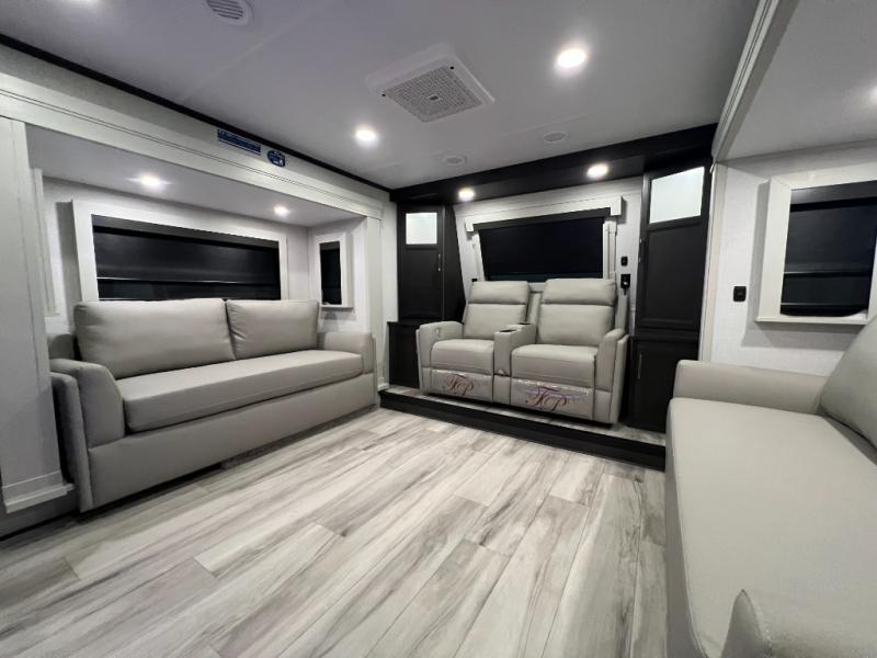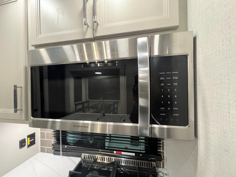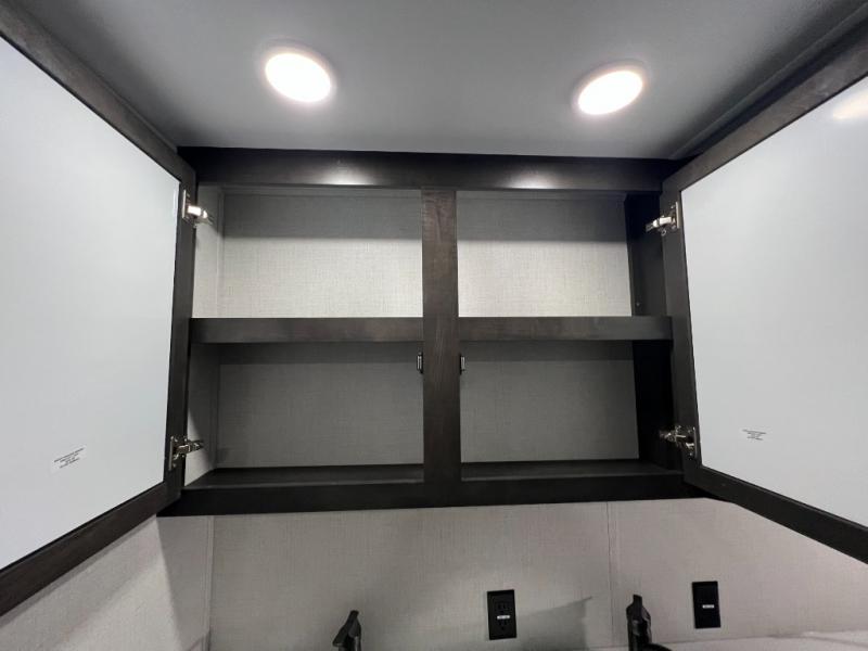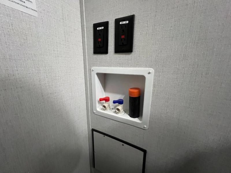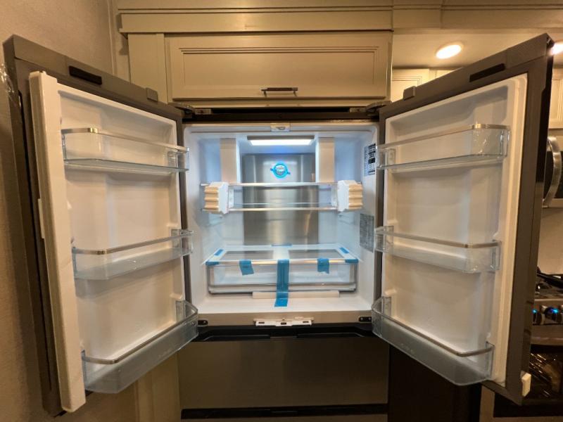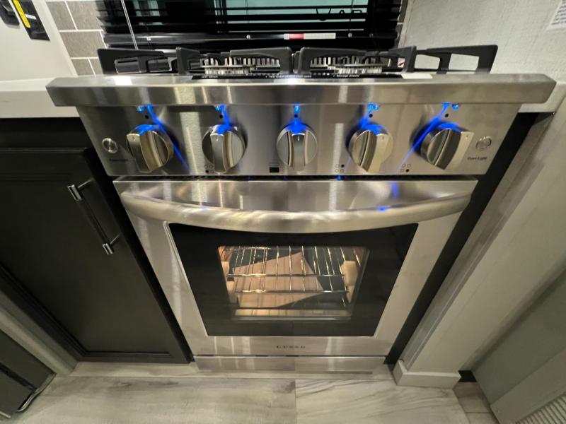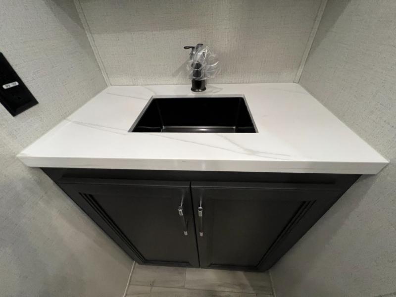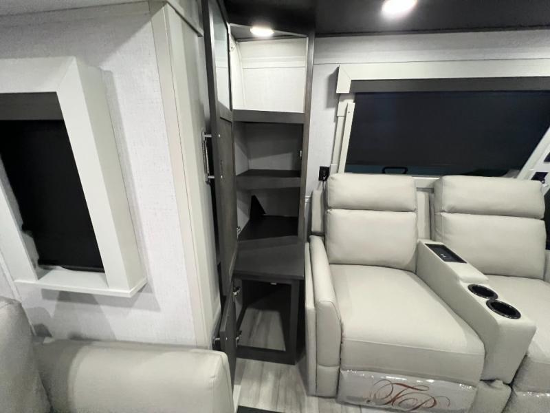 Find the comfort and luxury in this fifth wheel! Imagine your morning coffee on the spacious middle kitchen, and prepping your favorite breakfast on your kitchen island with a sink, making for a good meal-prep zone for endless cooking possibilities. You can start your favorite movie queued up in the living room with dual hide-a-bed sofas and a fireplace that sets the mood for comfort and delight every day. When it is time to unwind, your private rear bedroom welcomes you with a king bed, smart storage, and soft lighting that turns travel into rest, featuring a master bathroom with all you need to freshen up and treat yourself with plenty of storage, a dual sink vanity, and space for a washer/dryer prep for your convenience.