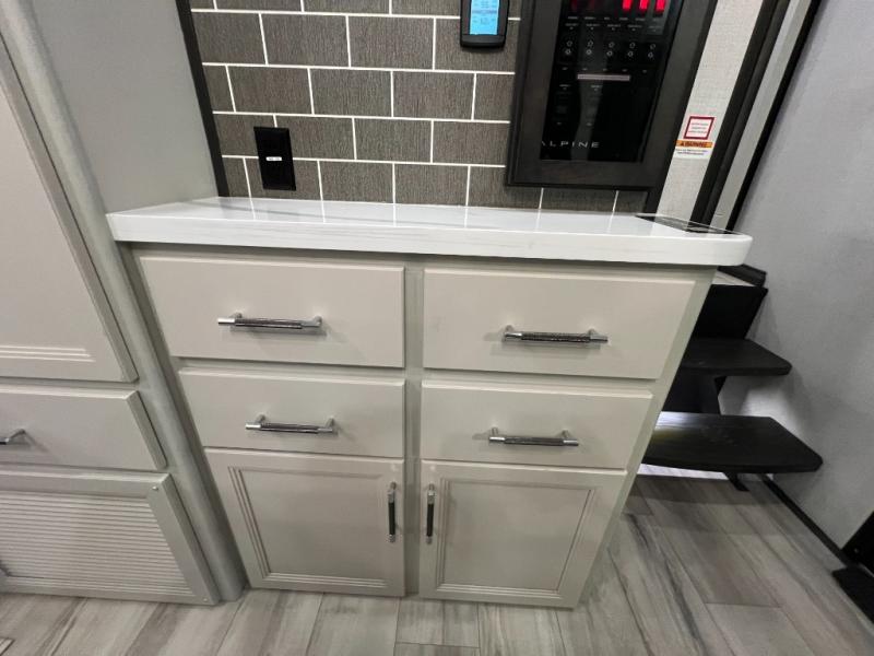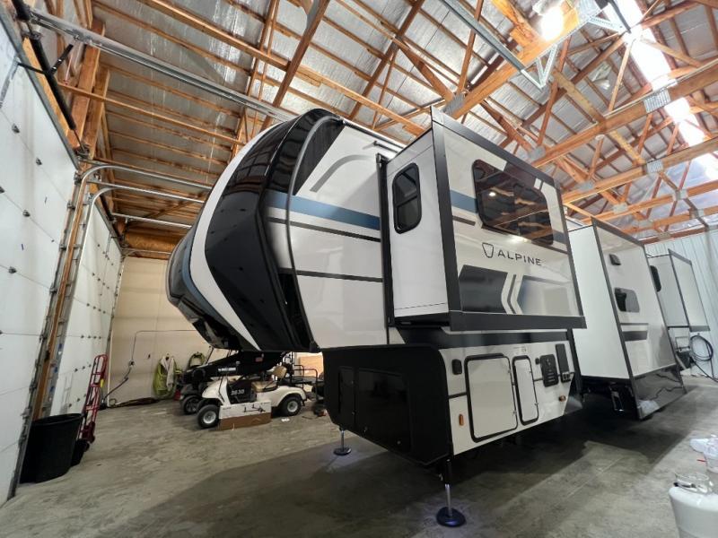 Luxury is not an option, it is a standard with each one of these Keystone RV Alpine fifth wheels! A 8' 4" wide body construction will create an open, residential feeling, and cutting-edge technology will provide a hassle-free camping experience. The Tru-Fit slide construction is more durable and minimizes motor structural stress, as well as resists leaking, and the Blade Pure airflow system provides residential comfort with its high-performance. Each fifth wheel includes designer flooring throughout, stunning solid wood cabinet doors, luxurious crown molding, and solid surface countertops in the kitchen. The exterior also includes an outside shower with hot and cold water, Lippert strut assisted SolidSteps, Hitch Vision with LED lighting, and many more conveniences!