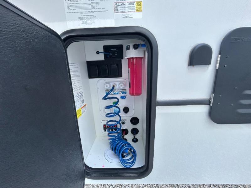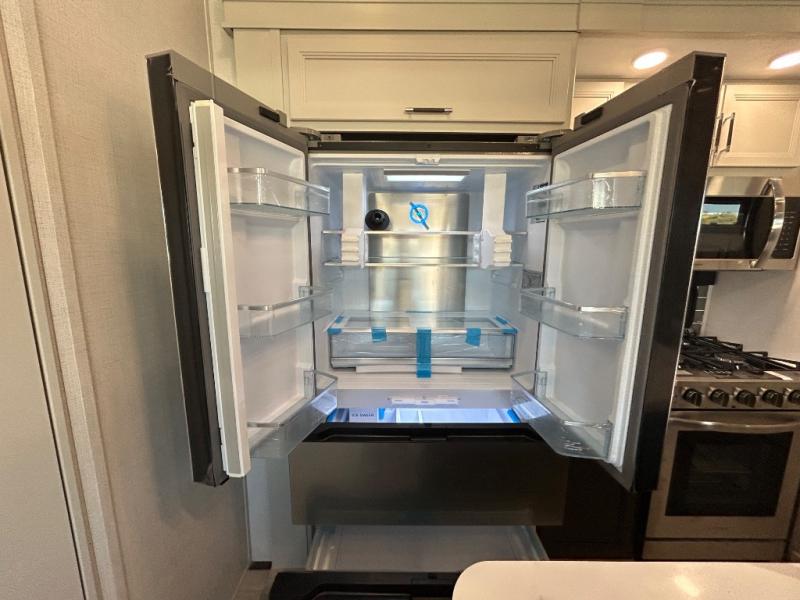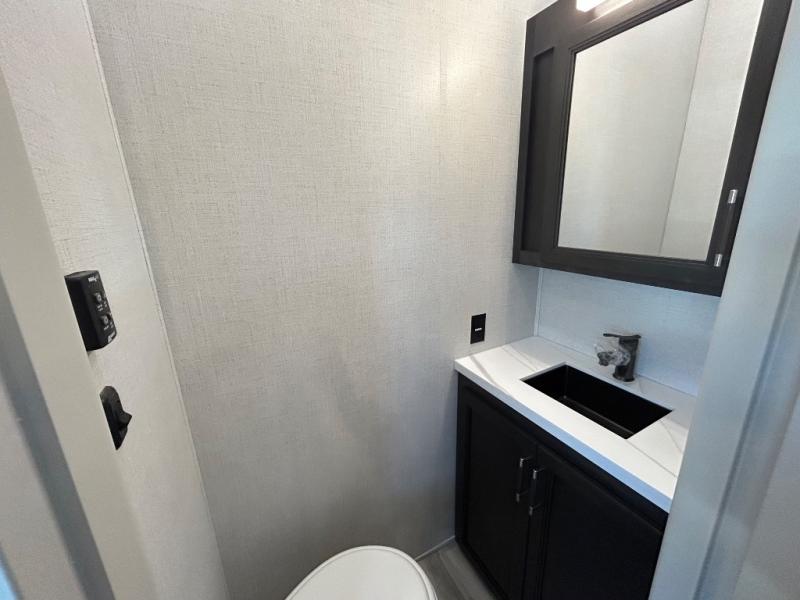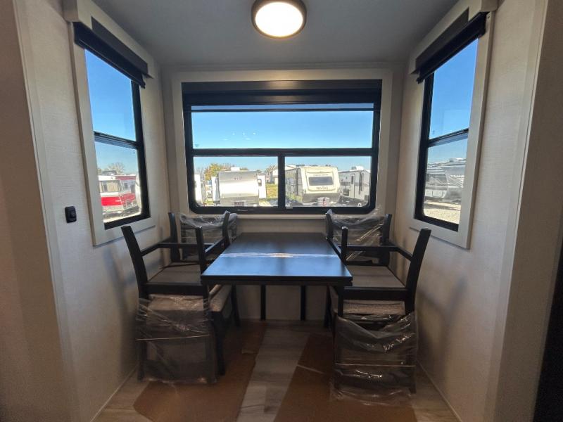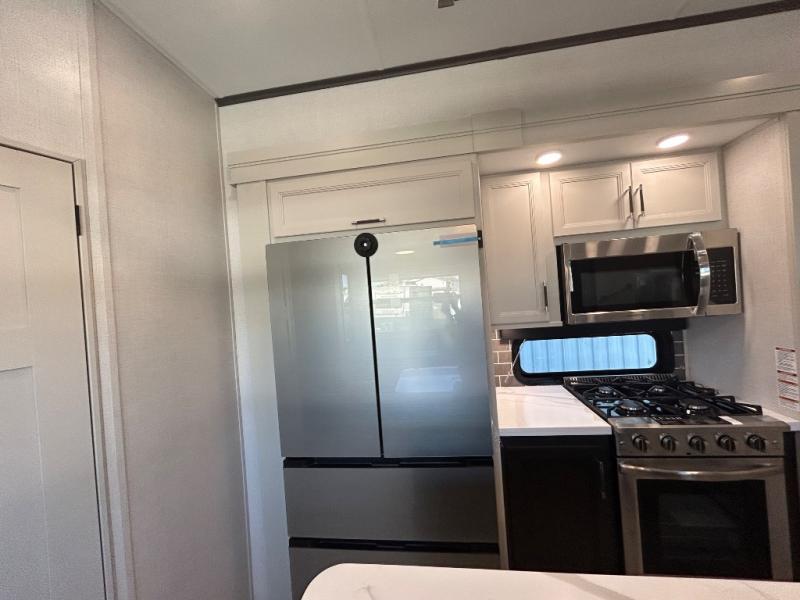 Find the comfort and luxury in this fifth wheel! Imagine your morning coffee on the spacious middle kitchen, and prepping your favorite breakfast on your kitchen island with a sink, making for a good meal-prep zone for endless cooking possibilities. You can start your favorite movie queued up in the living room with dual hide-a-bed sofas and a fireplace that sets the mood for comfort and delight every day. When it is time to unwind, your private rear bedroom welcomes you with a king bed, smart storage, and soft lighting that turns travel into rest, featuring a master bathroom with all you need to freshen up and treat yourself with plenty of storage, a dual sink vanity, and space for a washer/dryer prep for your convenience.