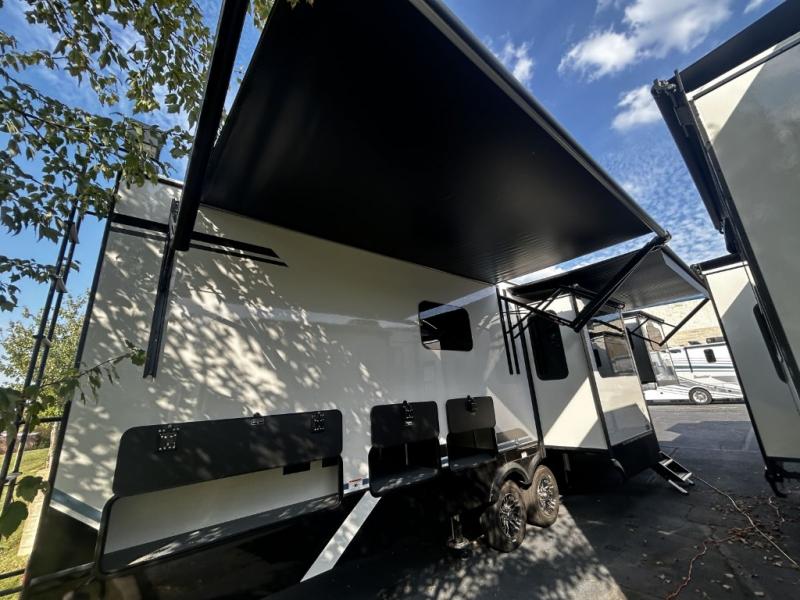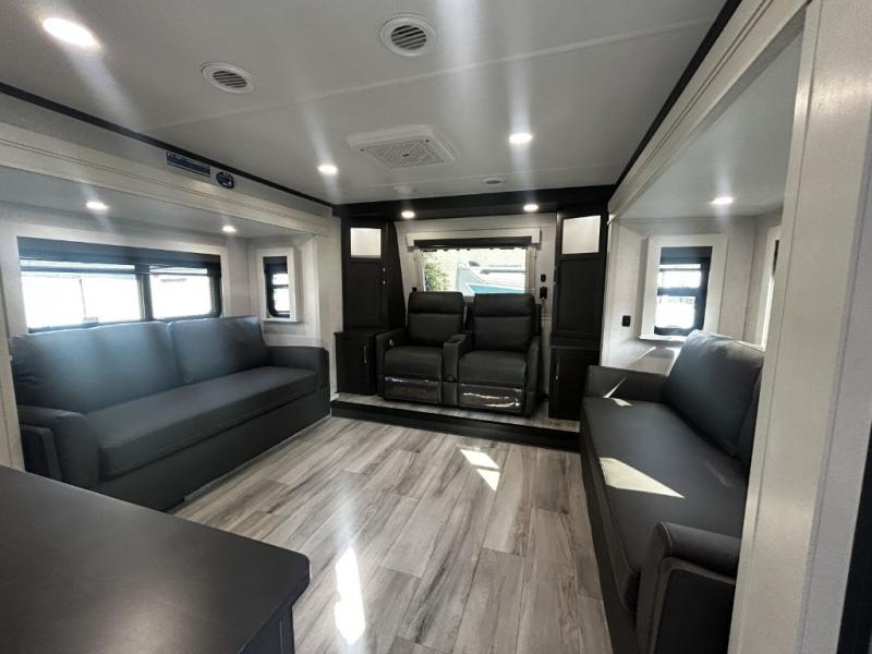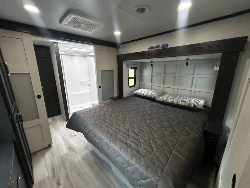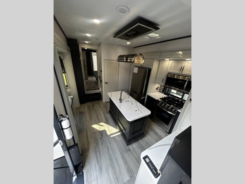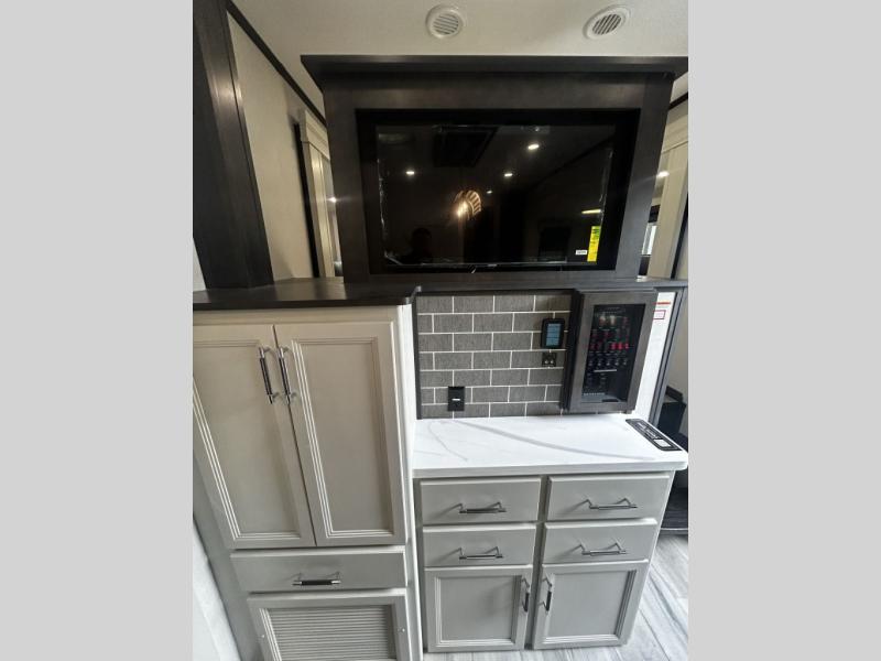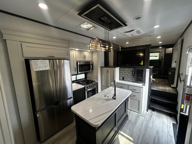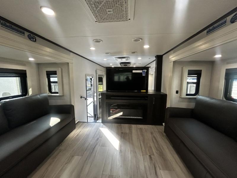 Find the comfort and luxury in this fifth wheel! Imagine your morning coffee on the spacious middle kitchen, and prepping your favorite breakfast on your kitchen island with a sink, making for a good meal-prep zone for endless cooking possibilities. You can start your favorite movie queued up in the living room with dual hide-a-bed sofas and a fireplace that sets the mood for comfort and delight every day. When it is time to unwind, your private rear bedroom welcomes you with a king bed, smart storage, and soft lighting that turns travel into rest, featuring a master bathroom with all you need to freshen up and treat yourself with plenty of storage, a dual sink vanity, and space for a washer/dryer prep for your convenience.