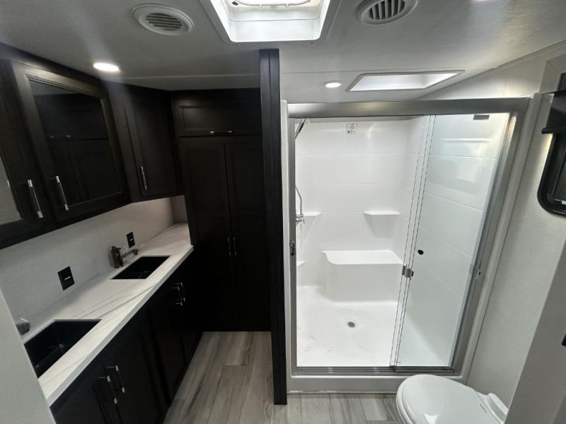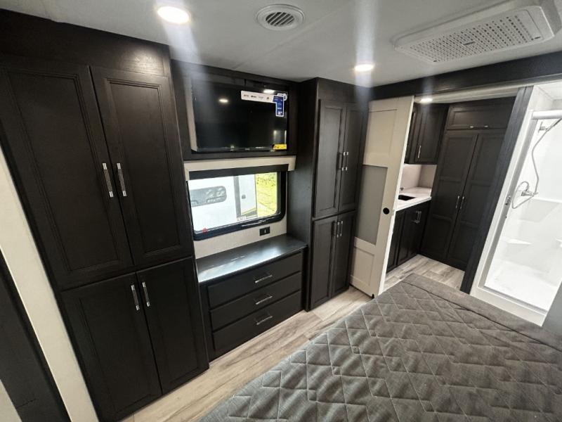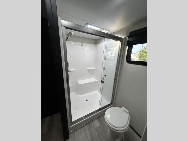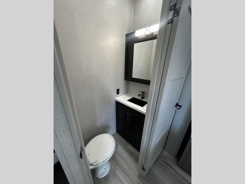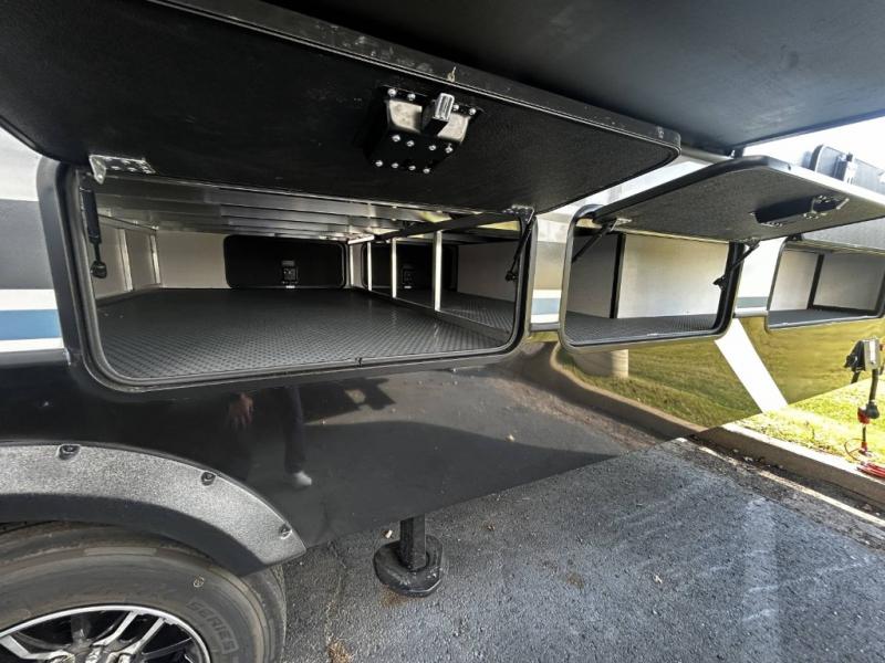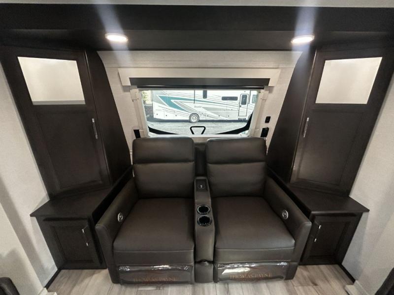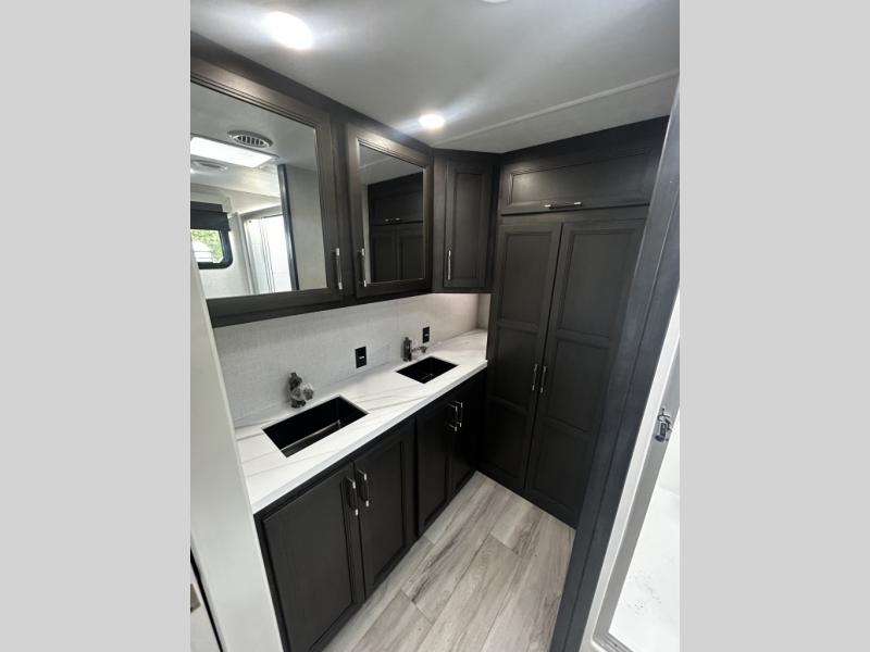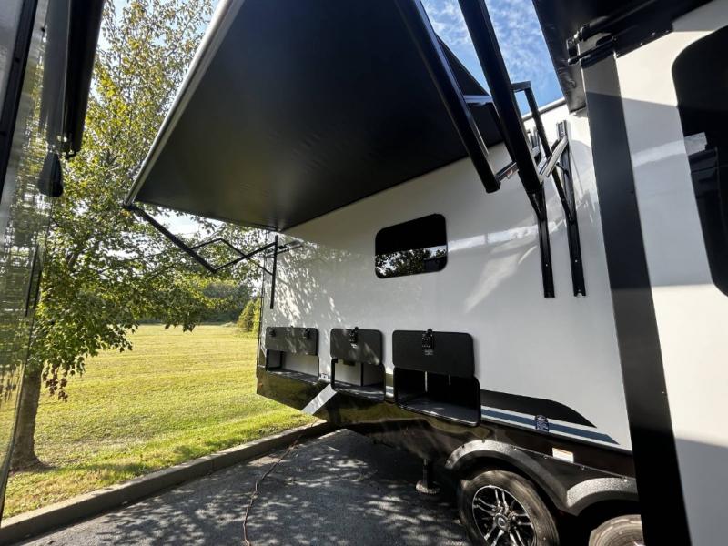 Find the comfort and luxury in this fifth wheel! Imagine your morning coffee on the spacious middle kitchen, and prepping your favorite breakfast on your kitchen island with a sink, making for a good meal-prep zone for endless cooking possibilities. You can start your favorite movie queued up in the living room with dual hide-a-bed sofas and a fireplace that sets the mood for comfort and delight every day. When it is time to unwind, your private rear bedroom welcomes you with a king bed, smart storage, and soft lighting that turns travel into rest, featuring a master bathroom with all you need to freshen up and treat yourself with plenty of storage, a dual sink vanity, and space for a washer/dryer prep for your convenience.
