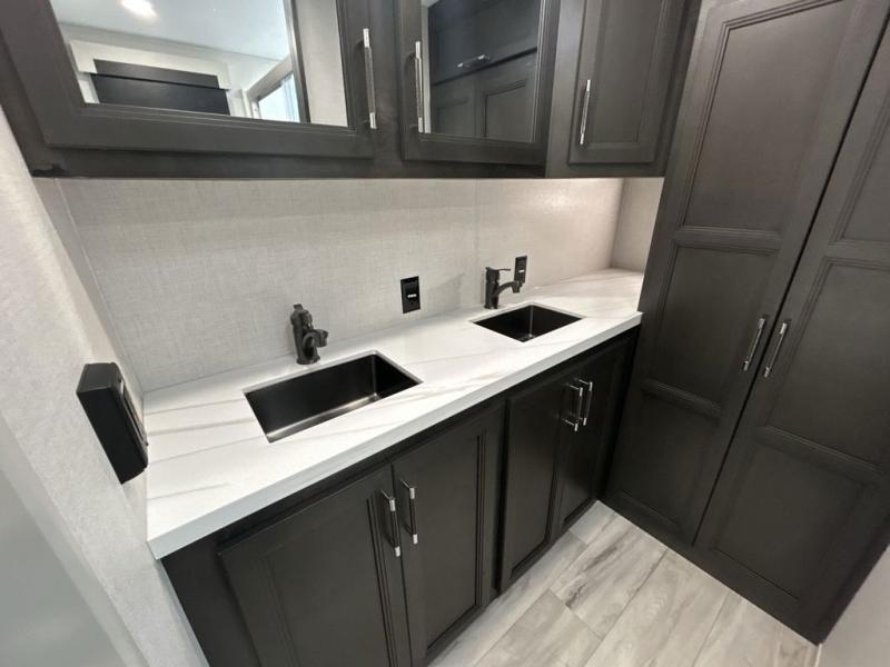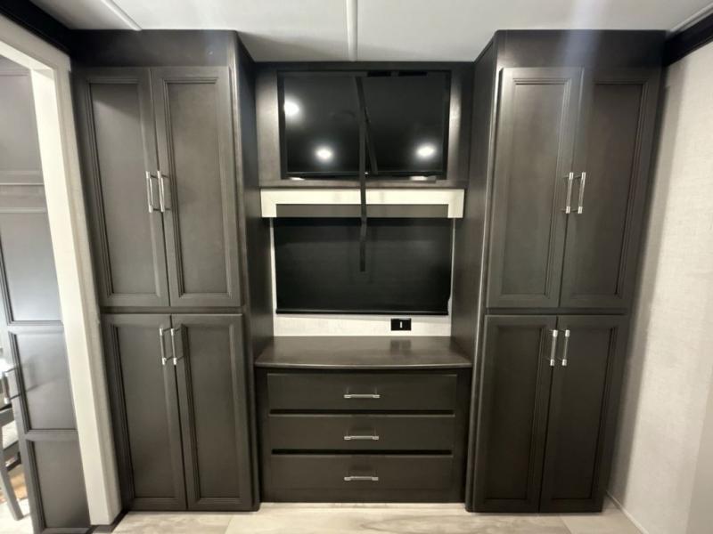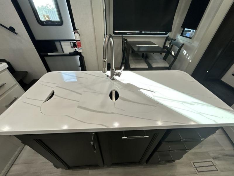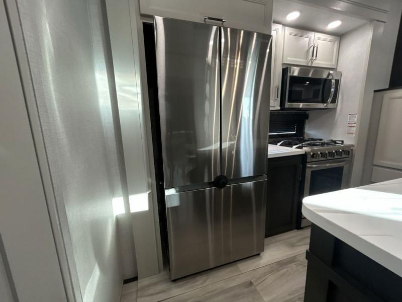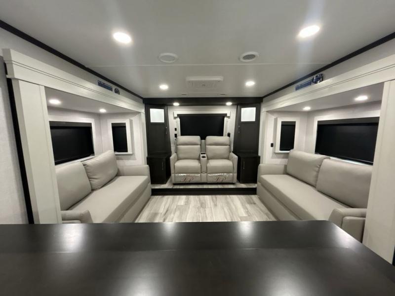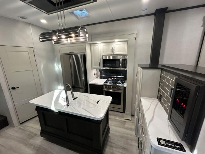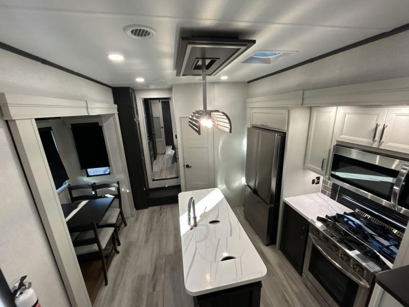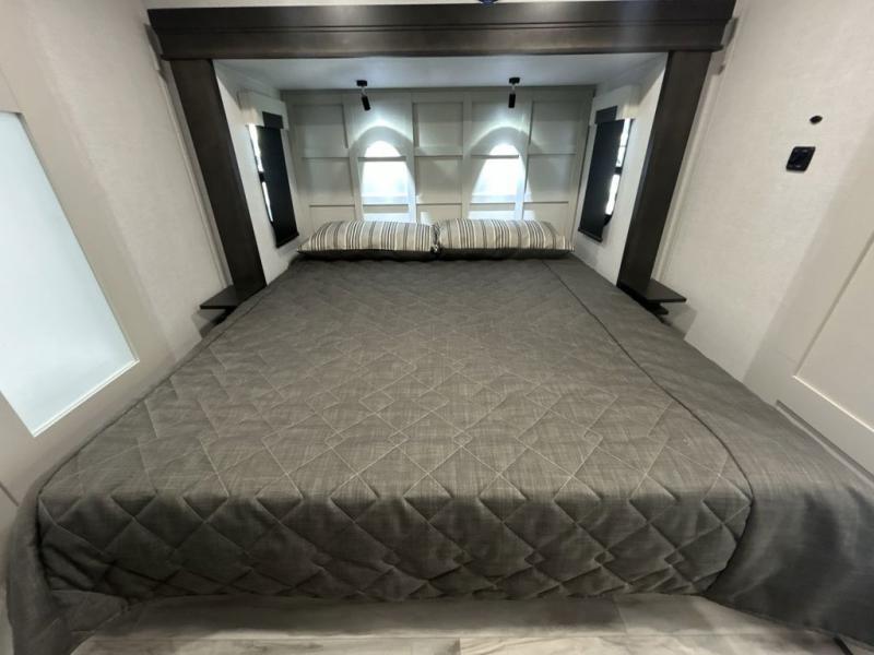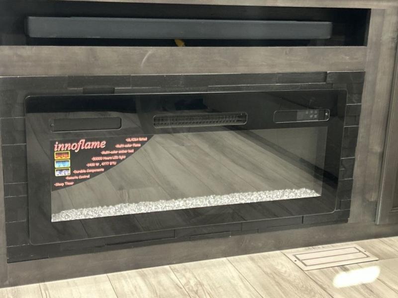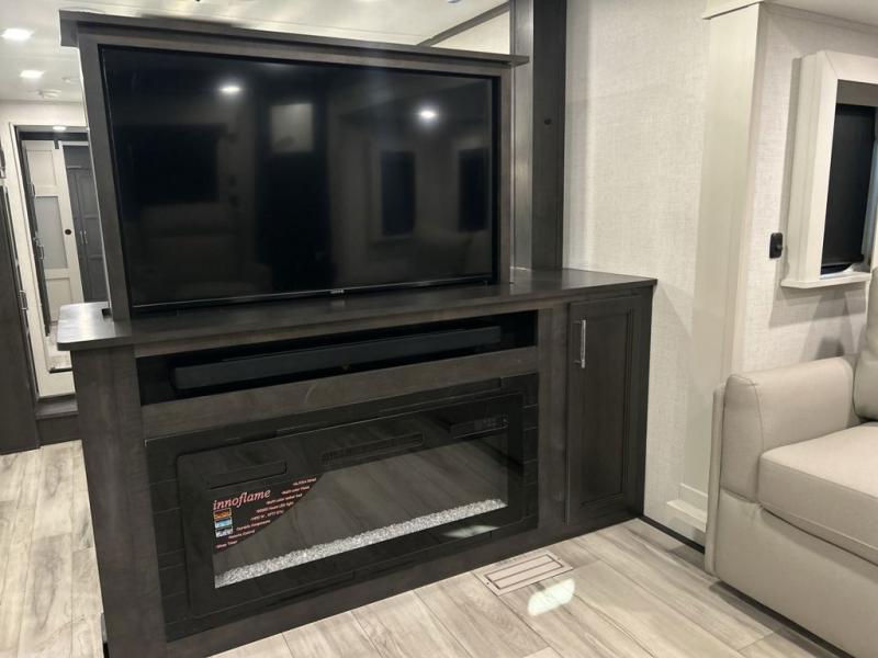 Find the comfort and luxury in this fifth wheel! Imagine your morning coffee on the spacious middle kitchen, and prepping your favorite breakfast on your kitchen island with a sink, making for a good meal-prep zone for endless cooking possibilities. You can start your favorite movie queued up in the living room with dual hide-a-bed sofas and a fireplace that sets the mood for comfort and delight every day. When it is time to unwind, your private rear bedroom welcomes you with a king bed, smart storage, and soft lighting that turns travel into rest, featuring a master bathroom with all you need to freshen up and treat yourself with plenty of storage, a dual sink vanity, and space for a washer/dryer prep for your convenience.