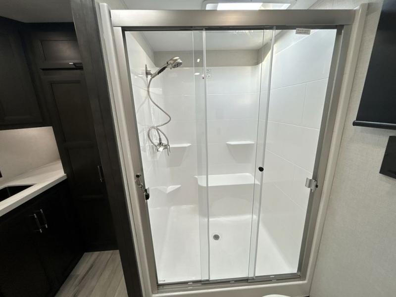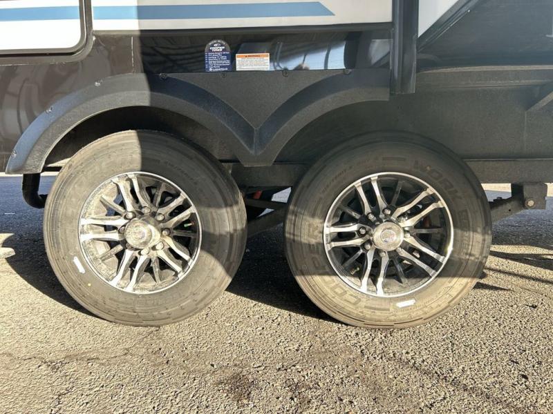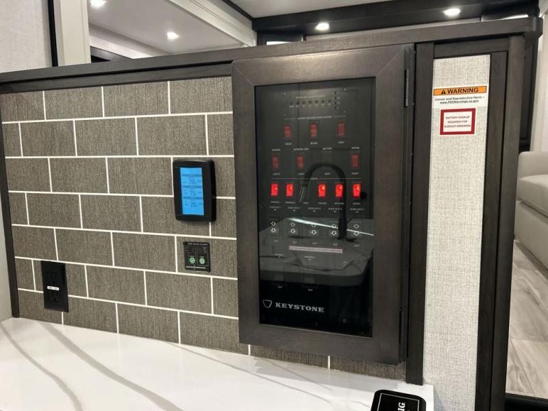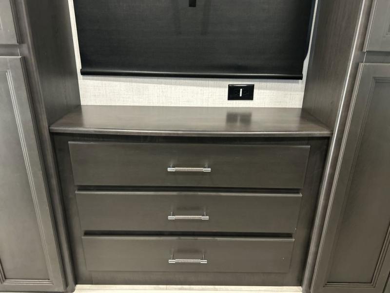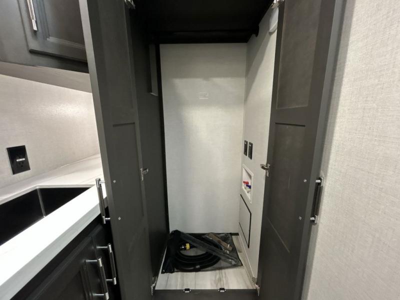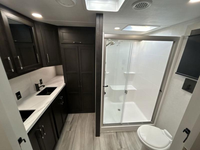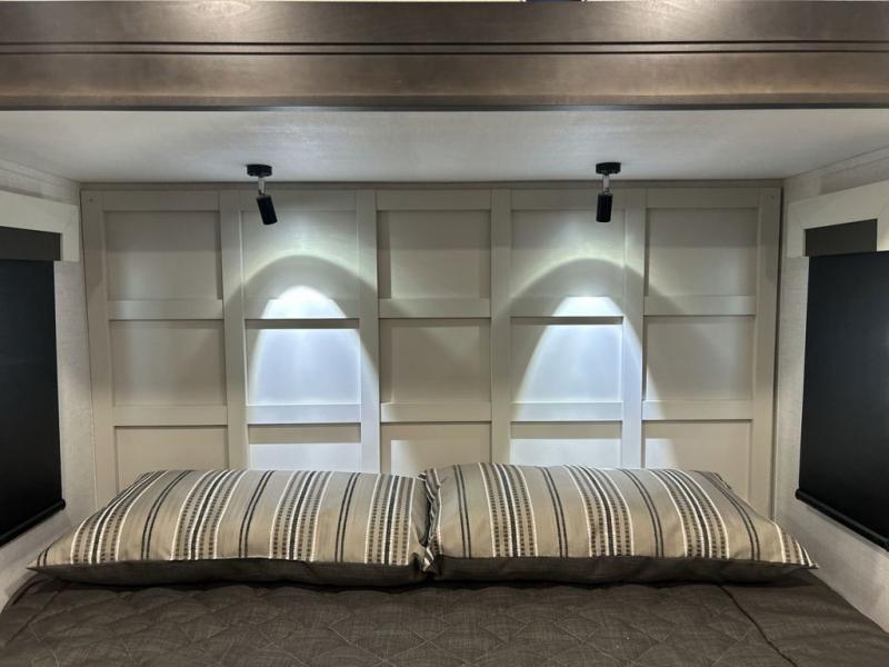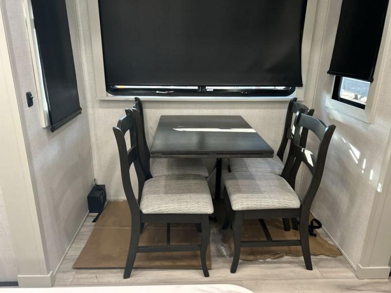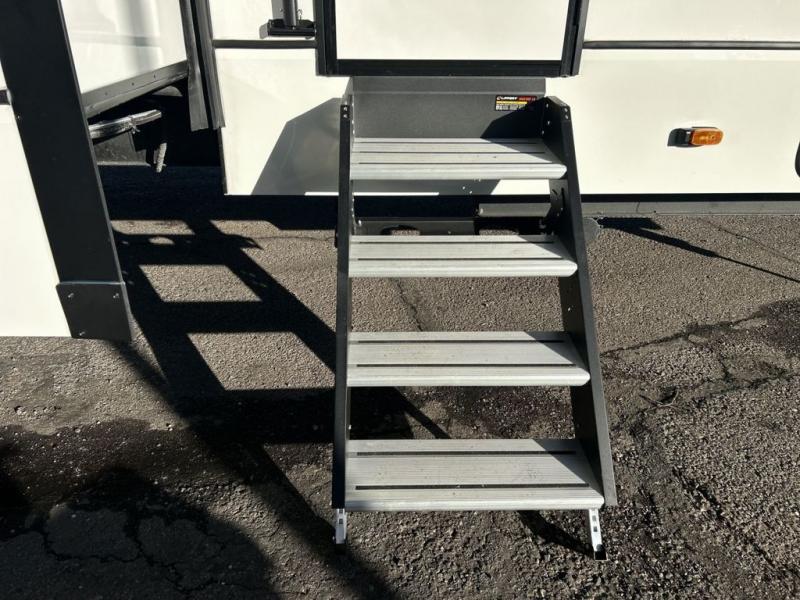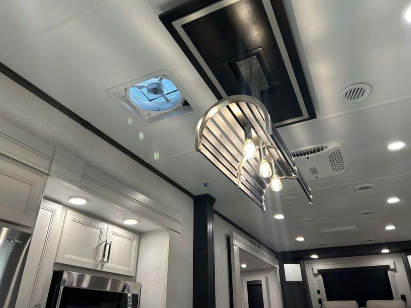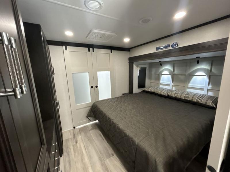 Find the comfort and luxury in this fifth wheel! Imagine your morning coffee on the spacious middle kitchen, and prepping your favorite breakfast on your kitchen island with a sink, making for a good meal-prep zone for endless cooking possibilities. You can start your favorite movie queued up in the living room with dual hide-a-bed sofas and a fireplace that sets the mood for comfort and delight every day. When it is time to unwind, your private rear bedroom welcomes you with a king bed, smart storage, and soft lighting that turns travel into rest, featuring a master bathroom with all you need to freshen up and treat yourself with plenty of storage, a dual sink vanity, and space for a washer/dryer prep for your convenience.