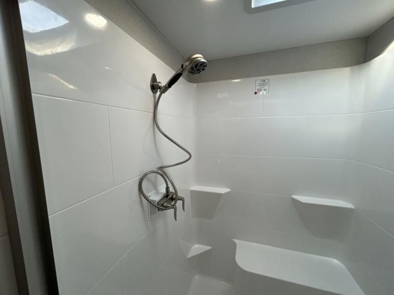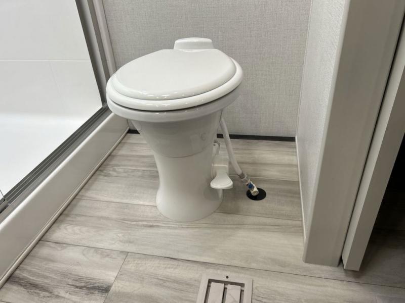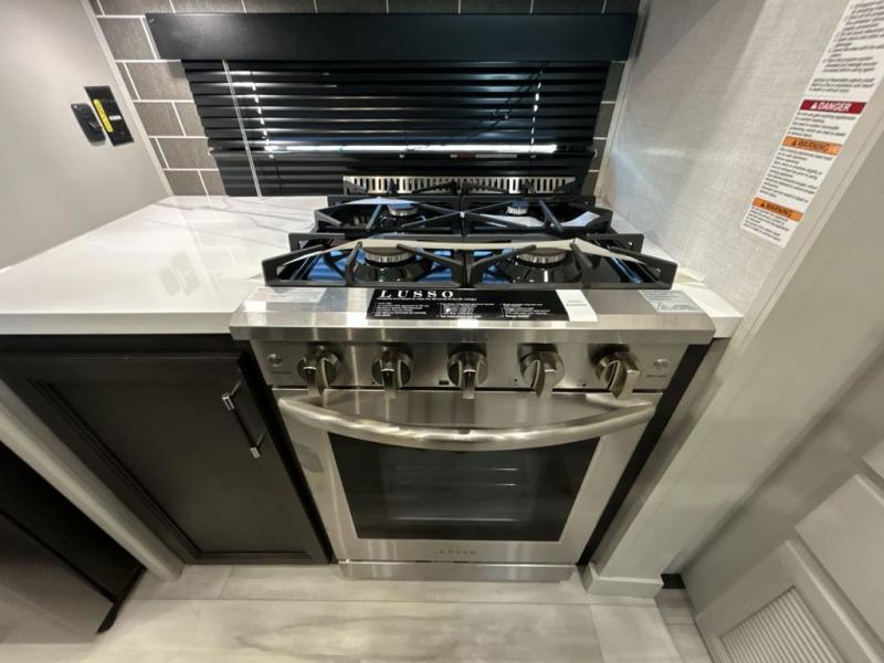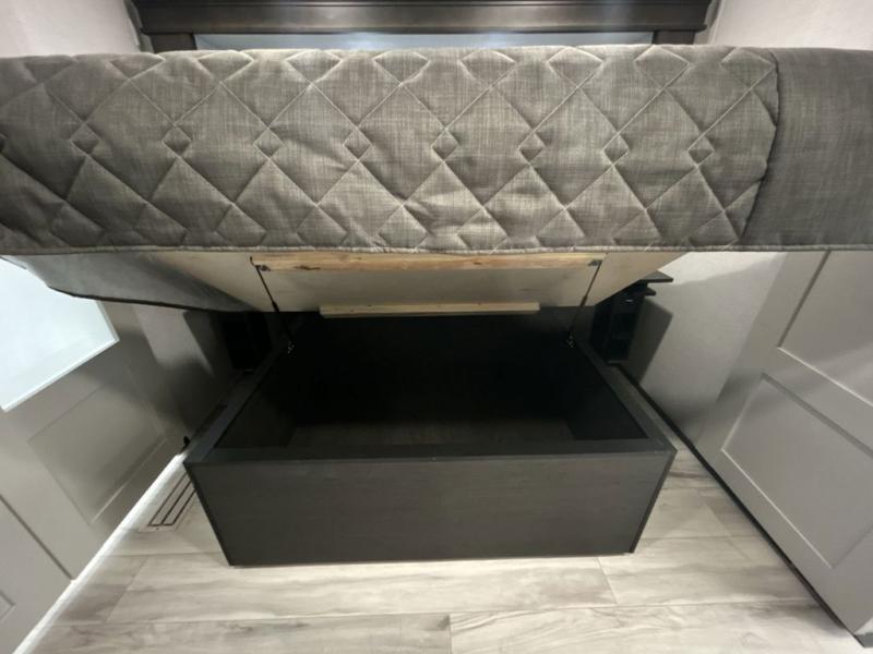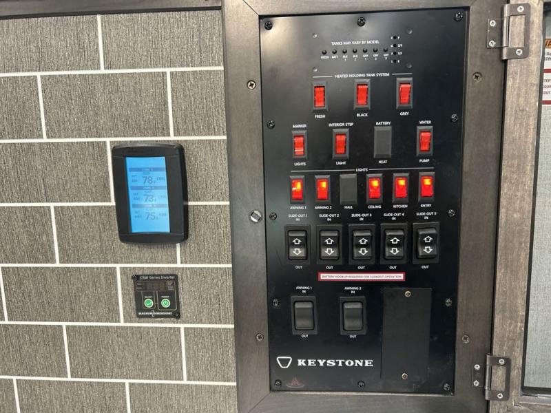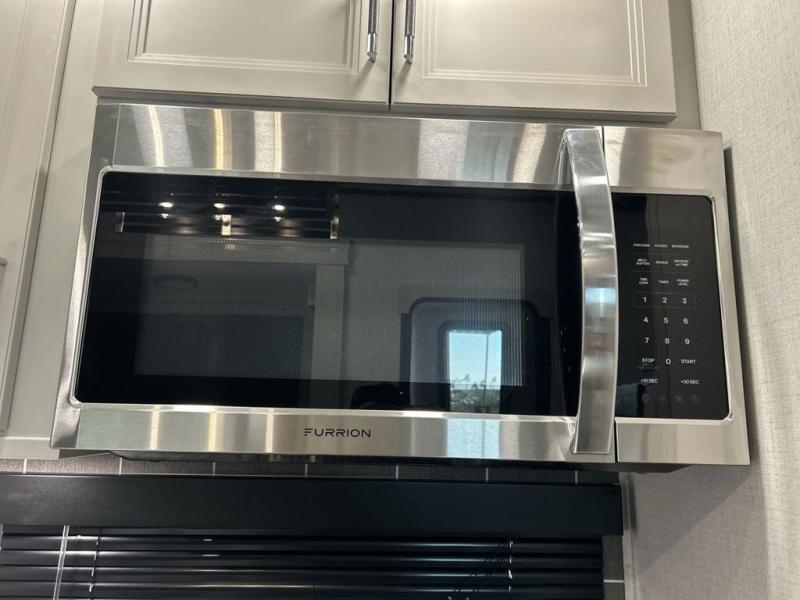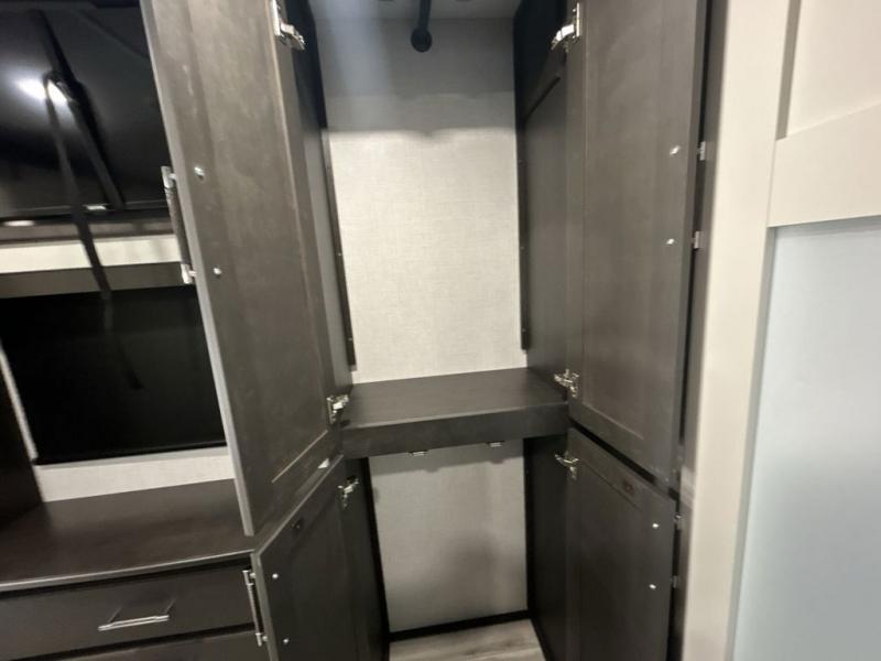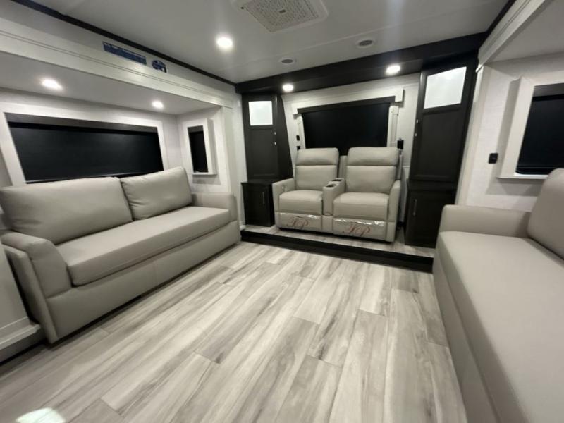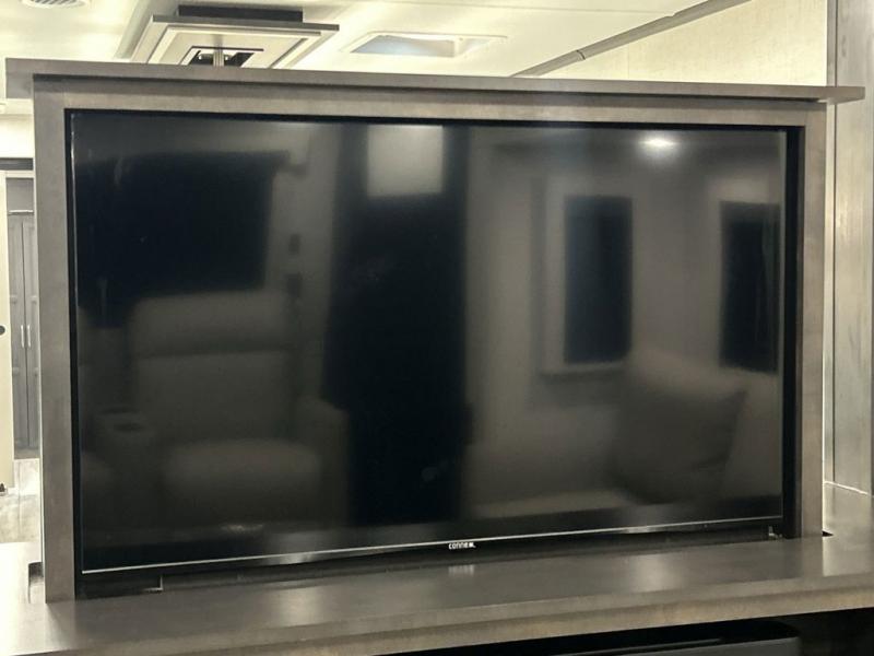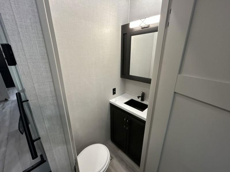 Find the comfort and luxury in this fifth wheel! Imagine your morning coffee on the spacious middle kitchen, and prepping your favorite breakfast on your kitchen island with a sink, making for a good meal-prep zone for endless cooking possibilities. You can start your favorite movie queued up in the living room with dual hide-a-bed sofas and a fireplace that sets the mood for comfort and delight every day. When it is time to unwind, your private rear bedroom welcomes you with a king bed, smart storage, and soft lighting that turns travel into rest, featuring a master bathroom with all you need to freshen up and treat yourself with plenty of storage, a dual sink vanity, and space for a washer/dryer prep for your convenience.