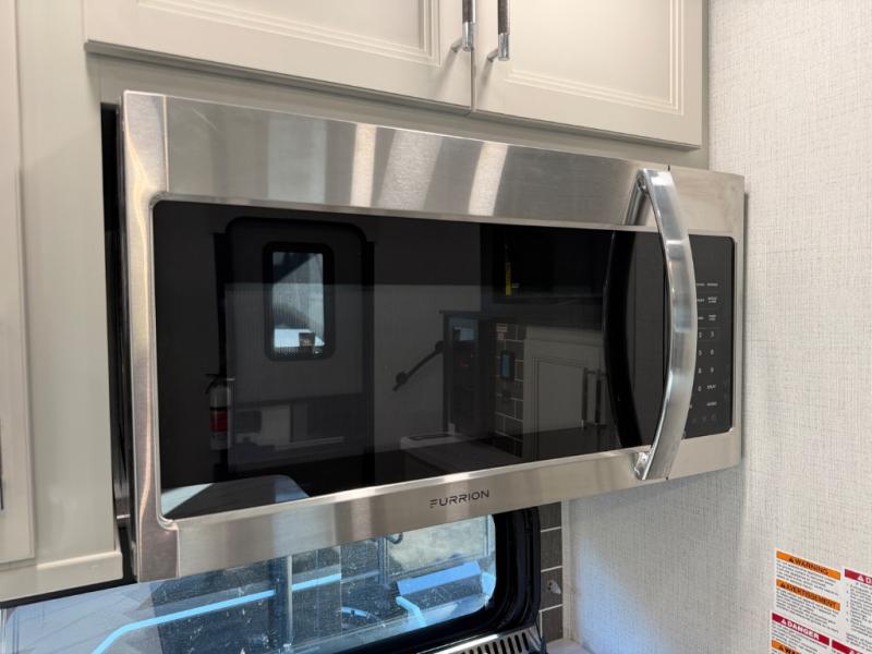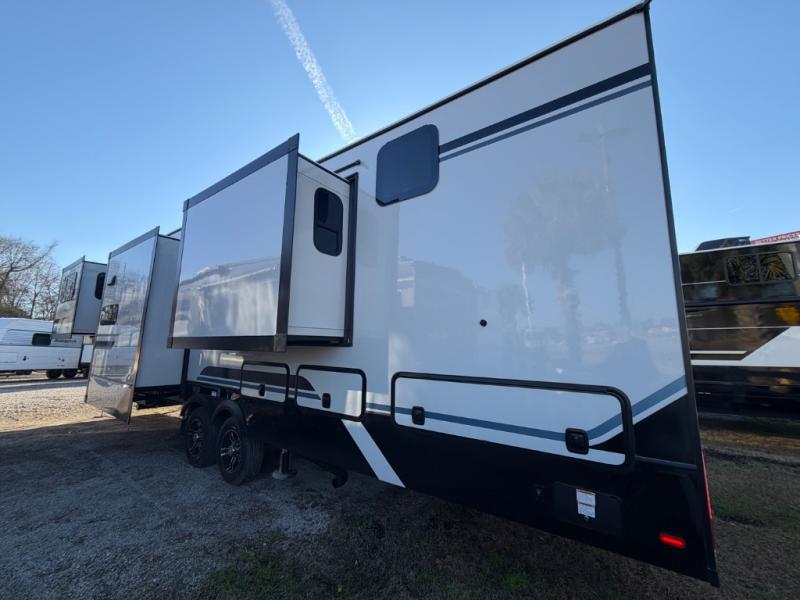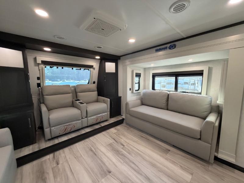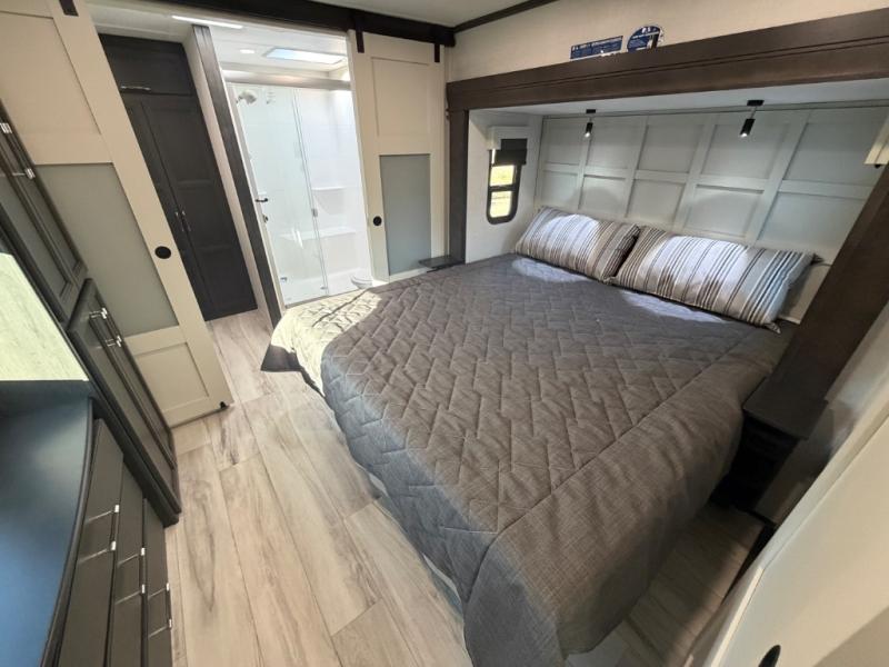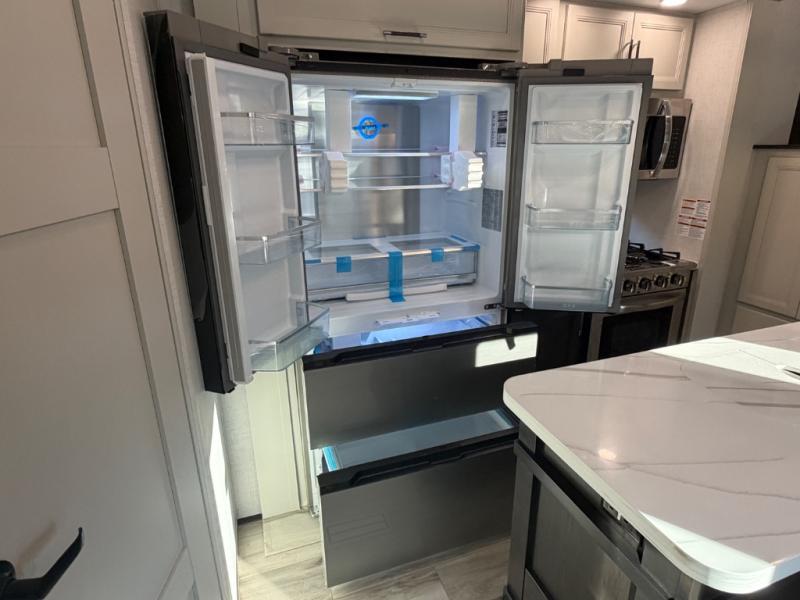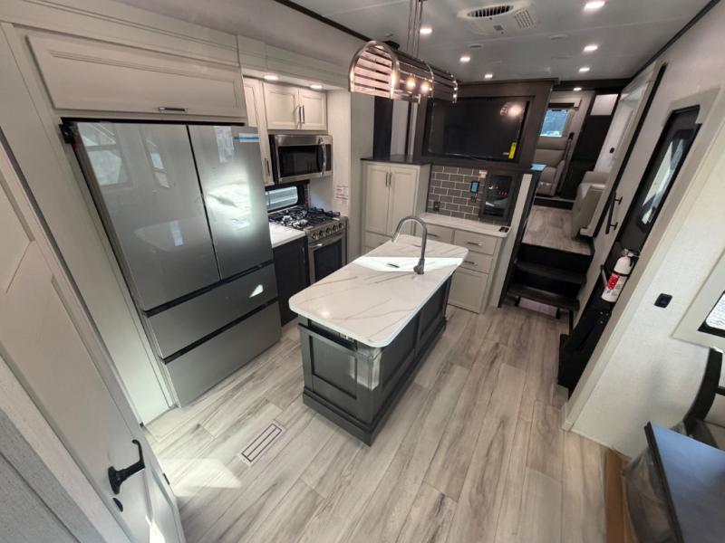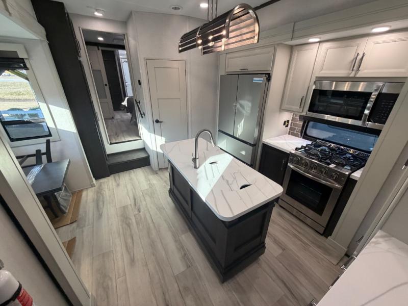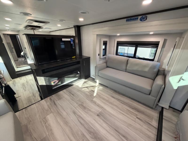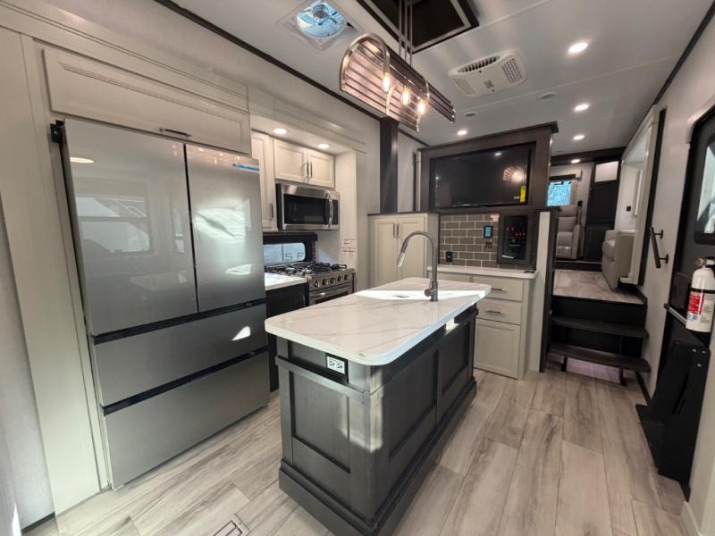 Find the comfort and luxury in this fifth wheel! Imagine your morning coffee on the spacious middle kitchen, and prepping your favorite breakfast on your kitchen island with a sink, making for a good meal-prep zone for endless cooking possibilities. You can start your favorite movie queued up in the living room with dual hide-a-bed sofas and a fireplace that sets the mood for comfort and delight every day. When it is time to unwind, your private rear bedroom welcomes you with a king bed, smart storage, and soft lighting that turns travel into rest, featuring a master bathroom with all you need to freshen up and treat yourself with plenty of storage, a dual sink vanity, and space for a washer/dryer prep for your convenience.