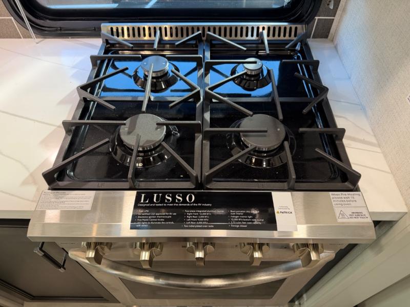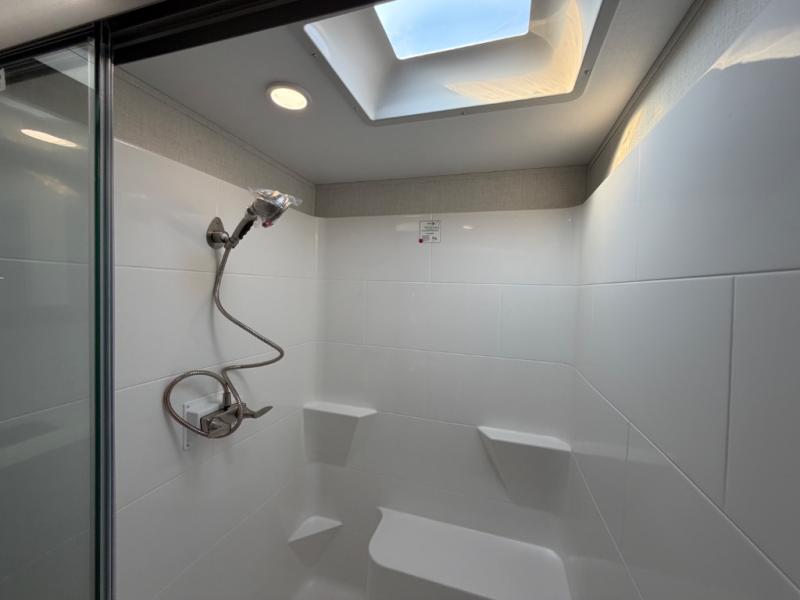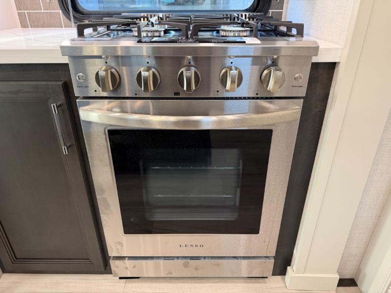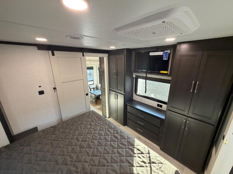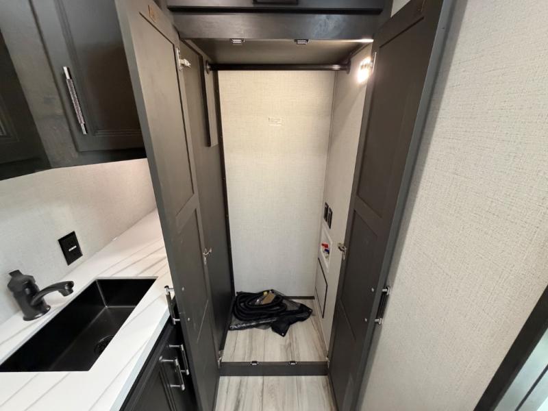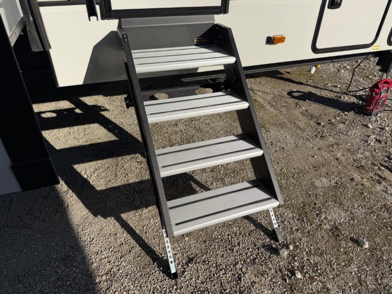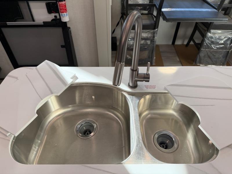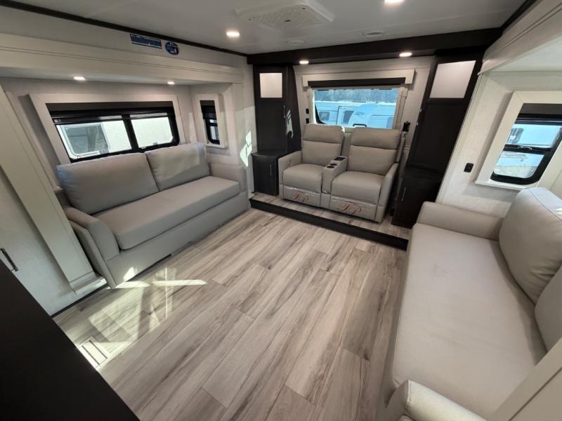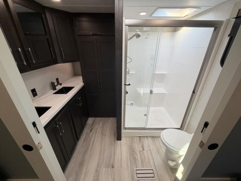 Find the comfort and luxury in this fifth wheel! Imagine your morning coffee on the spacious middle kitchen, and prepping your favorite breakfast on your kitchen island with a sink, making for a good meal-prep zone for endless cooking possibilities. You can start your favorite movie queued up in the living room with dual hide-a-bed sofas and a fireplace that sets the mood for comfort and delight every day. When it is time to unwind, your private rear bedroom welcomes you with a king bed, smart storage, and soft lighting that turns travel into rest, featuring a master bathroom with all you need to freshen up and treat yourself with plenty of storage, a dual sink vanity, and space for a washer/dryer prep for your convenience.