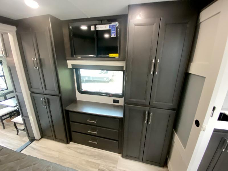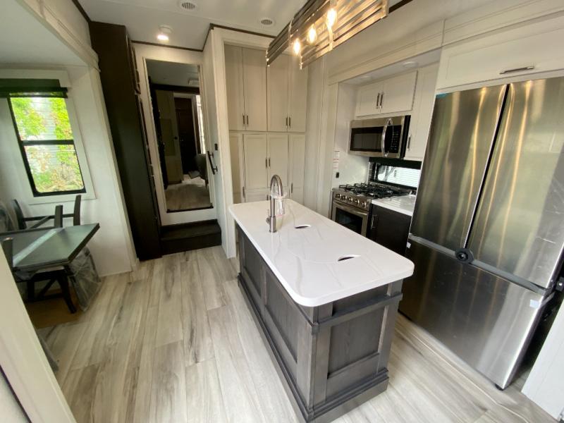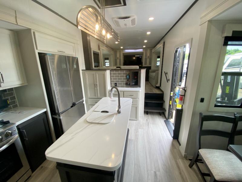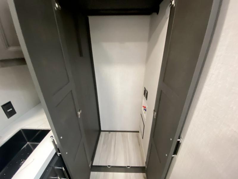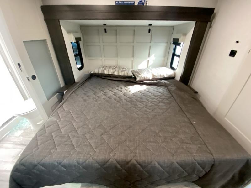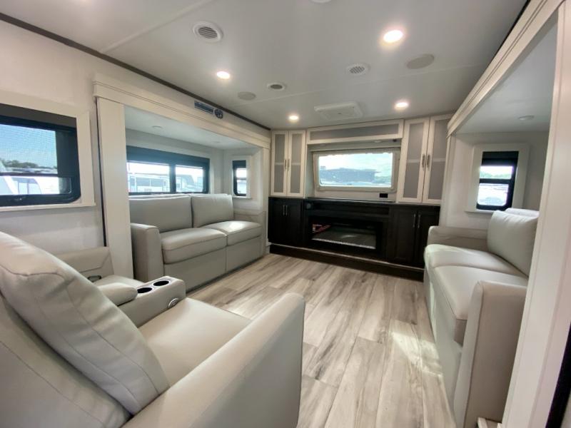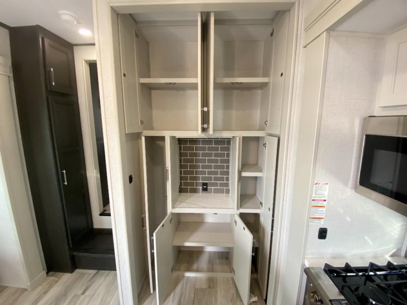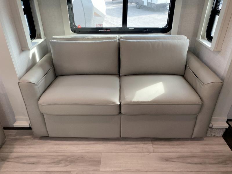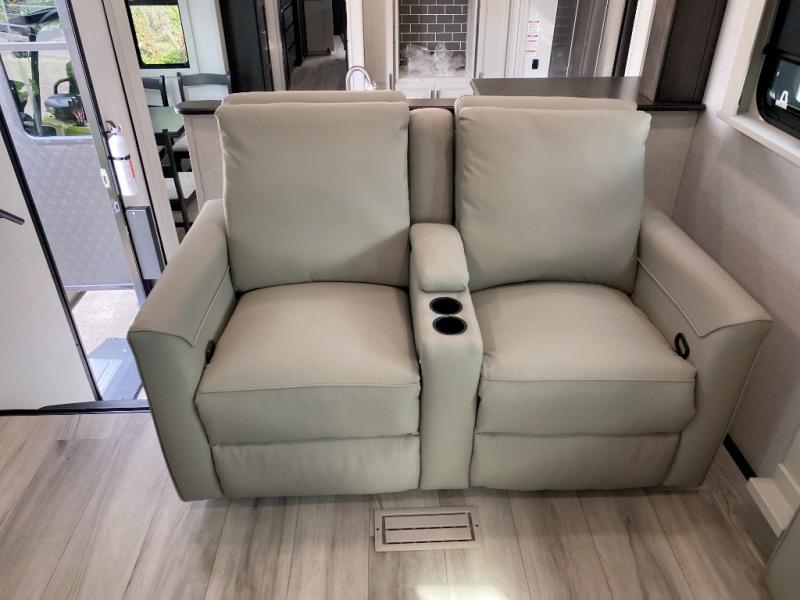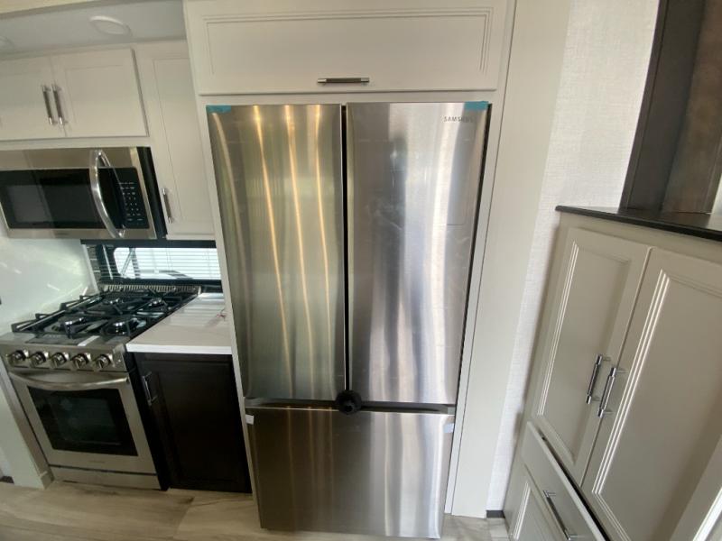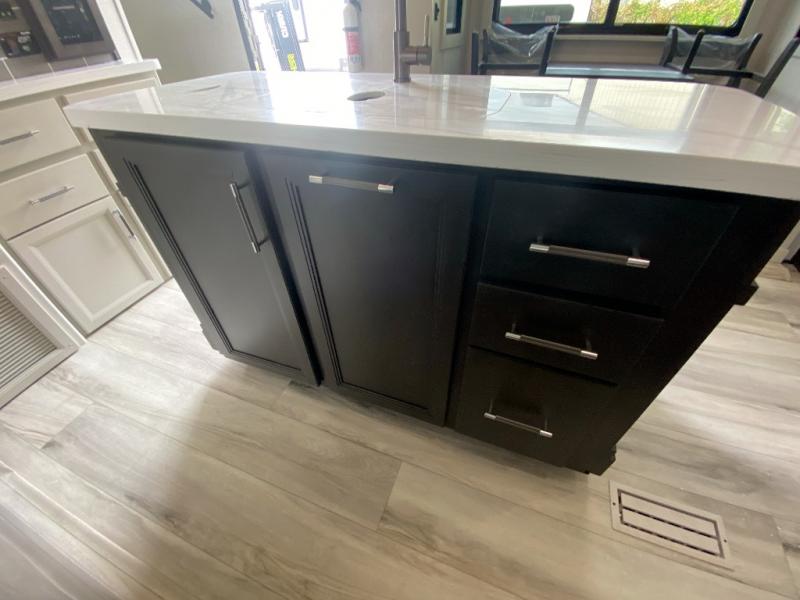 This fifth wheel is decked out in luxuries! The full rear bathroom has a walk-in shower to freshen up in each morning, a dual sink vanity for two to get ready at once, and an area prepped to add an optional washer and dryer. You will enjoy a good night's rest on the king bed slide inside the private bedroom and others can sleep on the opposing tri-fold sofa sleeper slides once they are converted. There are two kitchen pantries to hold everyone's favorite snacks, one of which is a walk-in pantry. The 18 cu. ft. residential refrigerator will keep your perishables fresh and you also have the option to switch it out for a 20 cu. ft. 12V refrigerator instead. The front living area has a front entertainment center with a 40" fireplace and a 50" TV, plus there is Thomas Payne theater seating with massage, heat, LED lights, and a USB charging station to keep your electronics charged while you relax!