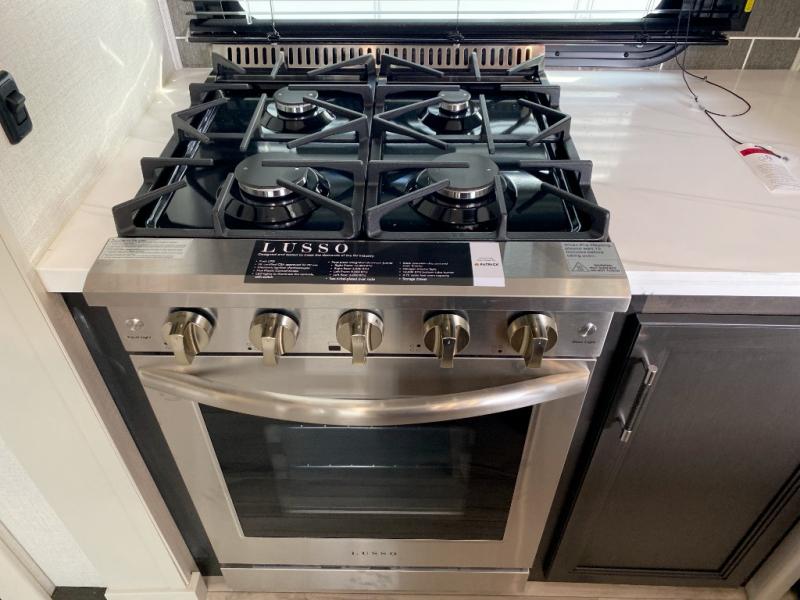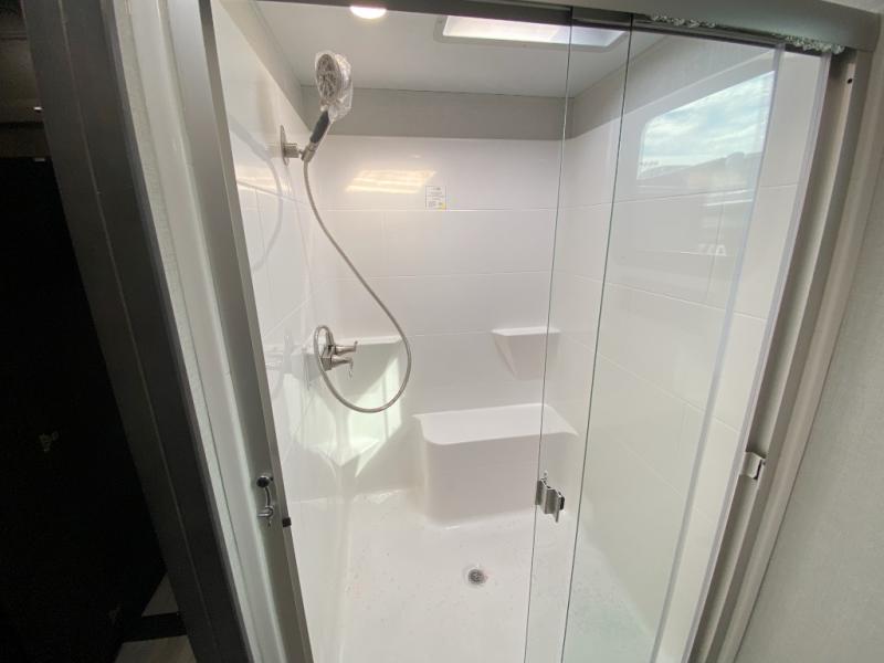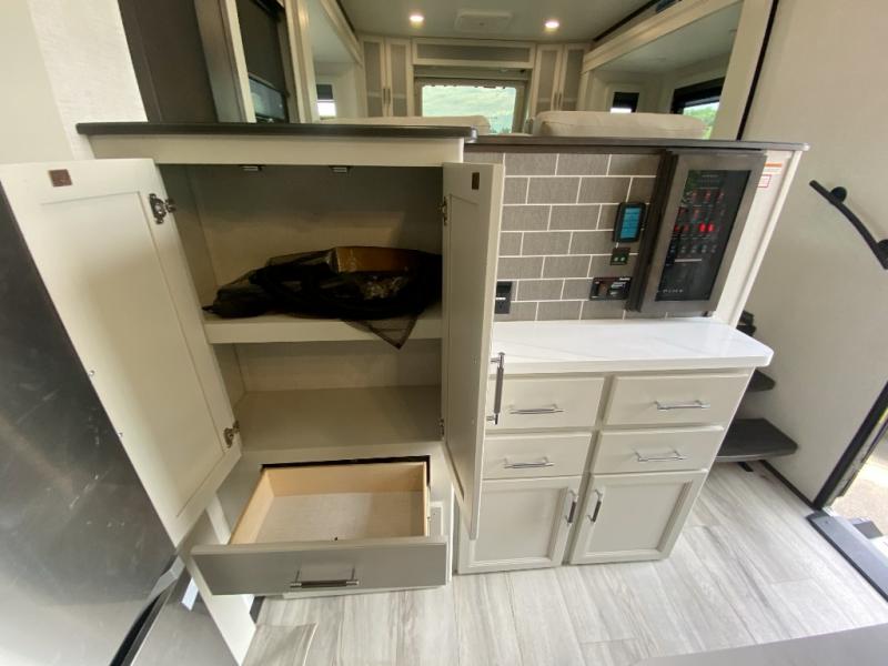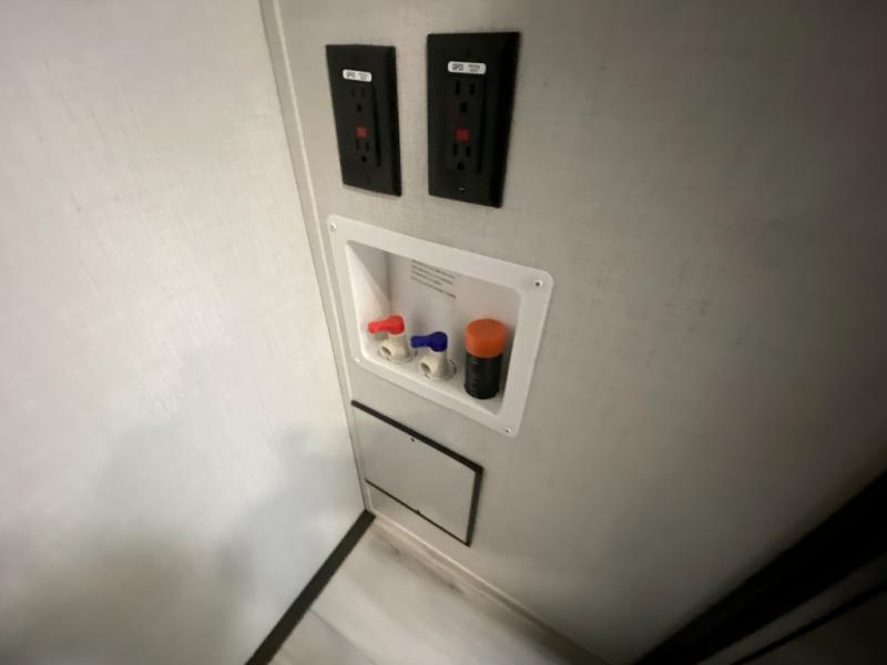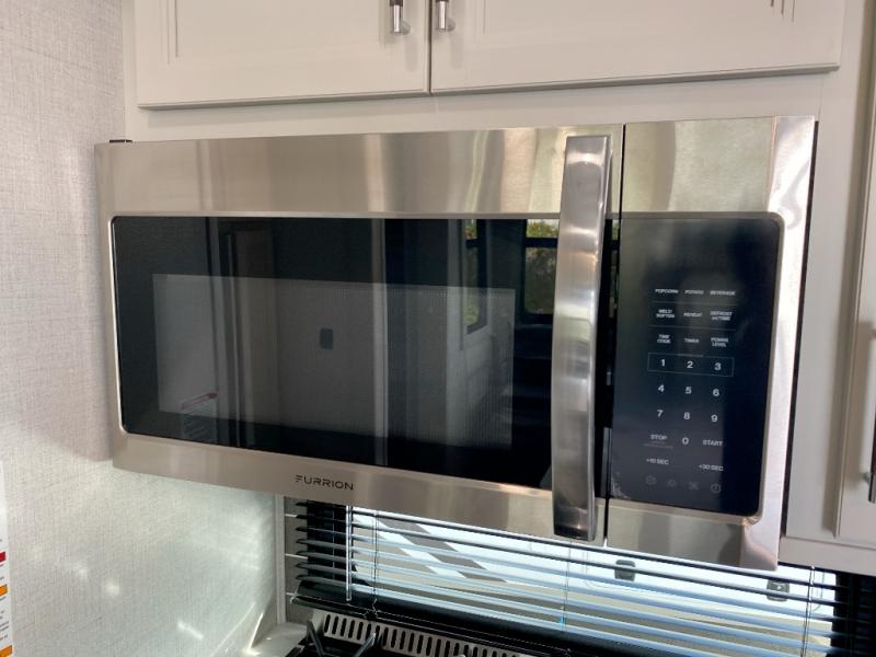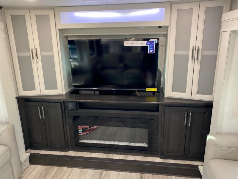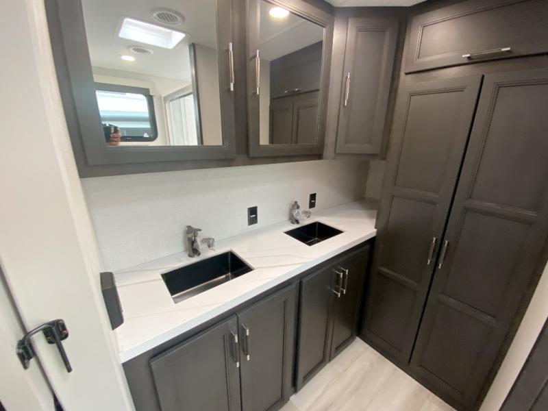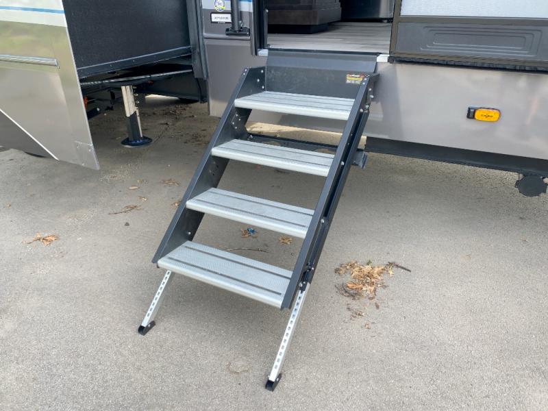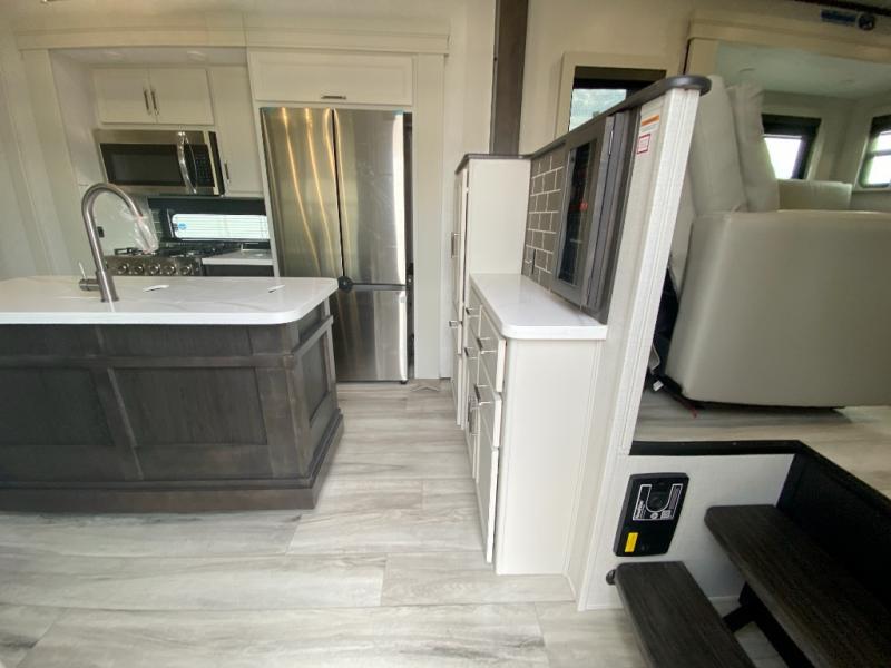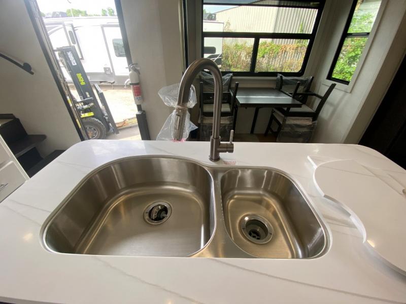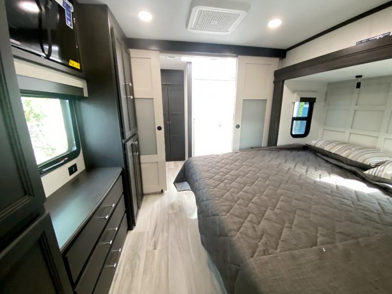 This fifth wheel is decked out in luxuries! The full rear bathroom has a walk-in shower to freshen up in each morning, a dual sink vanity for two to get ready at once, and an area prepped to add an optional washer and dryer. You will enjoy a good night's rest on the king bed slide inside the private bedroom and others can sleep on the opposing tri-fold sofa sleeper slides once they are converted. There are two kitchen pantries to hold everyone's favorite snacks, one of which is a walk-in pantry. The 18 cu. ft. residential refrigerator will keep your perishables fresh and you also have the option to switch it out for a 20 cu. ft. 12V refrigerator instead. The front living area has a front entertainment center with a 40" fireplace and a 50" TV, plus there is Thomas Payne theater seating with massage, heat, LED lights, and a USB charging station to keep your electronics charged while you relax!