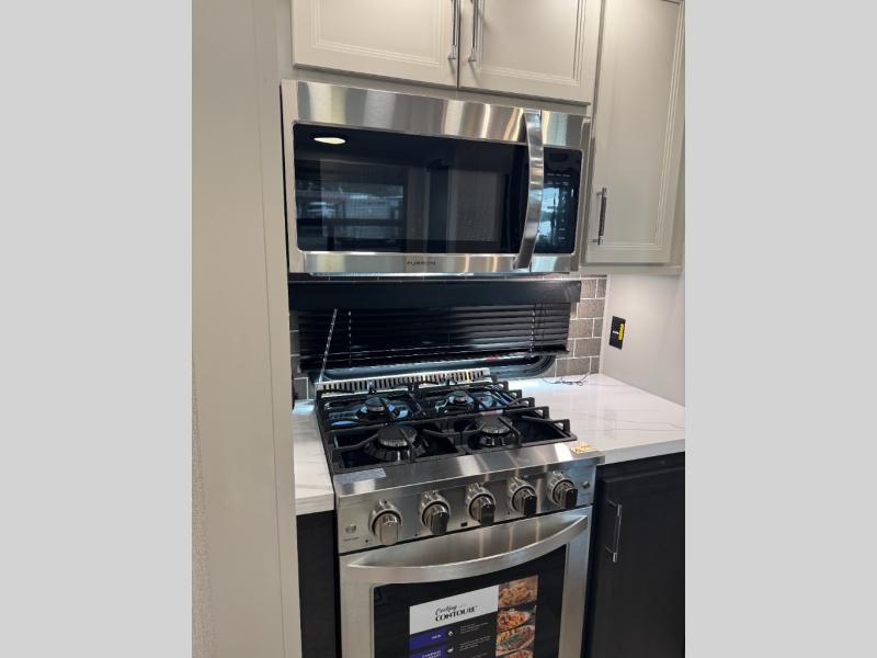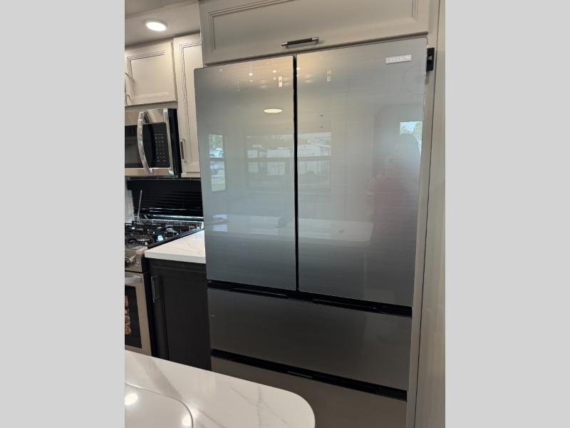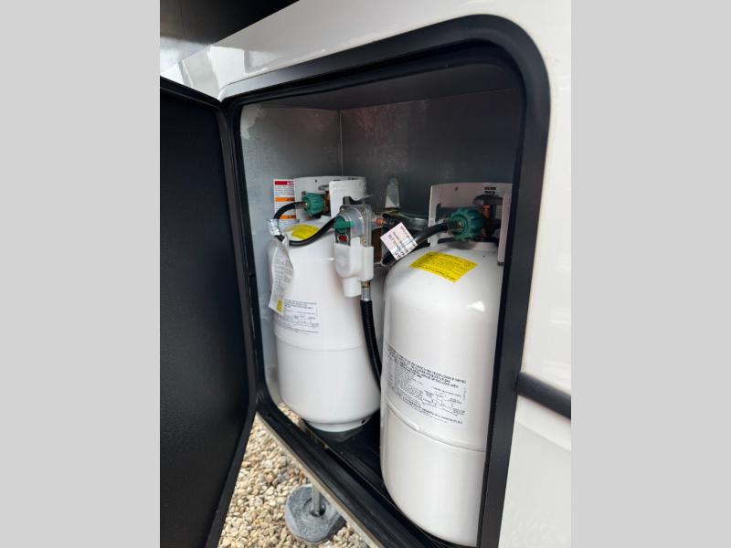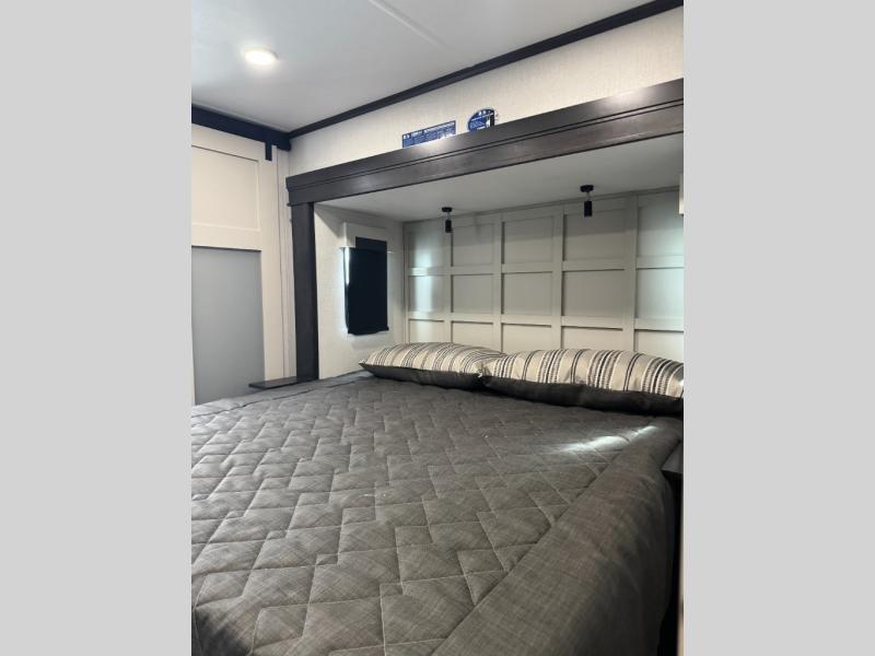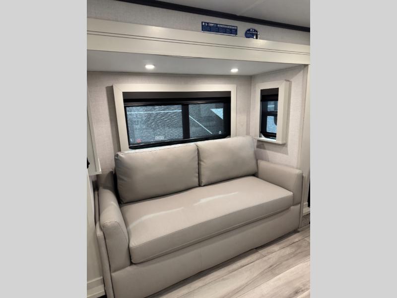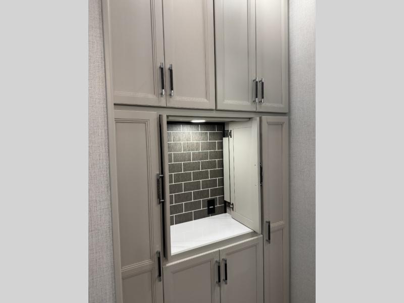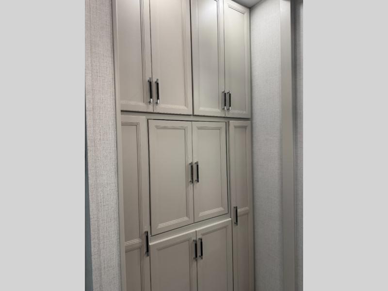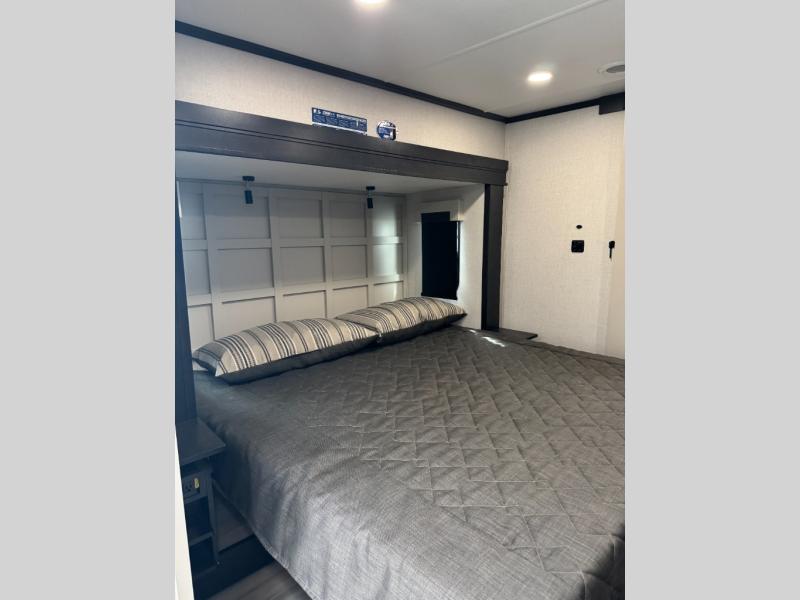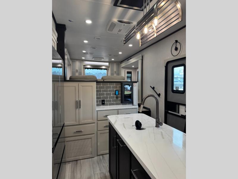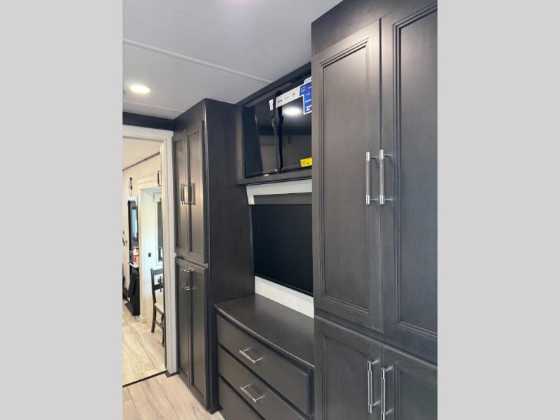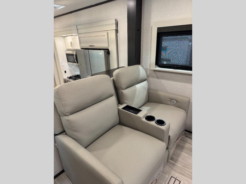 This fifth wheel is decked out in luxuries! The full rear bathroom has a walk-in shower to freshen up in each morning, a dual sink vanity for two to get ready at once, and an area prepped to add an optional washer and dryer. You will enjoy a good night's rest on the king bed slide inside the private bedroom and others can sleep on the opposing tri-fold sofa sleeper slides once they are converted. There are two kitchen pantries to hold everyone's favorite snacks, one of which is a walk-in pantry. The 18 cu. ft. residential refrigerator will keep your perishables fresh and you also have the option to switch it out for a 19.6 cu. ft. 12V refrigerator instead. The front living area has a front entertainment center with a 40" fireplace and a 50" TV, plus there is Thomas Payne theater seating with massage, heat, LED lights, and a USB charging station to keep your electronics charged while you relax!