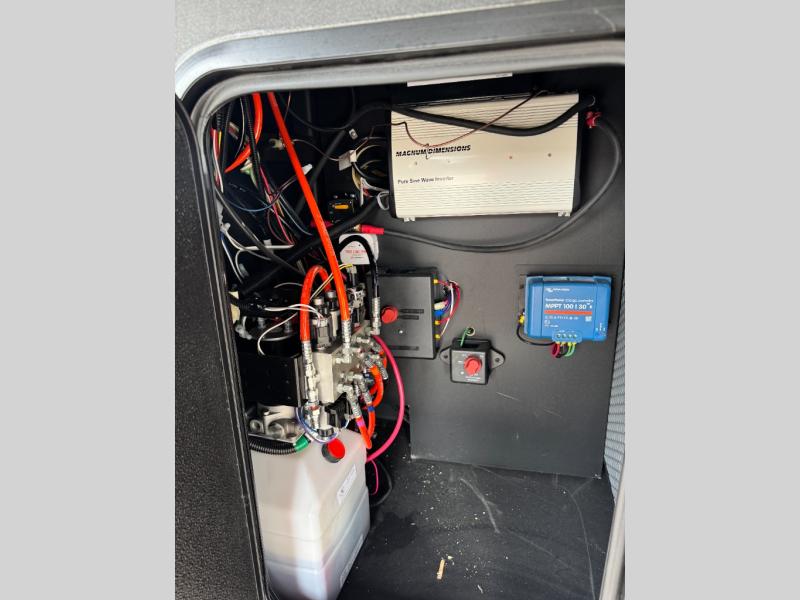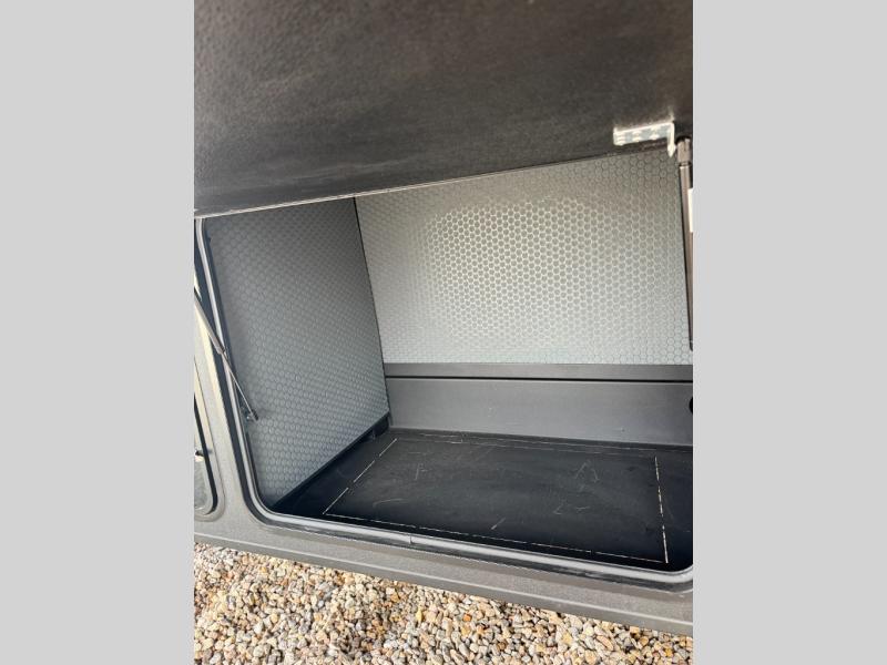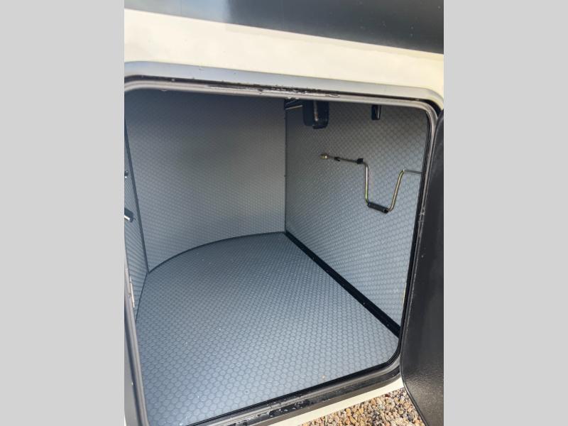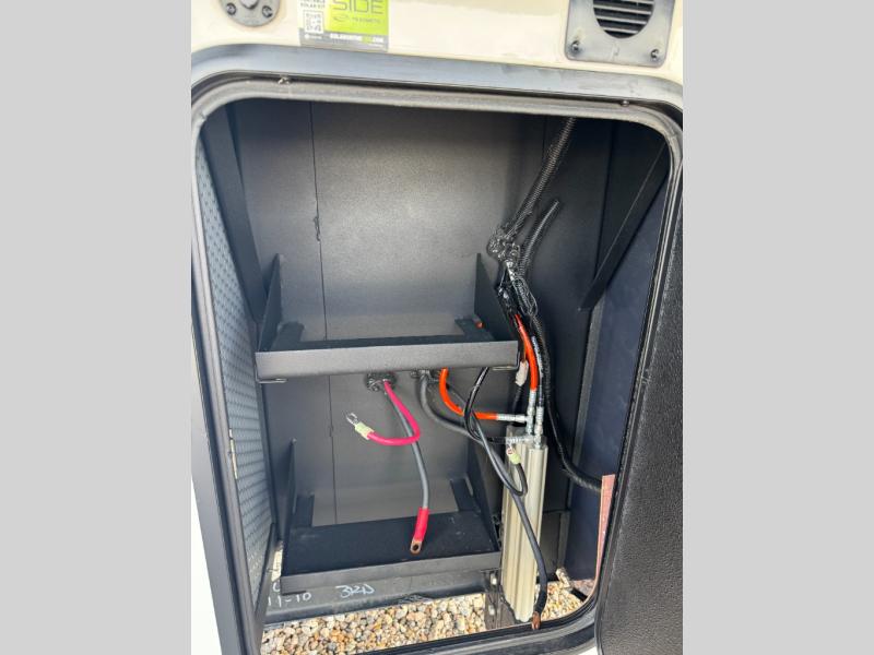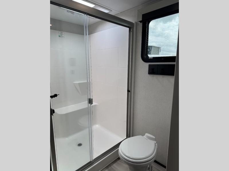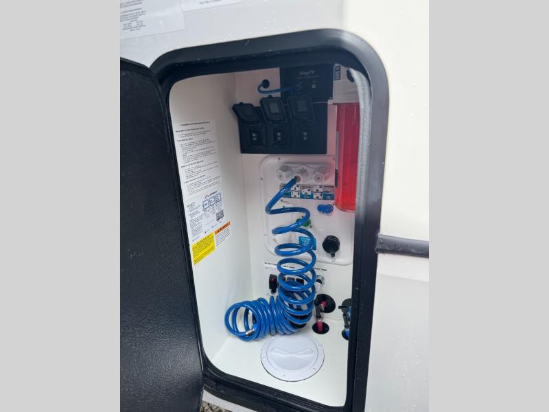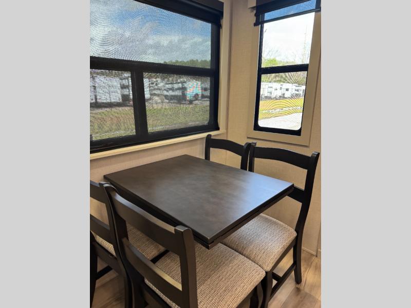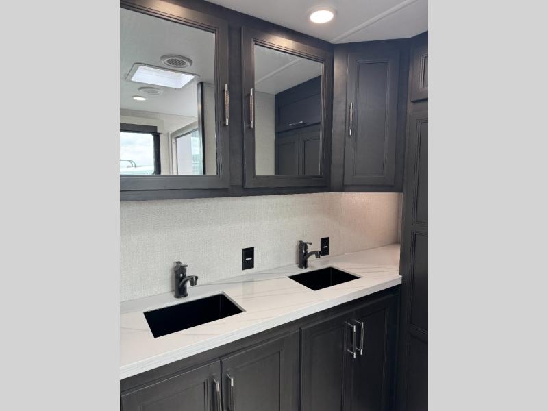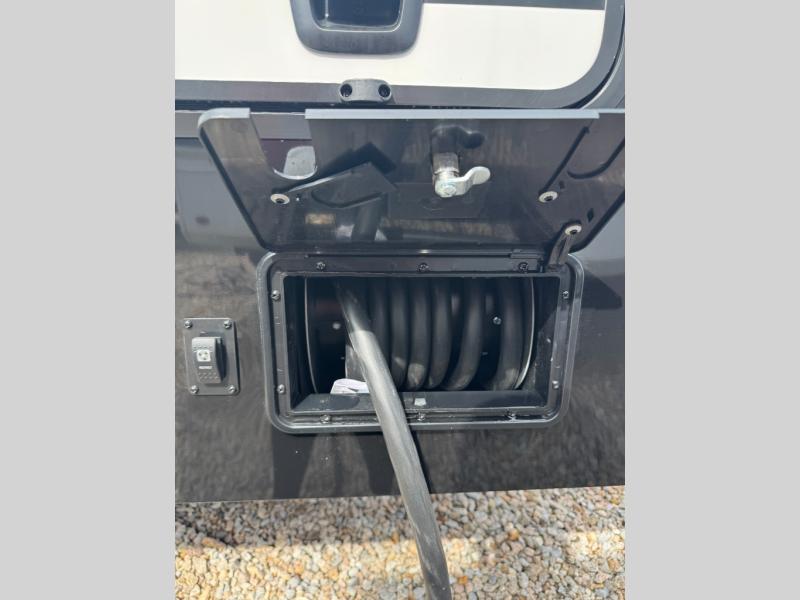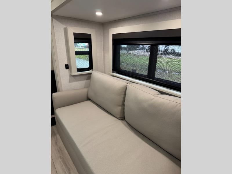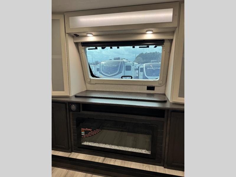 This fifth wheel is decked out in luxuries! The full rear bathroom has a walk-in shower to freshen up in each morning, a dual sink vanity for two to get ready at once, and an area prepped to add an optional washer and dryer. You will enjoy a good night's rest on the king bed slide inside the private bedroom and others can sleep on the opposing tri-fold sofa sleeper slides once they are converted. There are two kitchen pantries to hold everyone's favorite snacks, one of which is a walk-in pantry. The 18 cu. ft. residential refrigerator will keep your perishables fresh and you also have the option to switch it out for a 19.6 cu. ft. 12V refrigerator instead. The front living area has a front entertainment center with a 40" fireplace and a 50" TV, plus there is Thomas Payne theater seating with massage, heat, LED lights, and a USB charging station to keep your electronics charged while you relax!